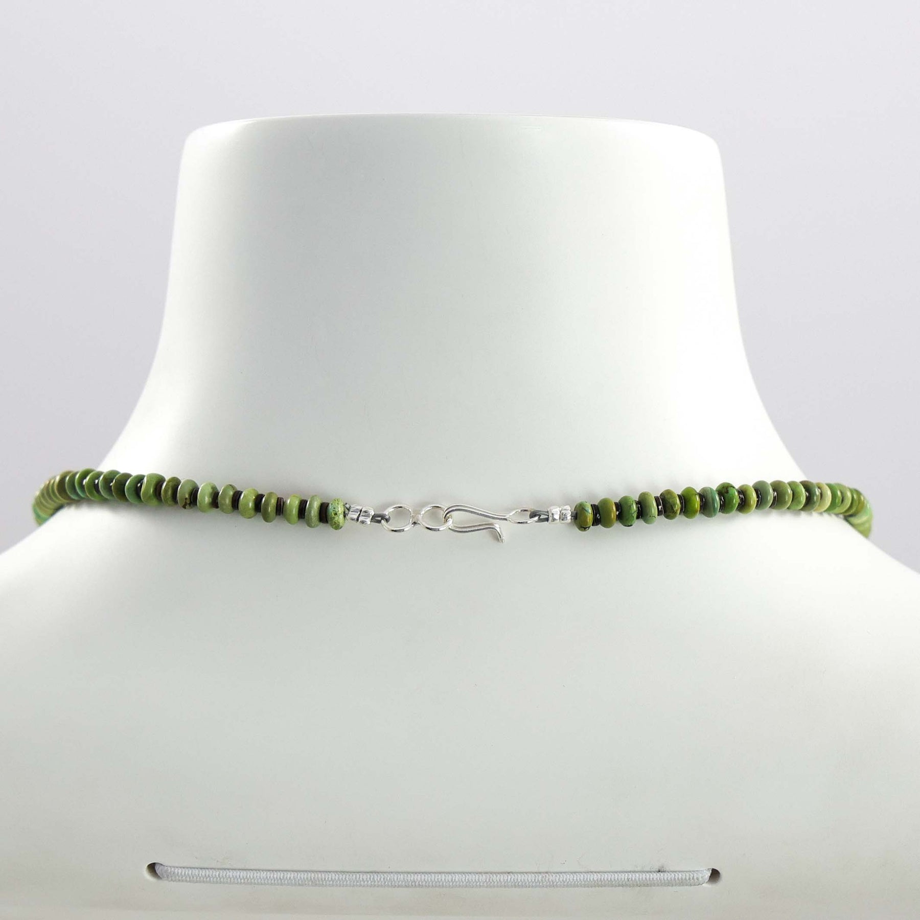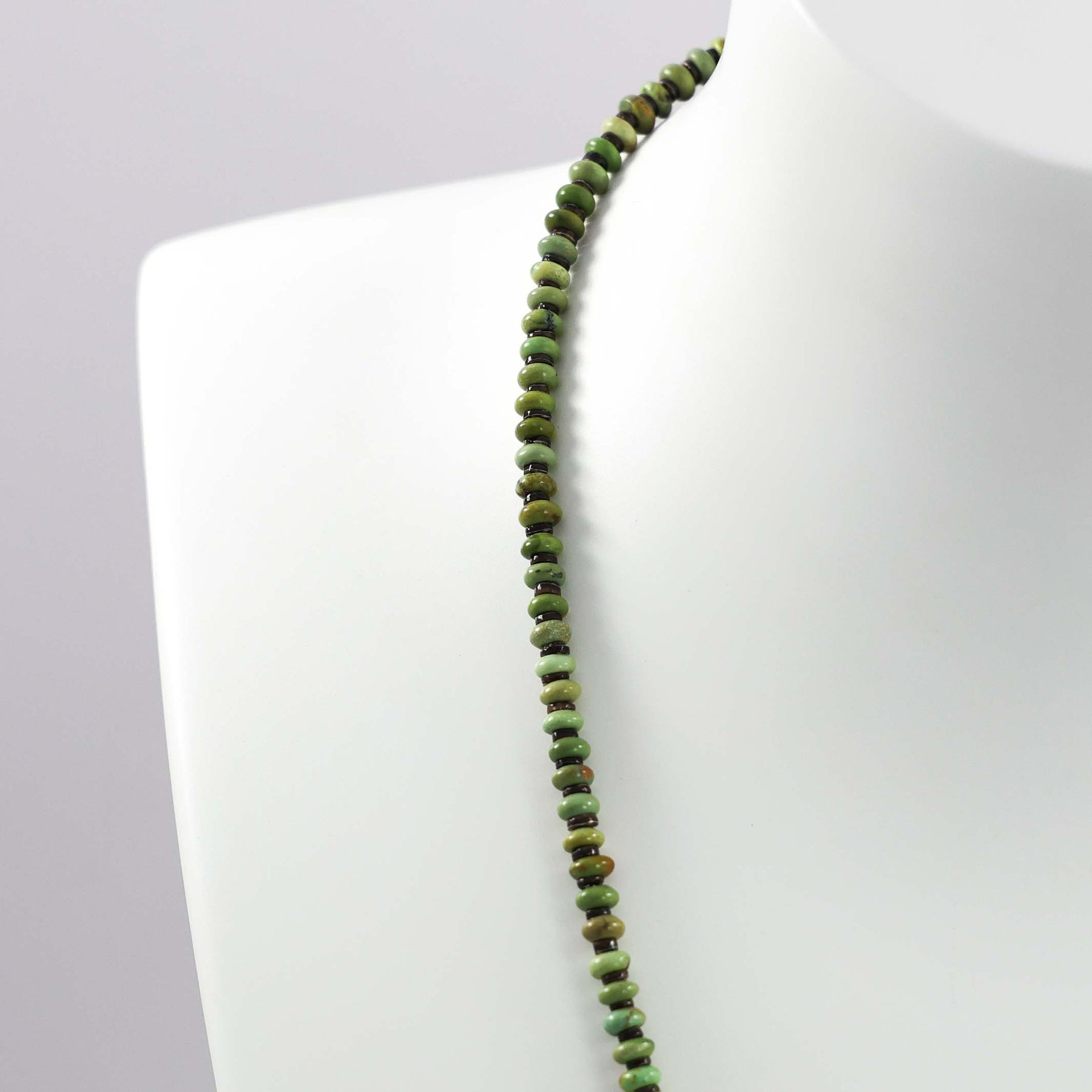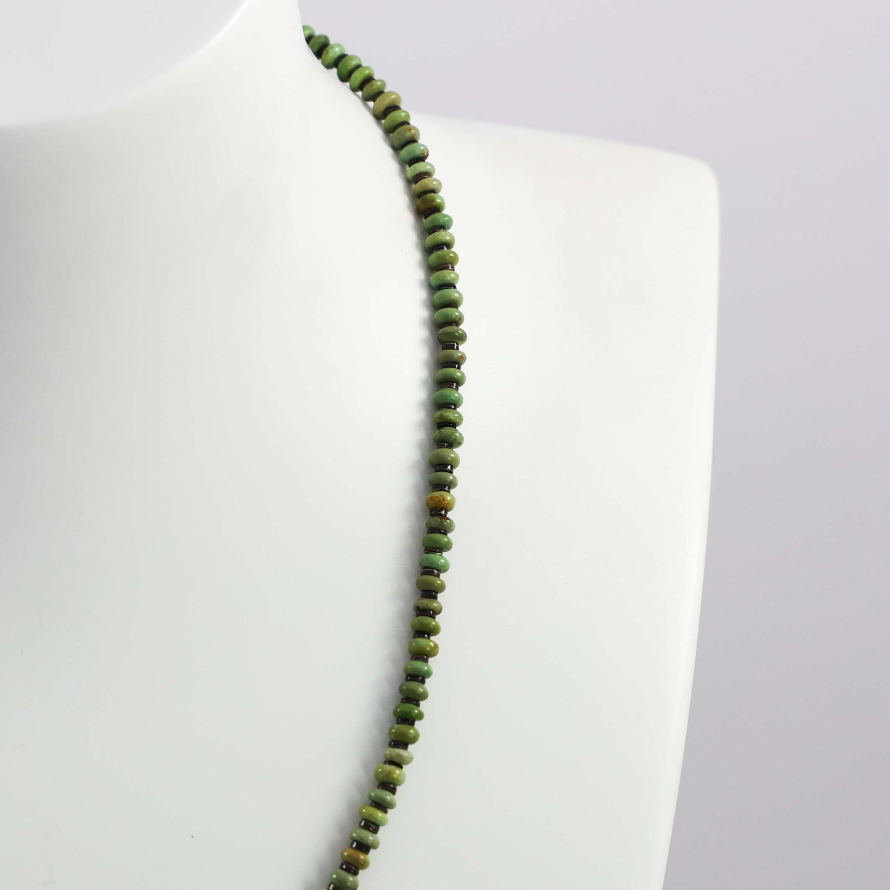 Single Strand Bead Necklace with Alternating Stabilized Turquoise and Pen Shell Beads. This necklace features a sterling silver clasp.