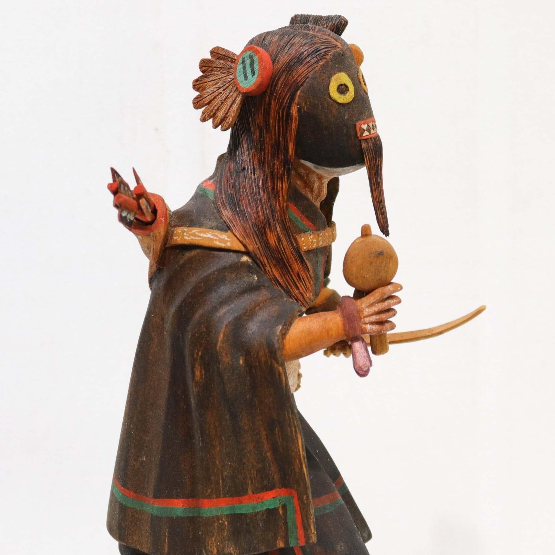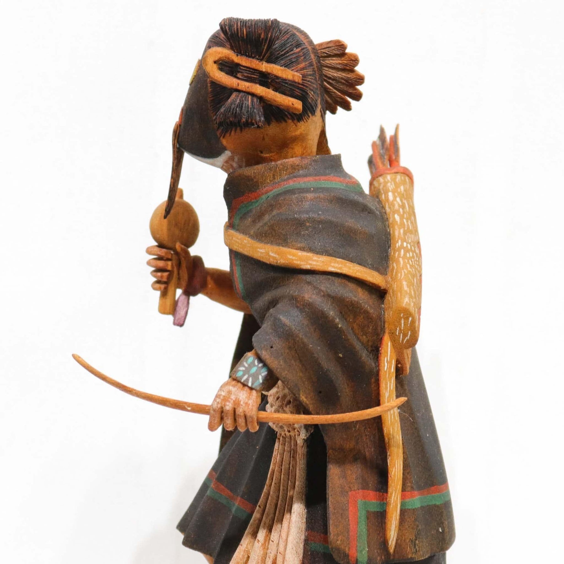 Hand-Carved and Painted Warrior Maiden (He’e’e Wuhti) Kachina Holding a Rattle and Bow.