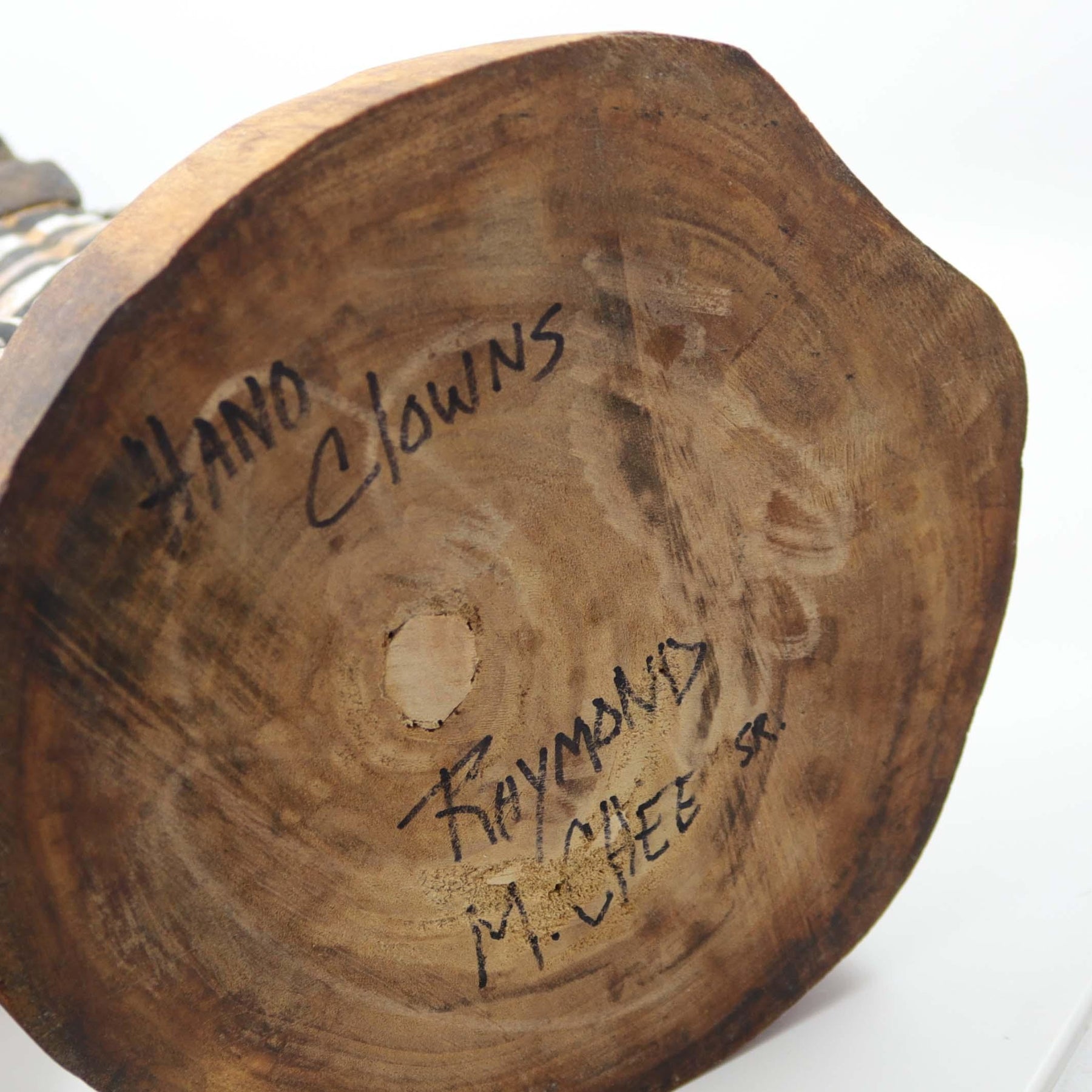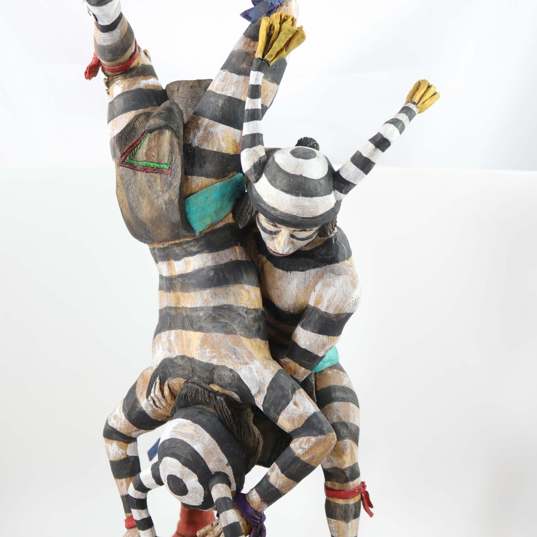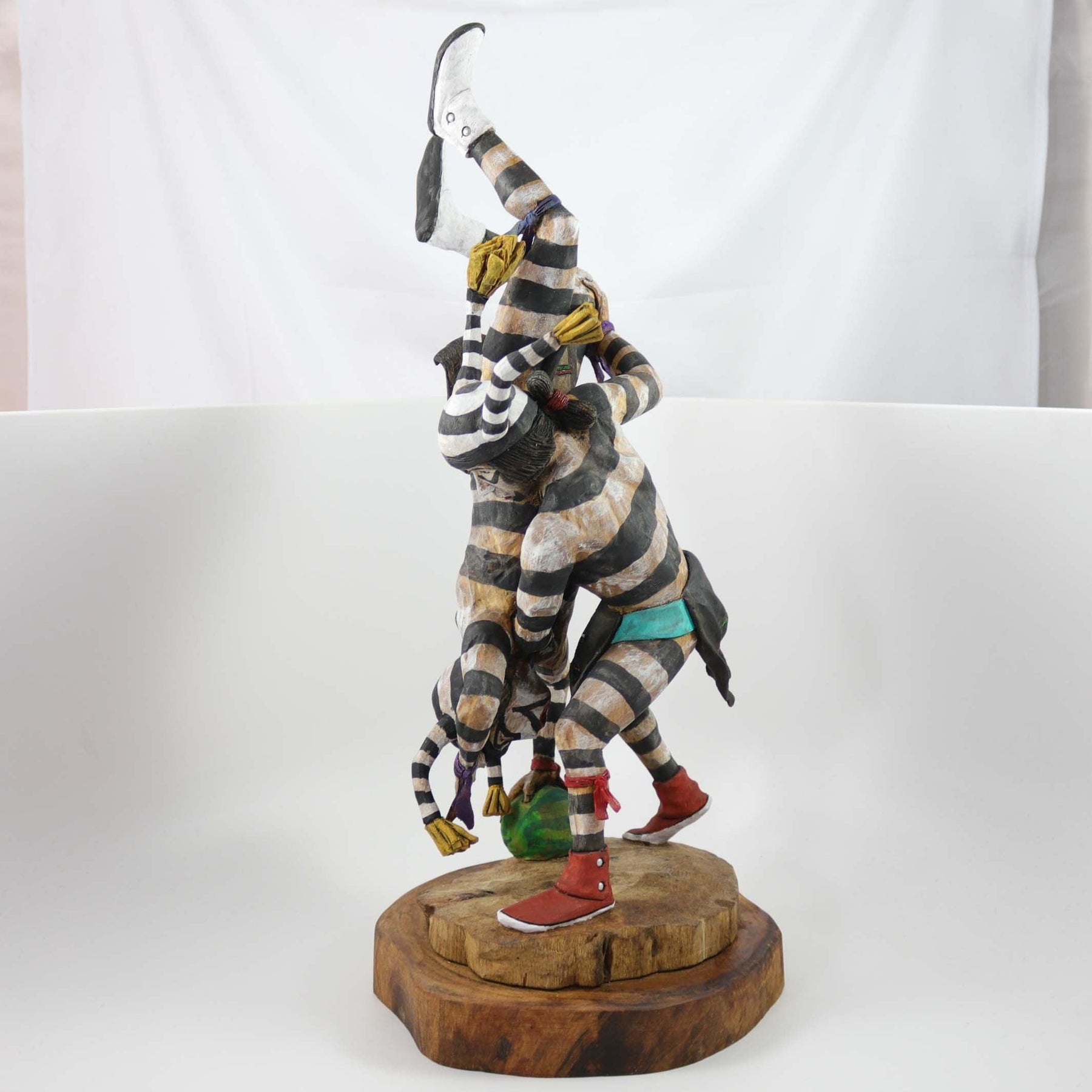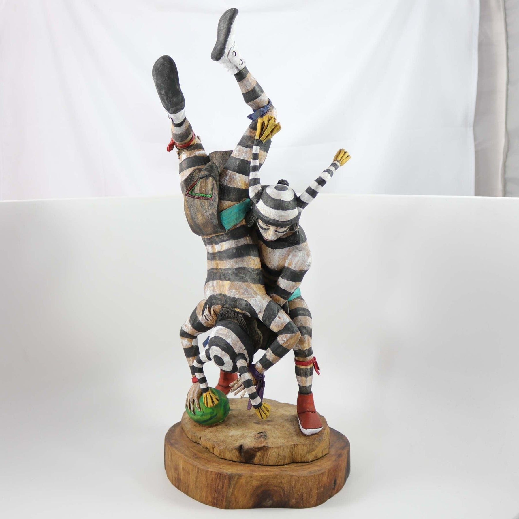 Hand Carved and Painted Wrestling Hano Clowns over a Watermelon. This sculpture was carved from one piece of Cottonwood root.