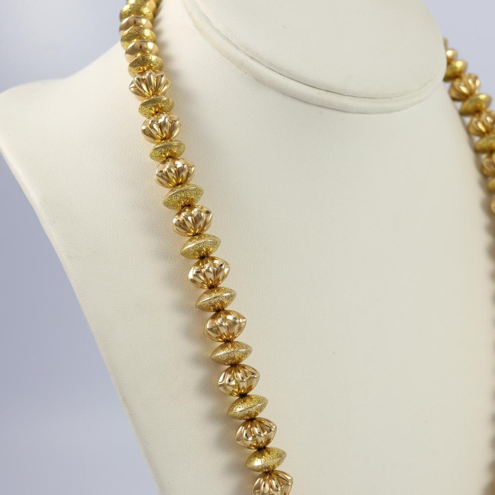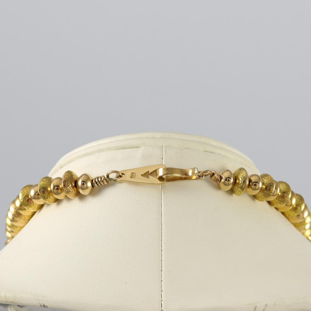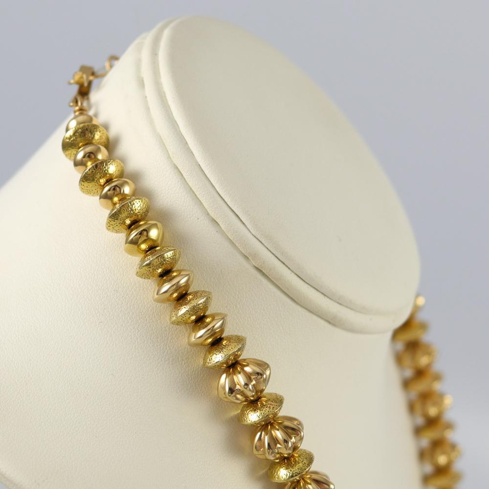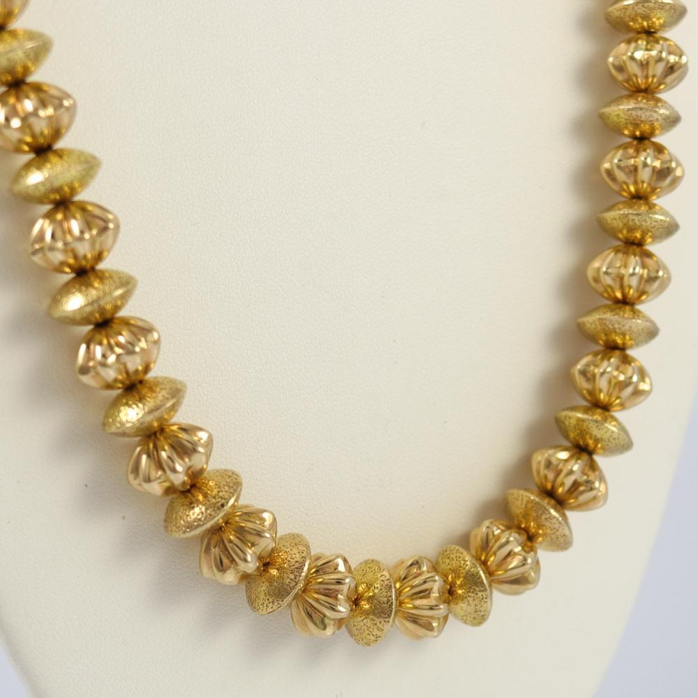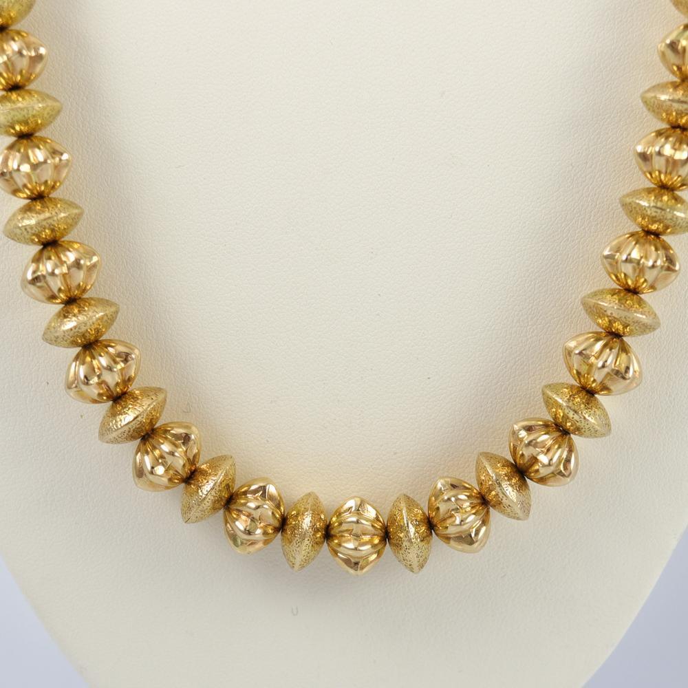 Collier de perles en or massif 14 carats avec perles d’or alternées lisses et cannelées faites à la main.