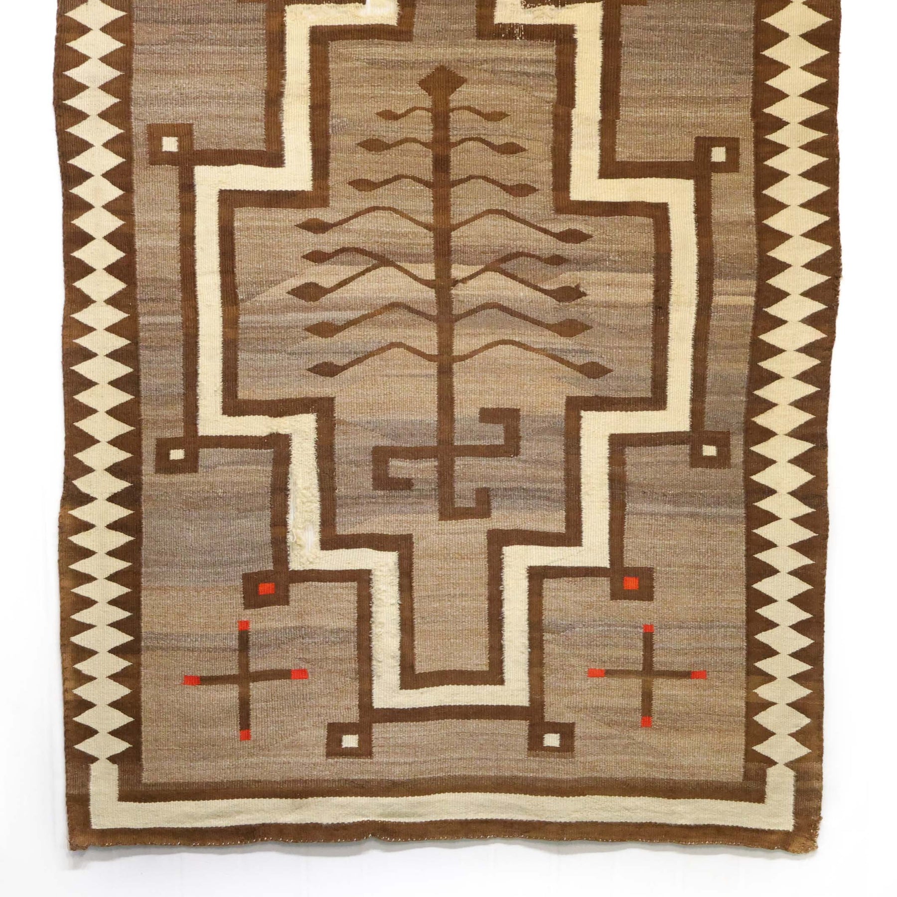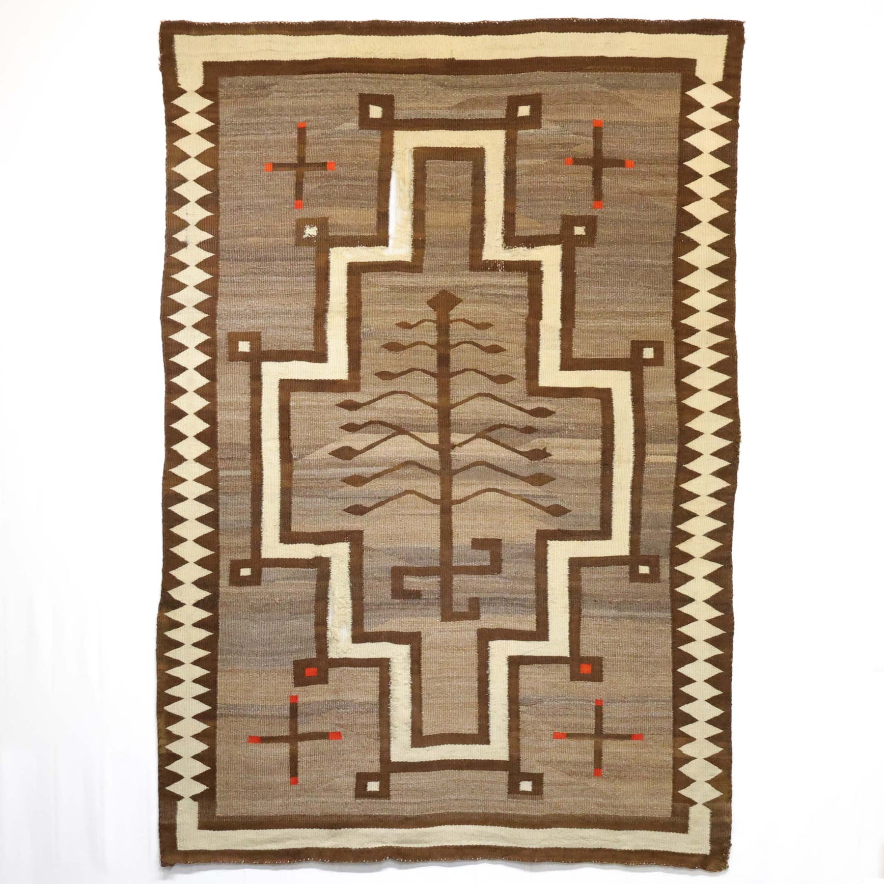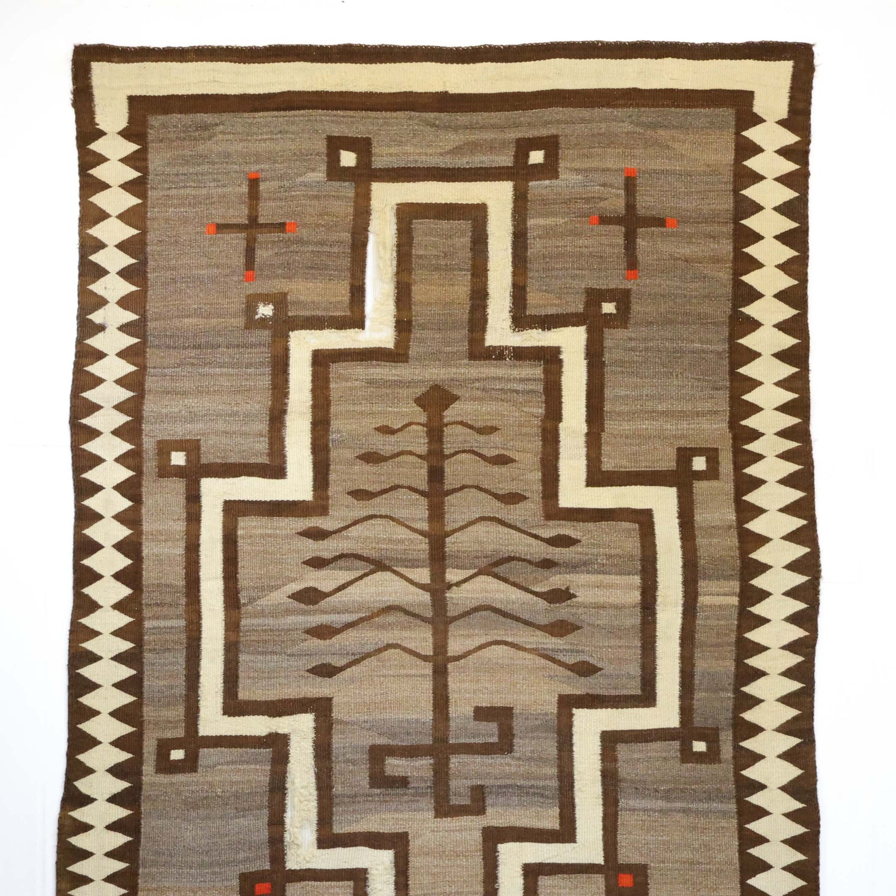 1910s Handwoven Navajo Crystal Weaving with Hand-Carded and Spun Wool featuring Natural Wool Colors and Red Accents. This weaving has been cleaned but has significant wear with a few holes and has been priced accordingly.