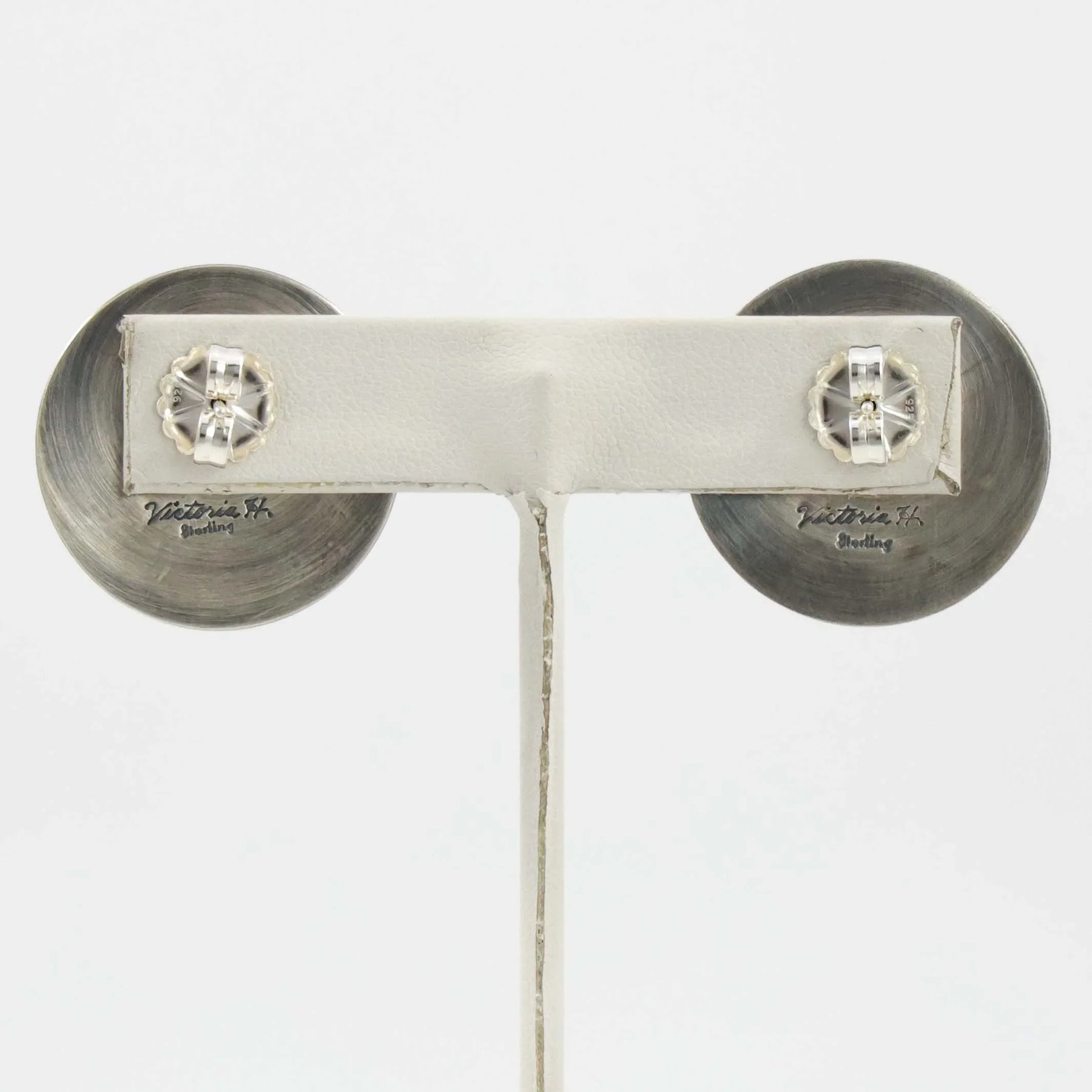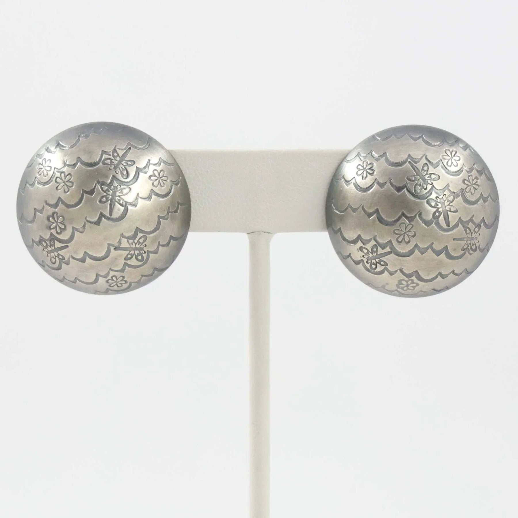 Sterling Silver Post Button Earrings with Handmade Beads with Hand-Stamped Dragonfly Design Elements.