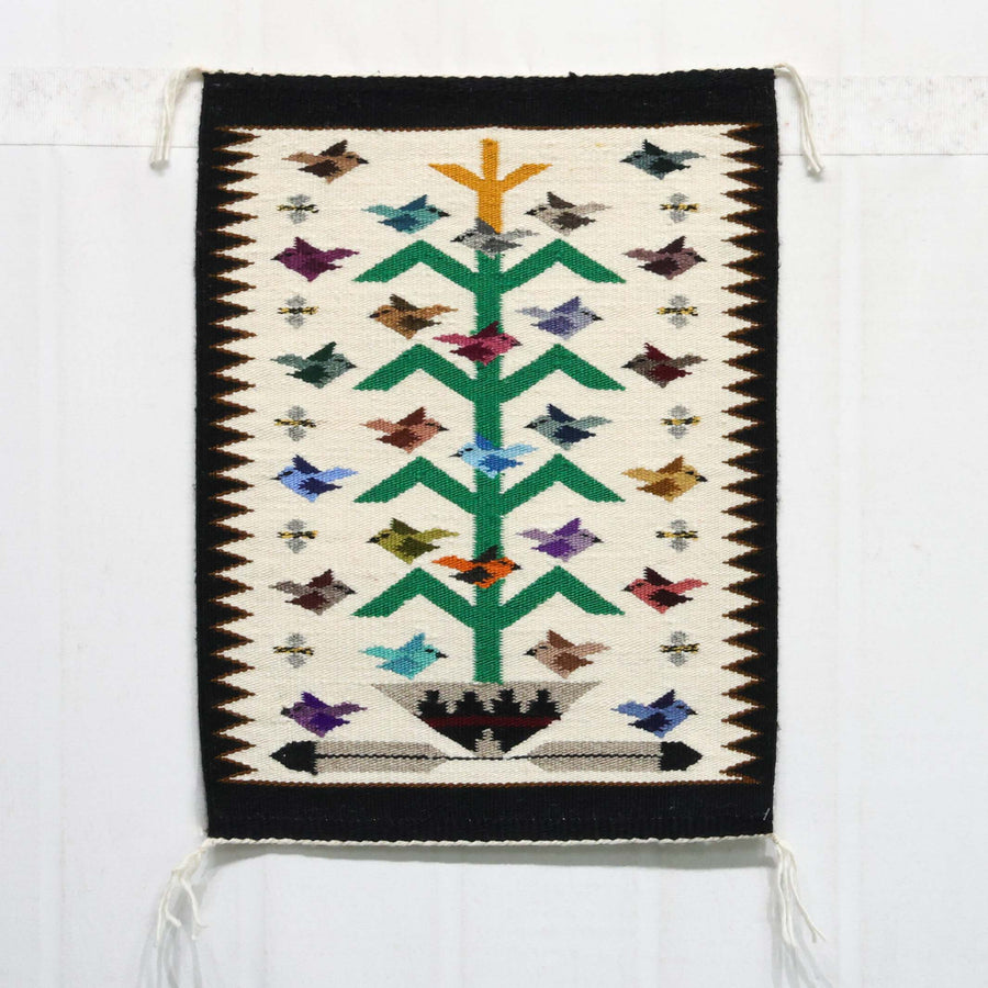 Handwoven Navajo Bird Pictorial (Tree of Life) Weaving with Colorful Birds on a White Background.