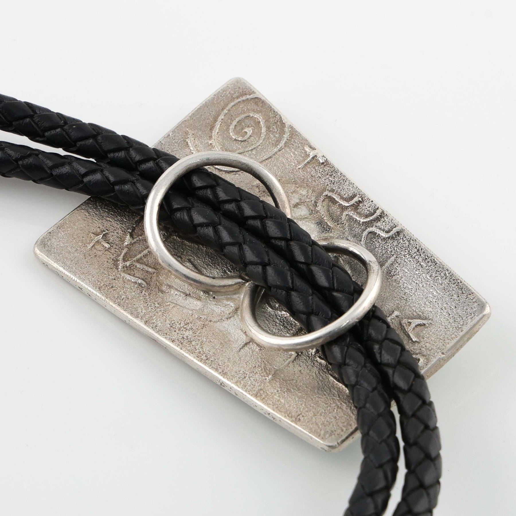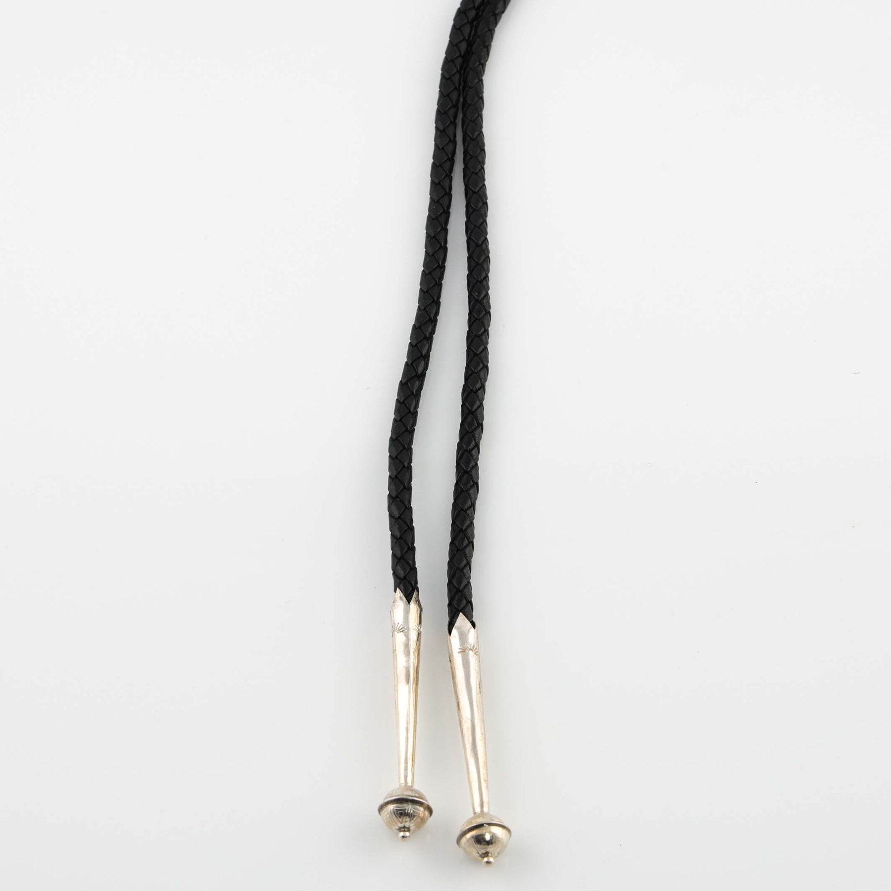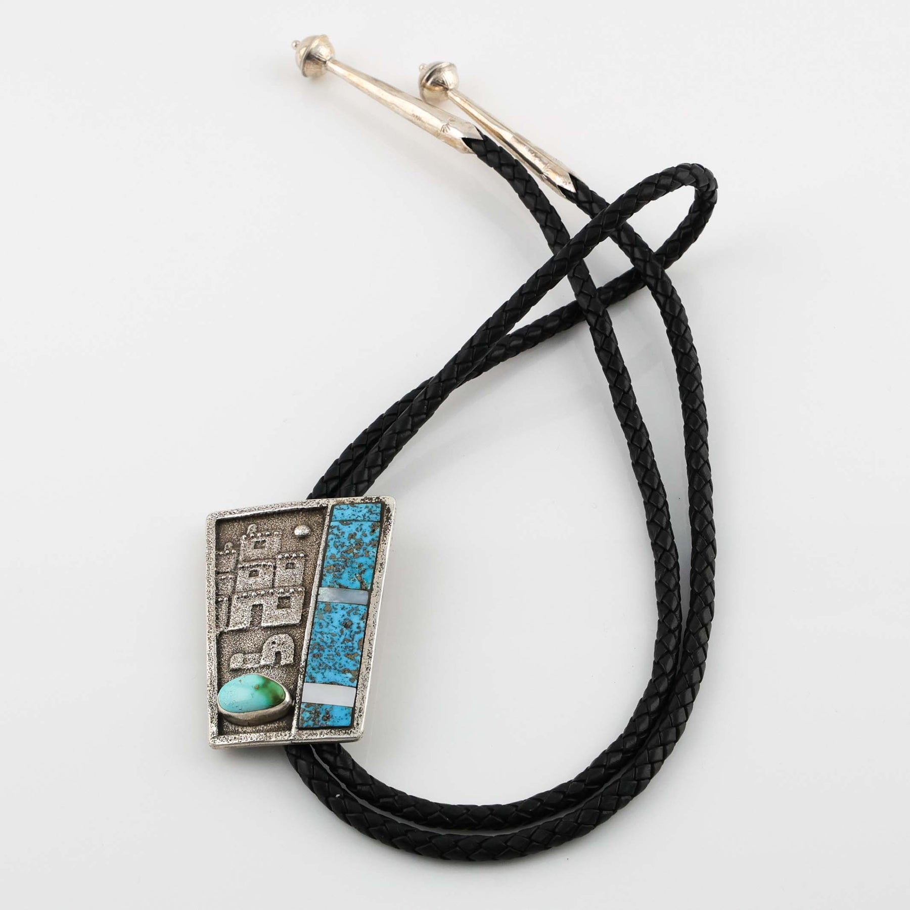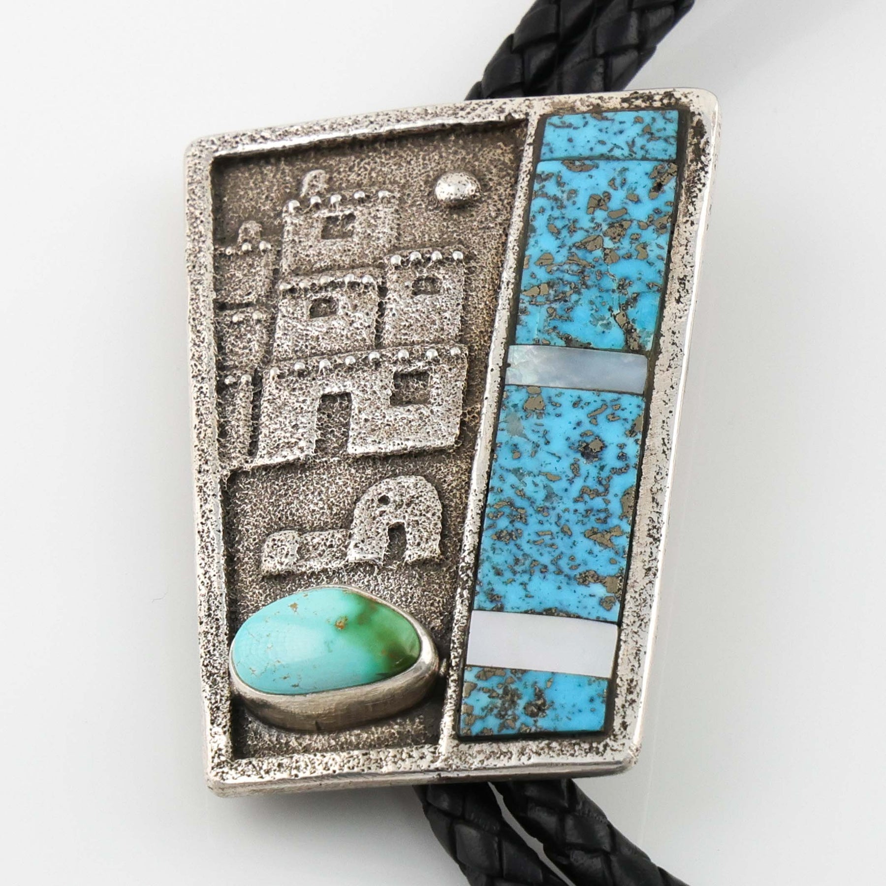 Tufa Cast Sterling Silver Bolo Tie Depicting a Pueblo Village Scene. The bolo tie is set with Natural Royston Turquoise from Nevada and inlaid with Natural Ithaca Peak Turquoise from Arizona and Mother of Pearl Shell. The piece is finished with a figure-eight backing, sterling silver tips, and a black leather cord.
