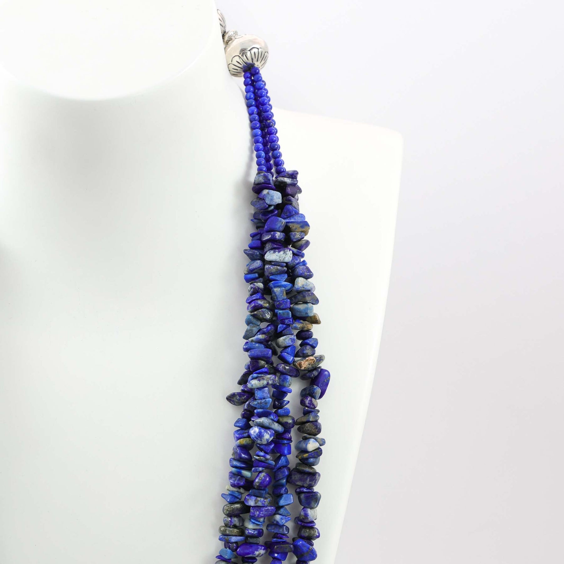 Four Strand Lapis Bead Necklace Featuring a Healing Hand Pendant with Inlaid Coral and Lapis. The necklace is finished with sterling silver beads and clasp.