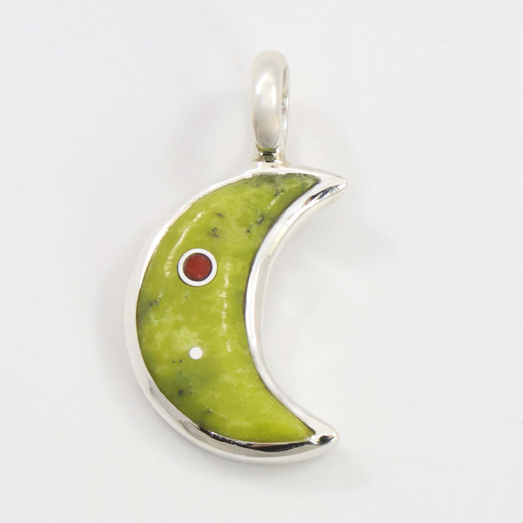Sterling Silver Moon Pendant with Inlaid Serpentine and Mediterranean Coral.