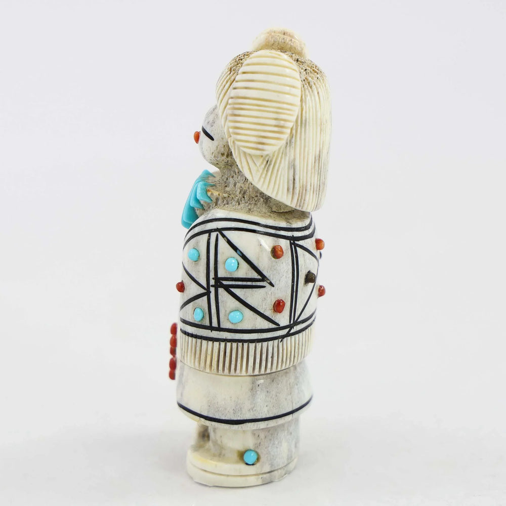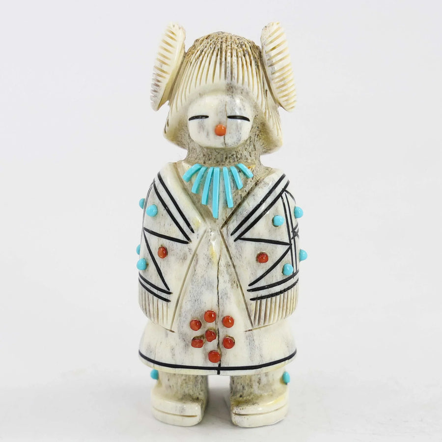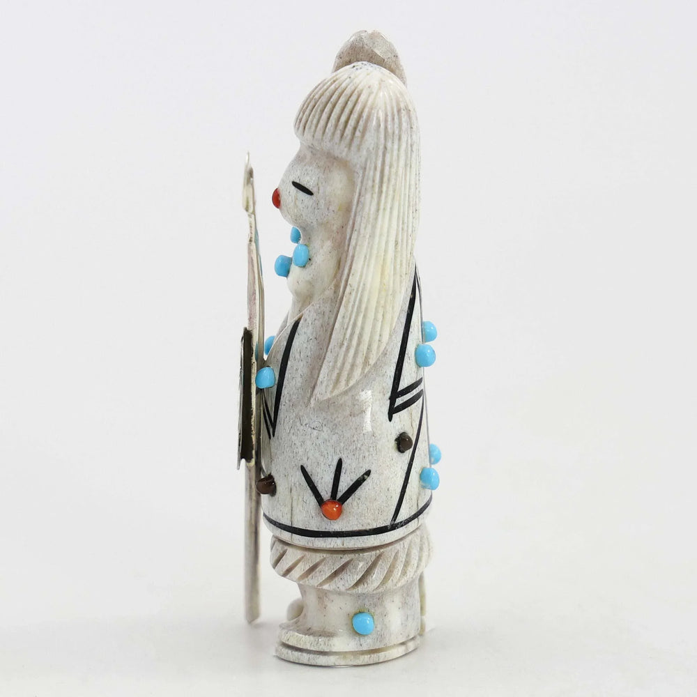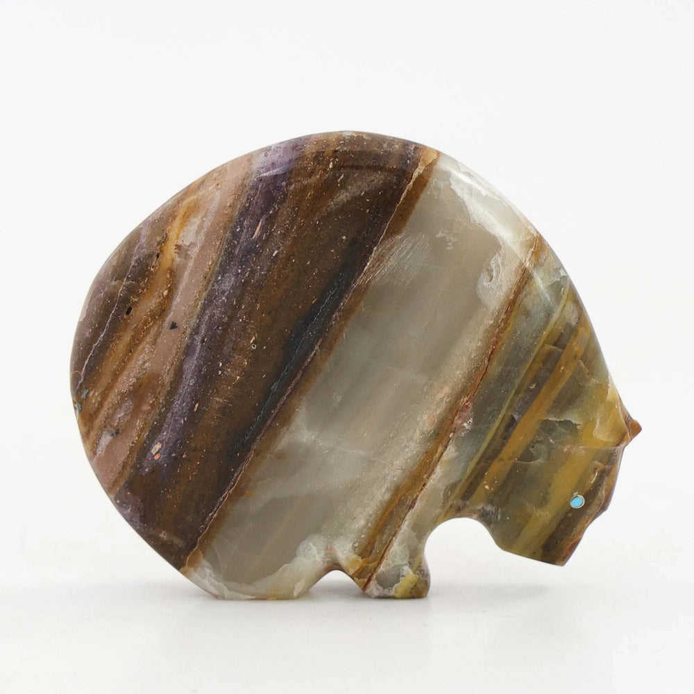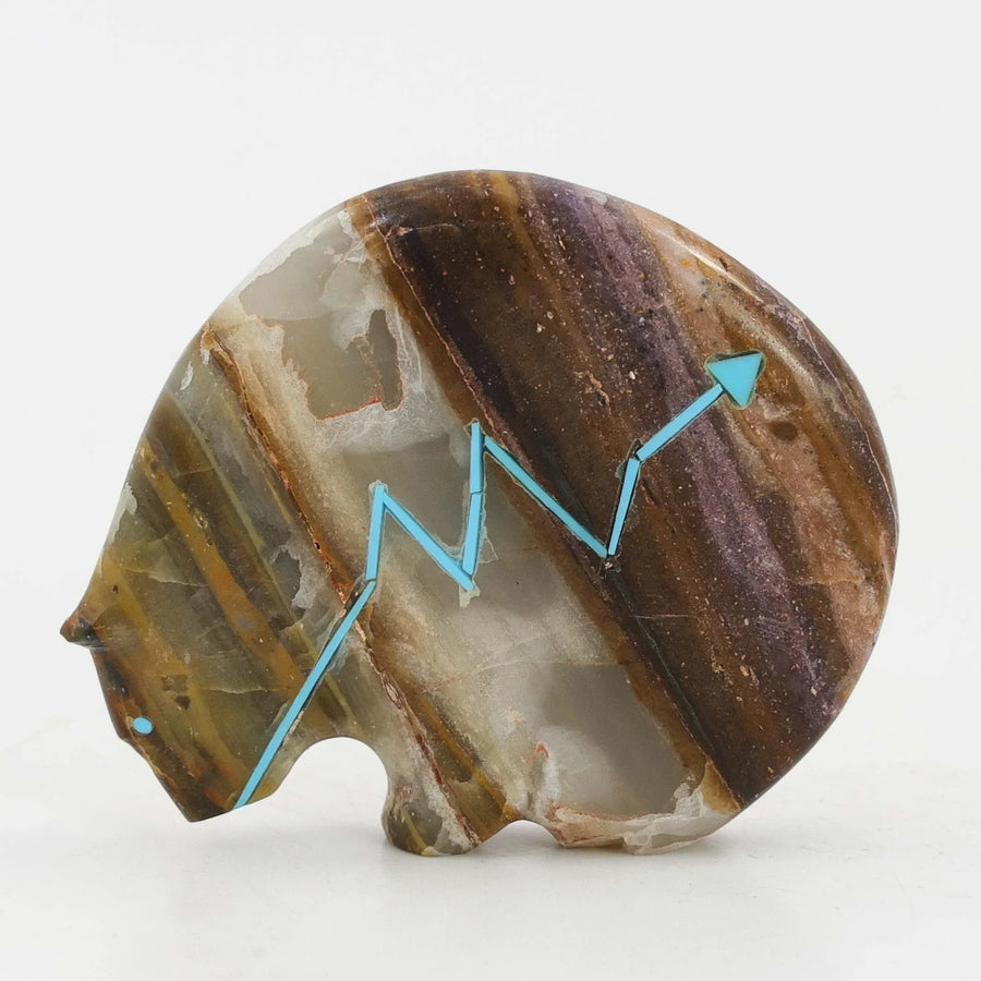 Hand-Carved Zuni Bear Fetish made out of Dolomite and Featuring an Inlaid Sunface and Feather.
