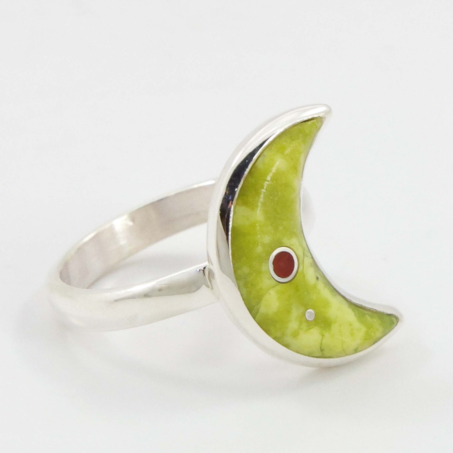 Sterling Silver Moon Ring with Inlaid Serpentine and Mediterranean Coral.