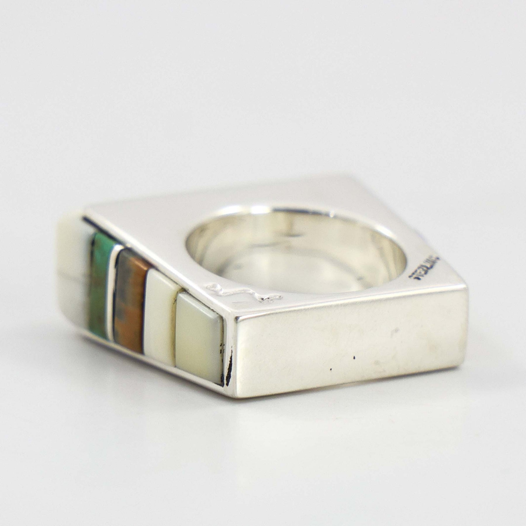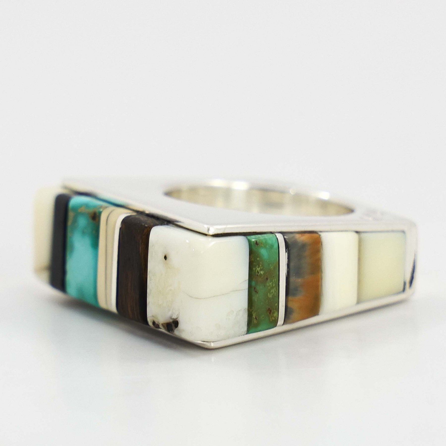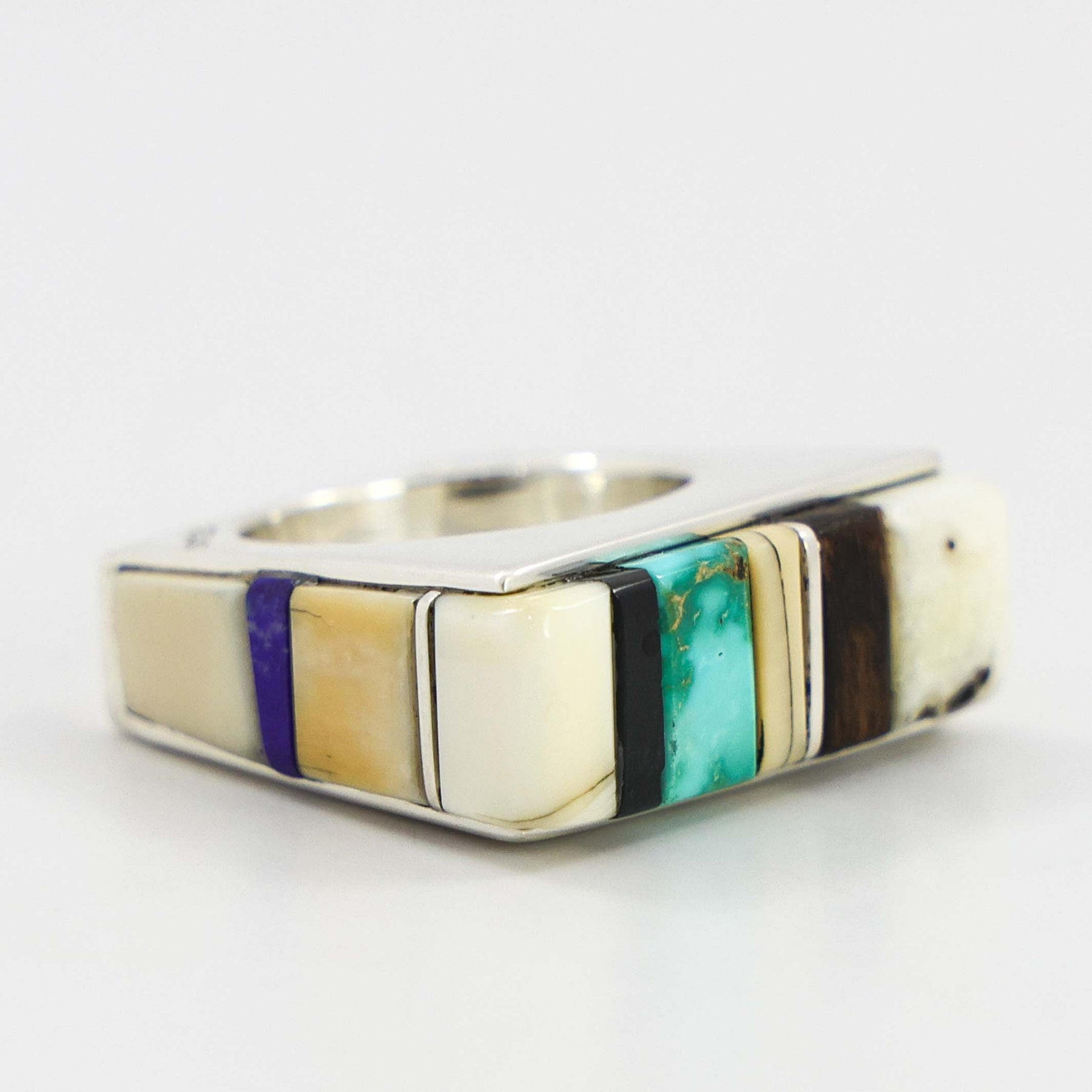 Sterling Silver Ring with Cobbled Inlaid Fossilized Ivory, Ebony, Black Jade, Lapis, Agate, Natural Lone Mountain Turquoise, and Silver Spacers.