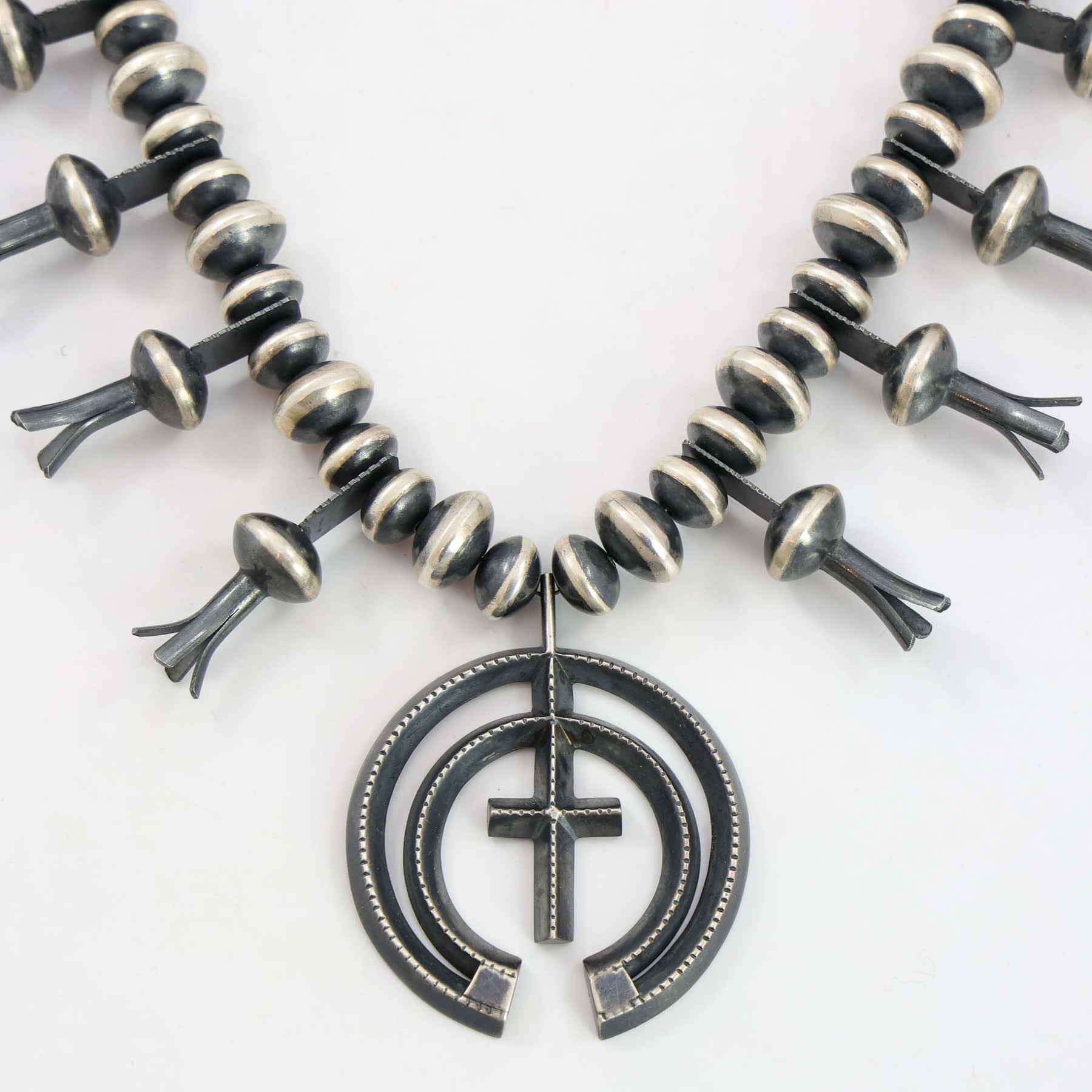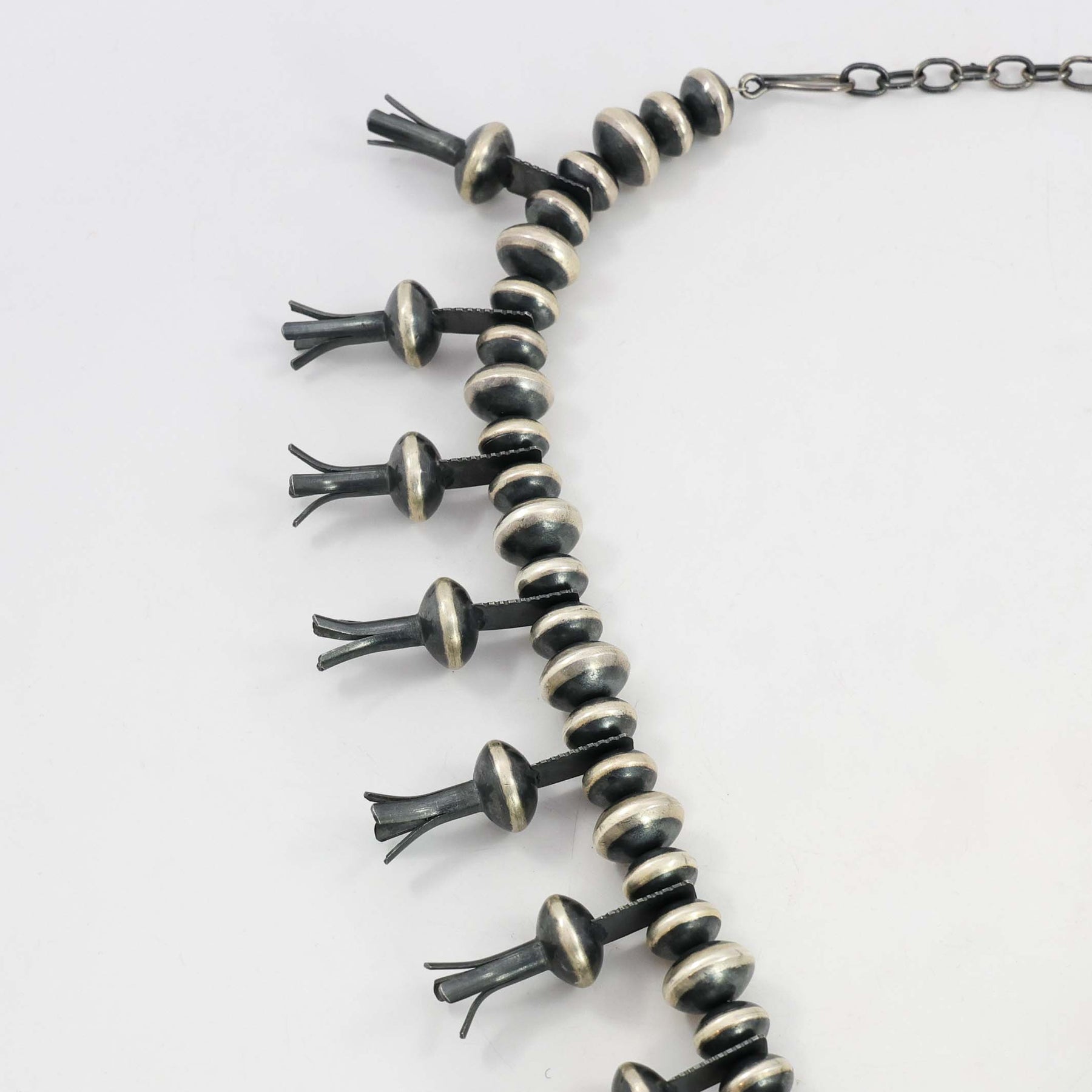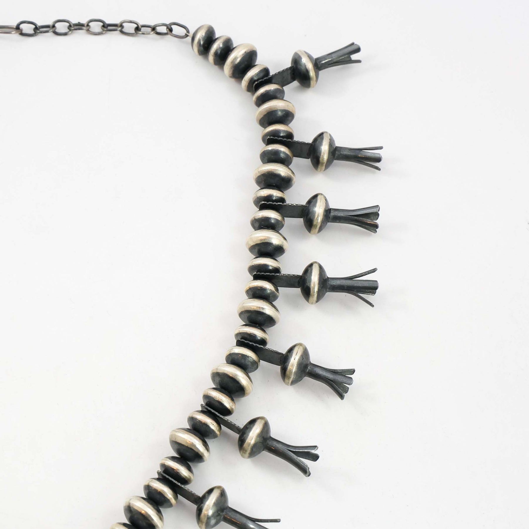 1990s Single Strand Sterling Silver Squash Blossom Necklace with Handmade Navajo Pearl Beads and Squash Blossoms. This necklace features an oxidized finish.