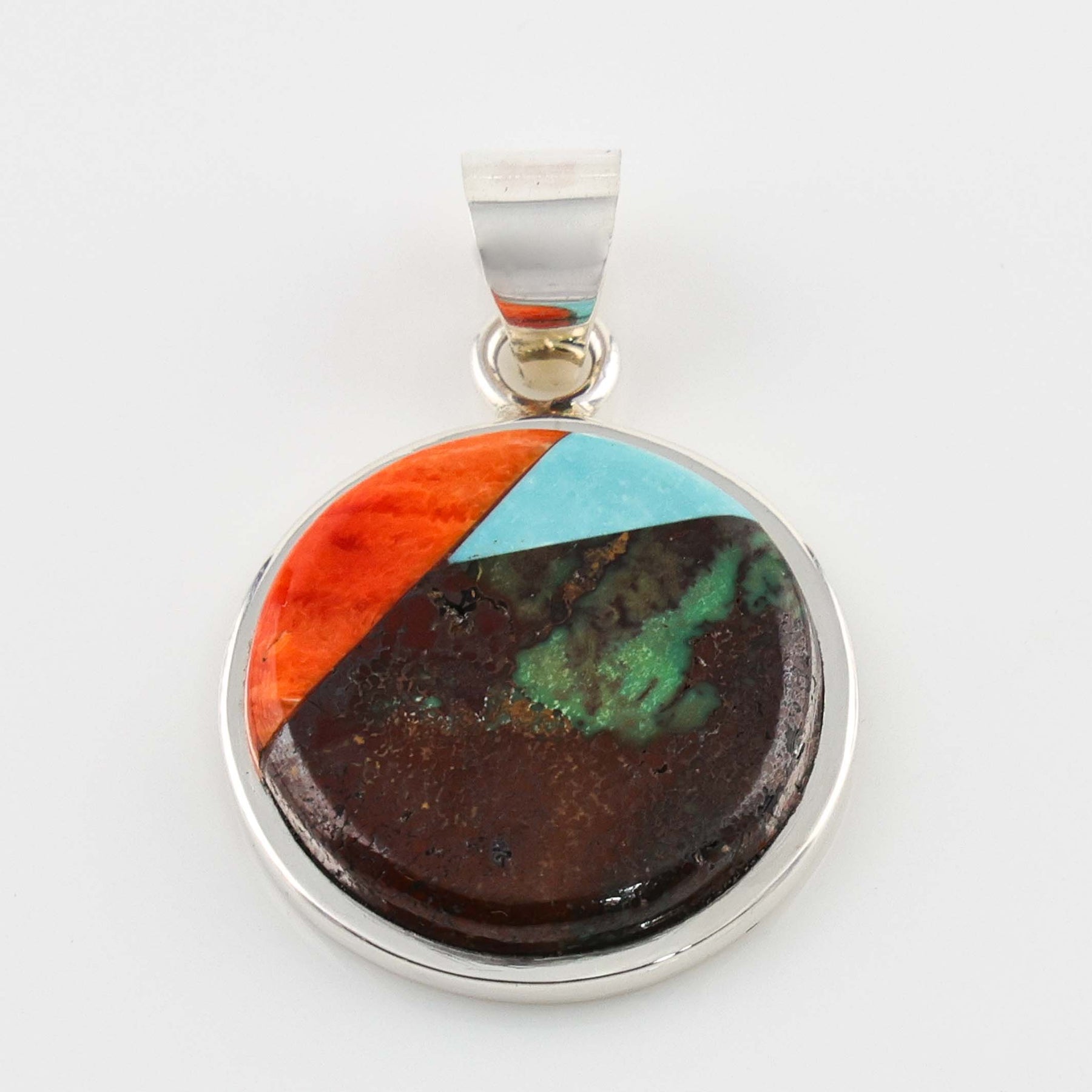 Sterling Silver Round Pendant with Mosaic Inlaid Rosarita, Natural Kingman Turquoise, and Natural Fox Turquoise.
