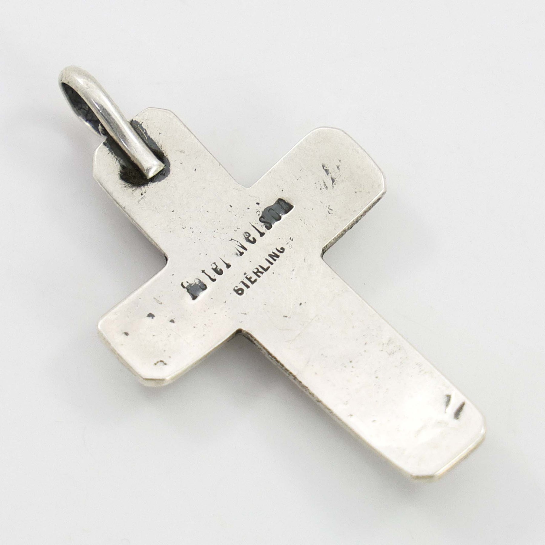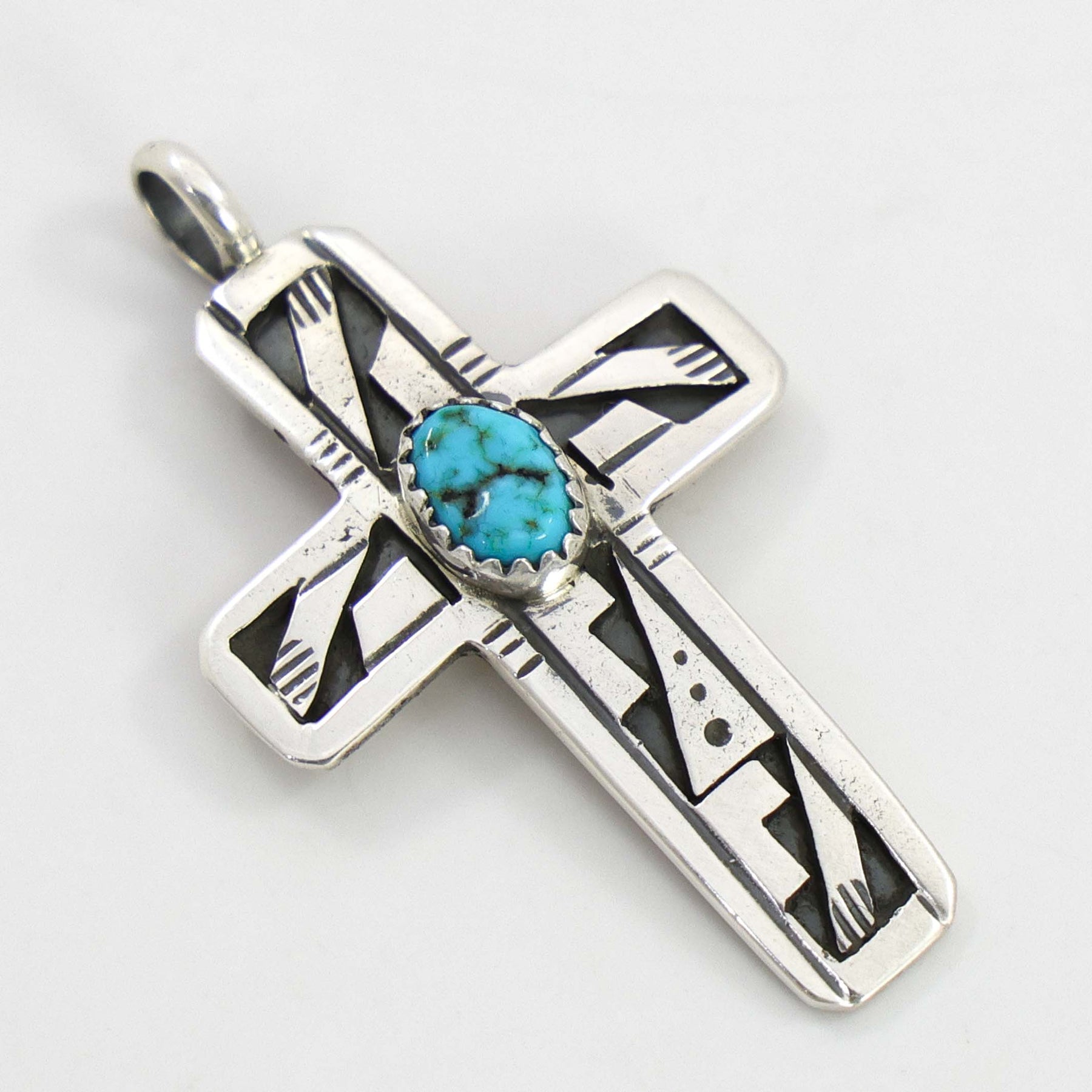Sterling Silver Cross Pendant with Overlaid Designs and set with Natural Kingman Turquoise from Arizona.
