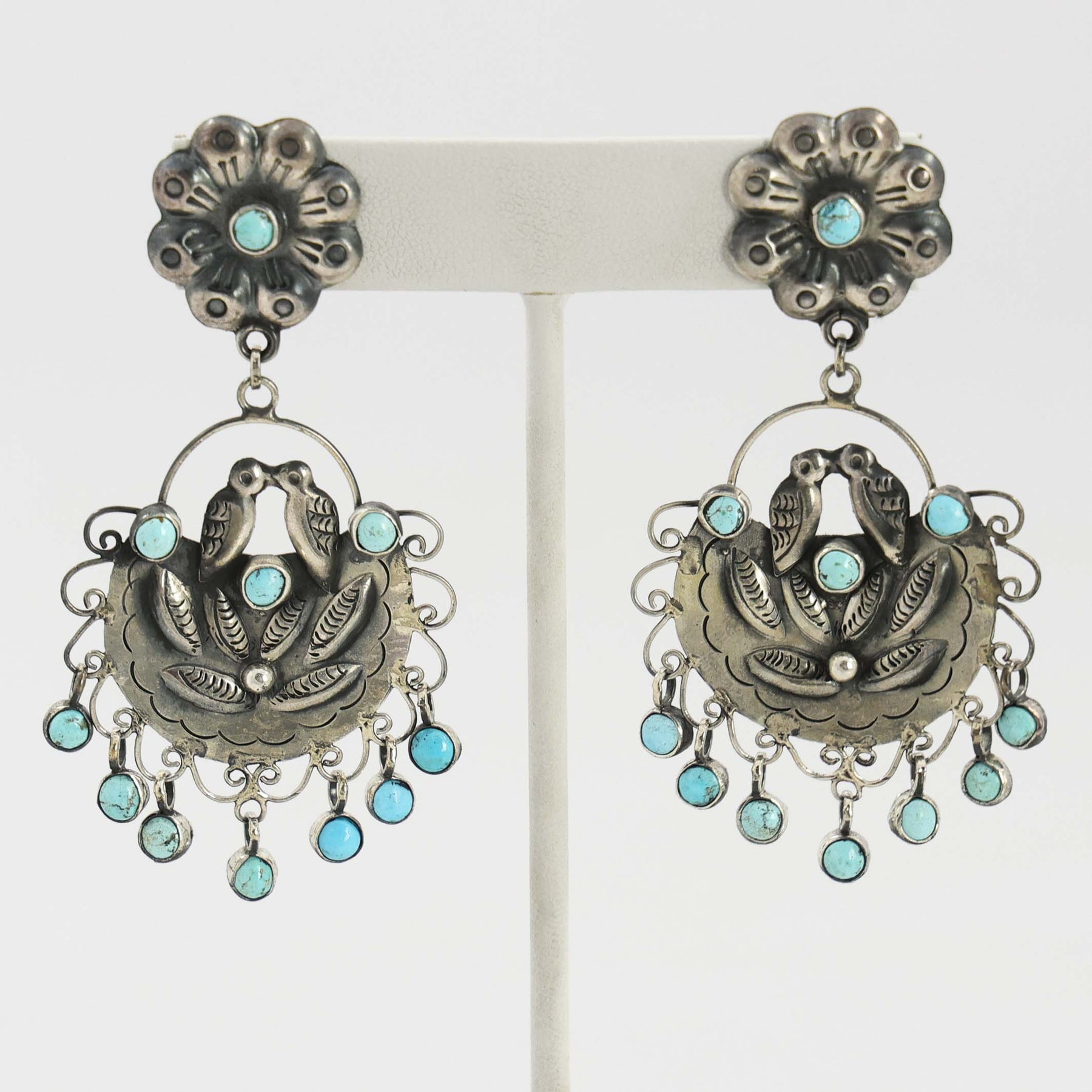 Sterling Silver French Hook “Frida Kahlo” Style Earrings with Love Birds, Flowers, and Turquoise.