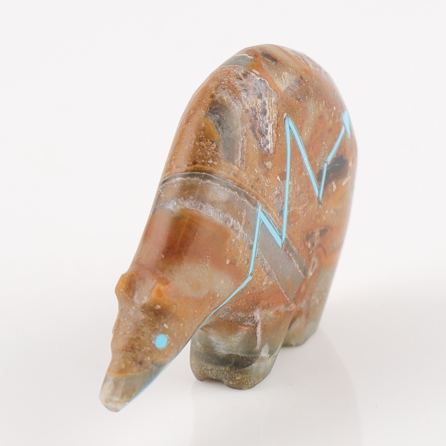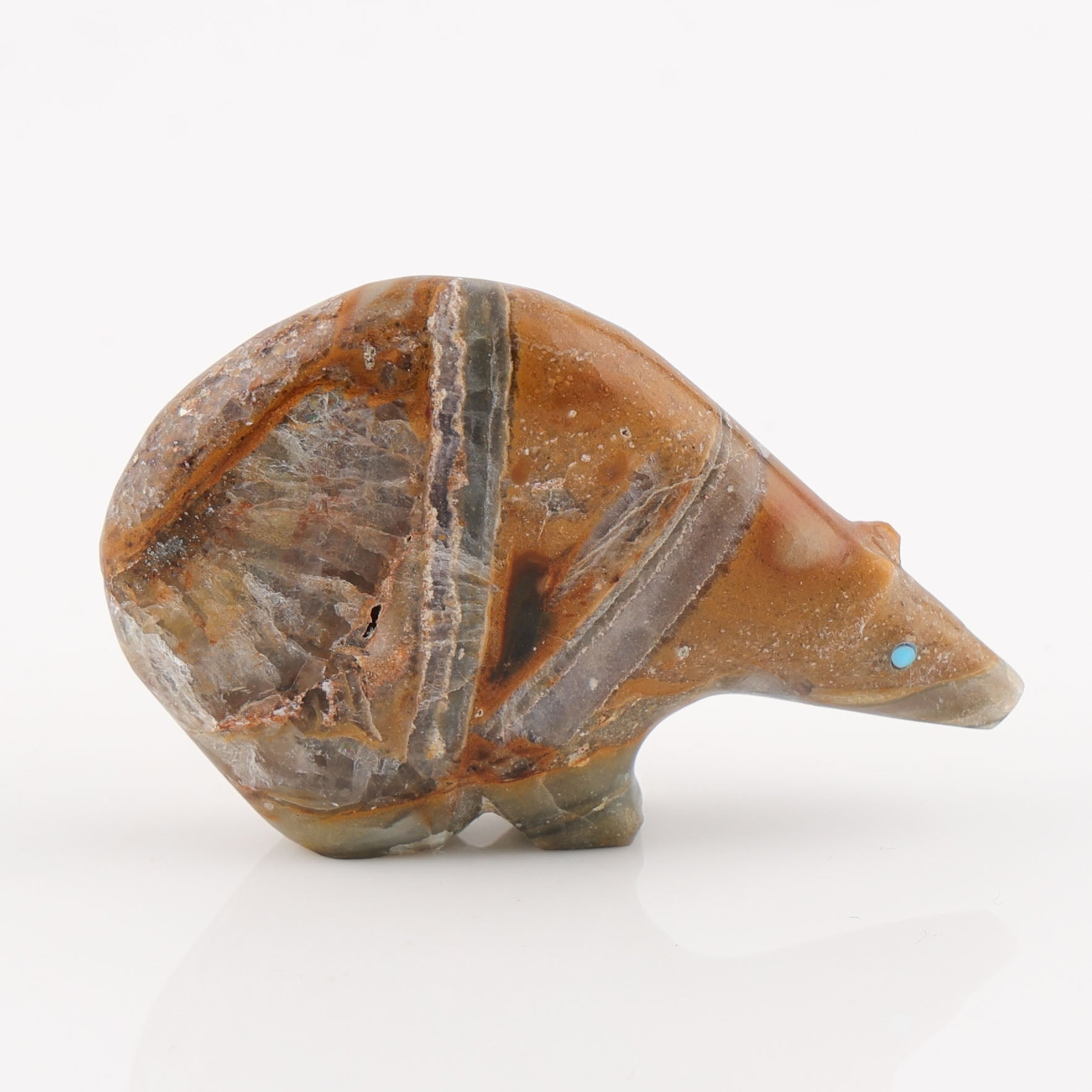 Humpback bear fetish by Stewart Quandelacy, hand-carved from banded stone with natural earth-tone variations and turquoise eyes. The stylized form features a pronounced humpback profile, with turquoise inlay forming a heartline design across the body. In Zuni tradition, the bear is a symbol of strength, protection, and healing.