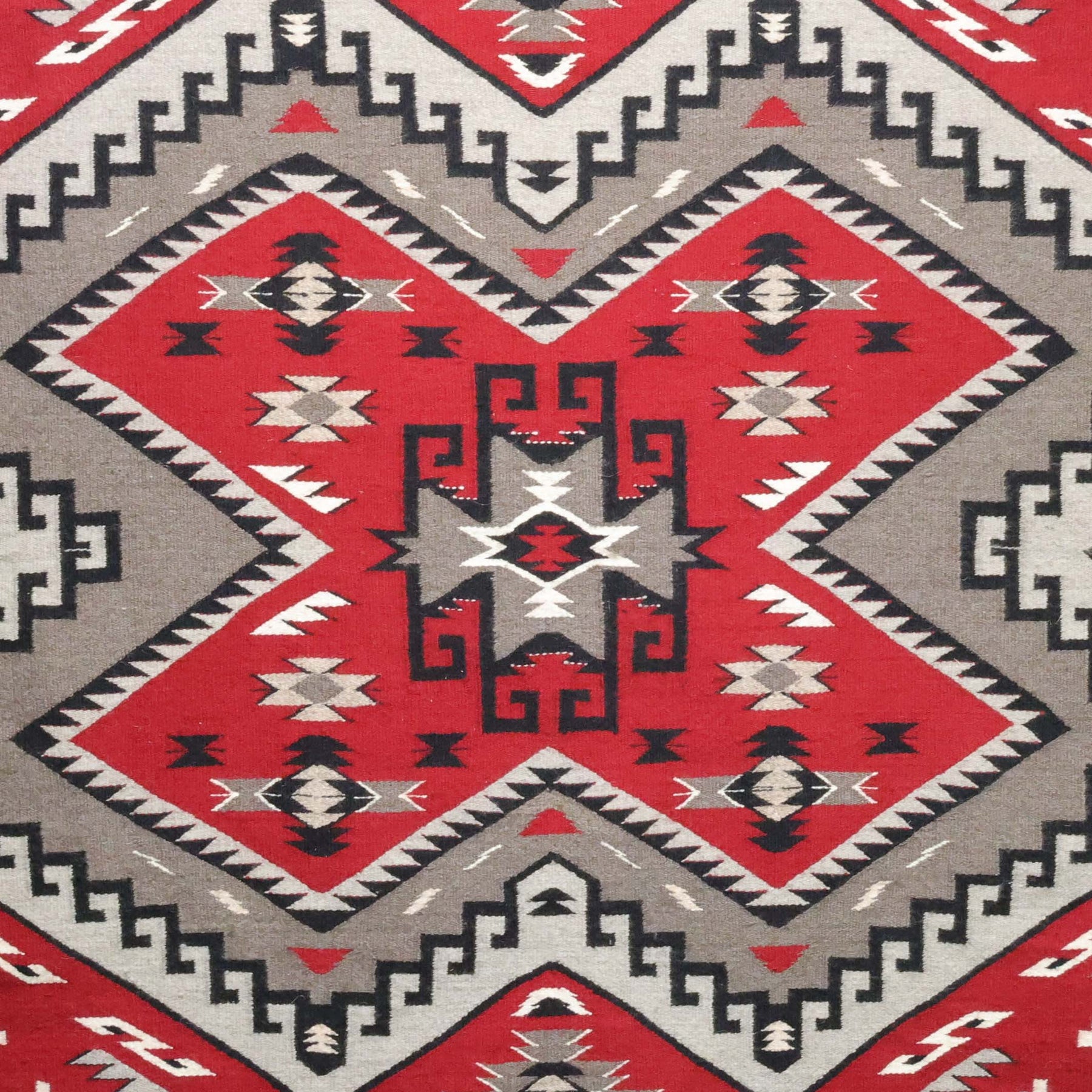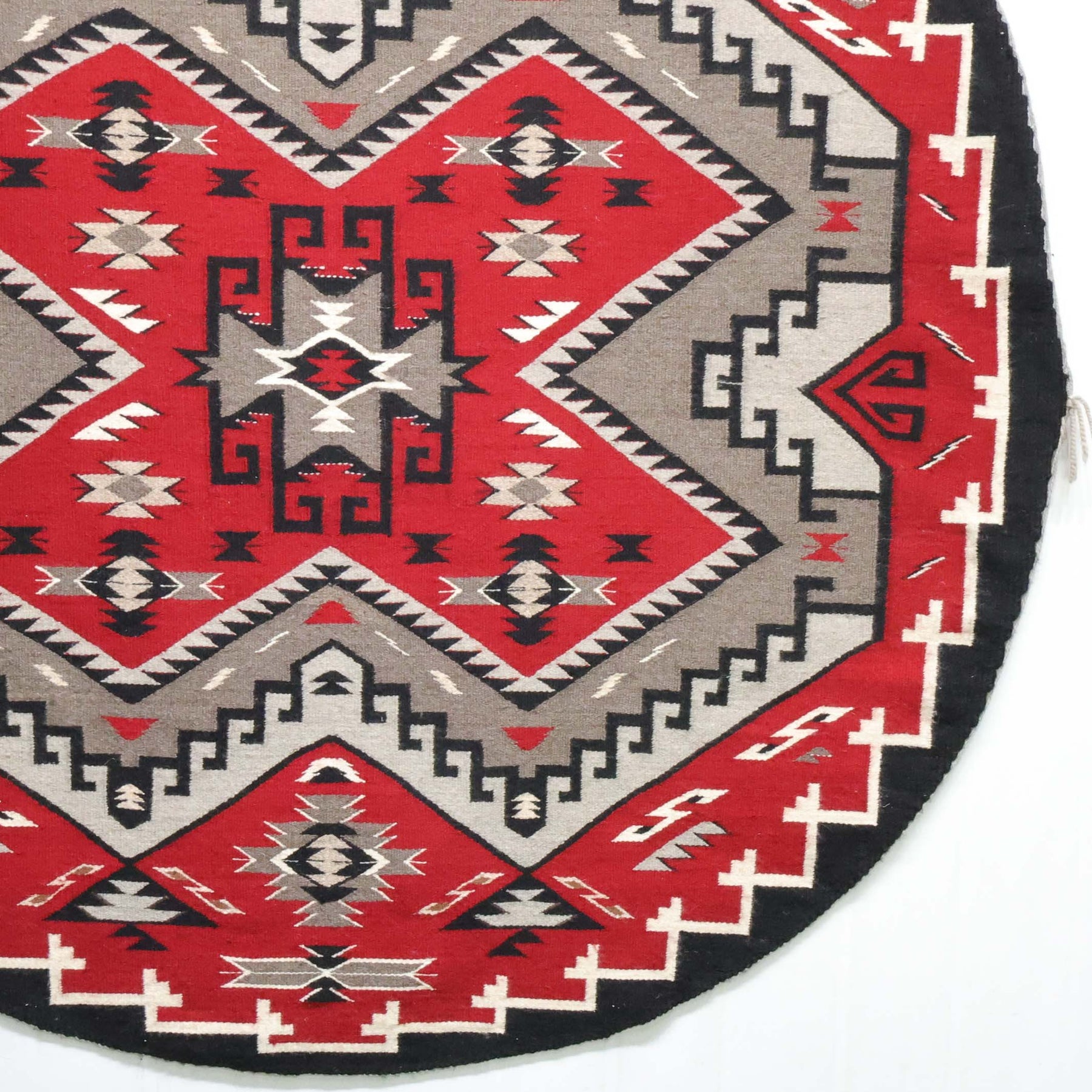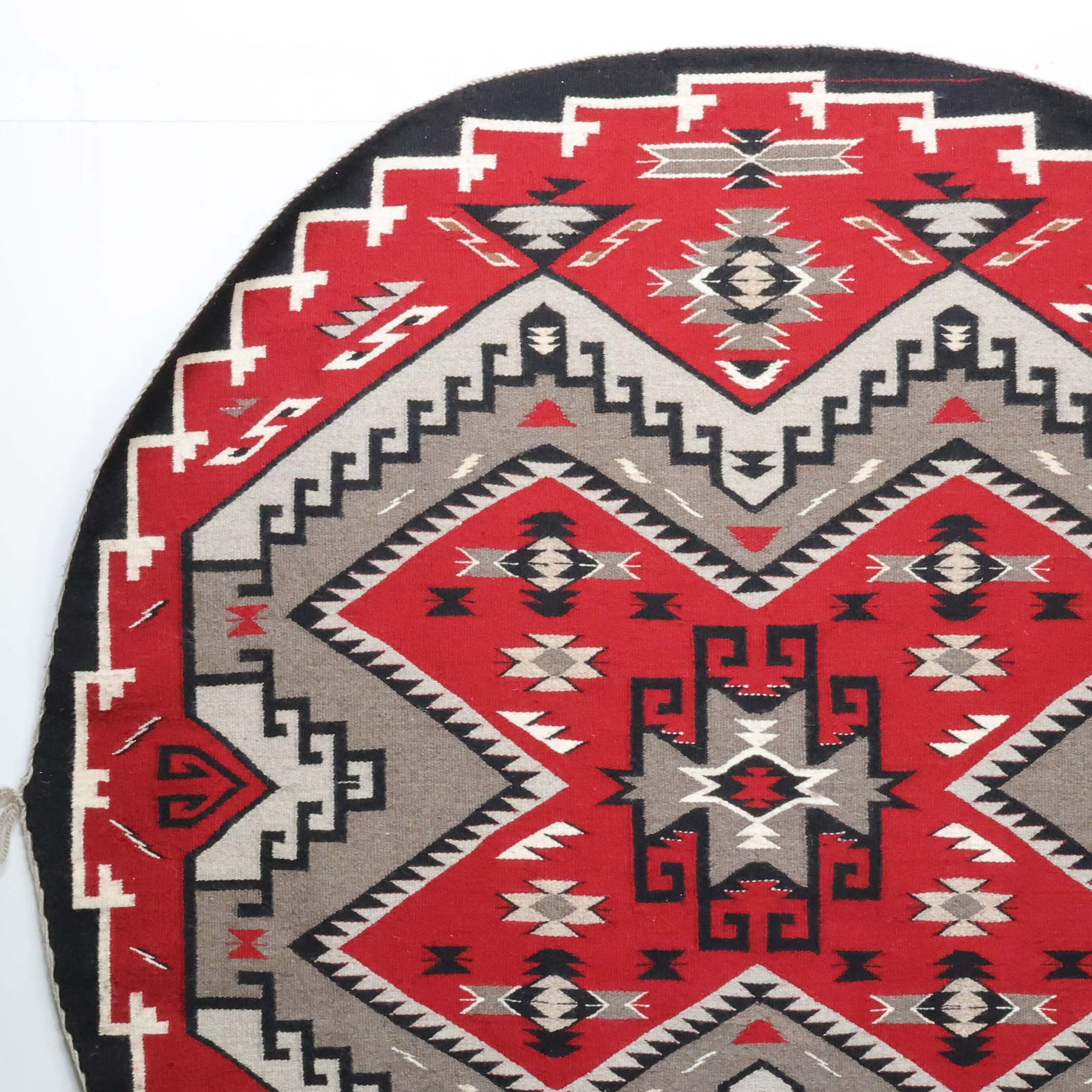 1980s Round Handwoven Navajo Weaving in the Ganado Regional Style, by Master Weaver Mary H. Yazzie (deceased). A rare example of a round Navajo rug, where weavers often utilize the steel outside frame of a wagon wheel as the loom.