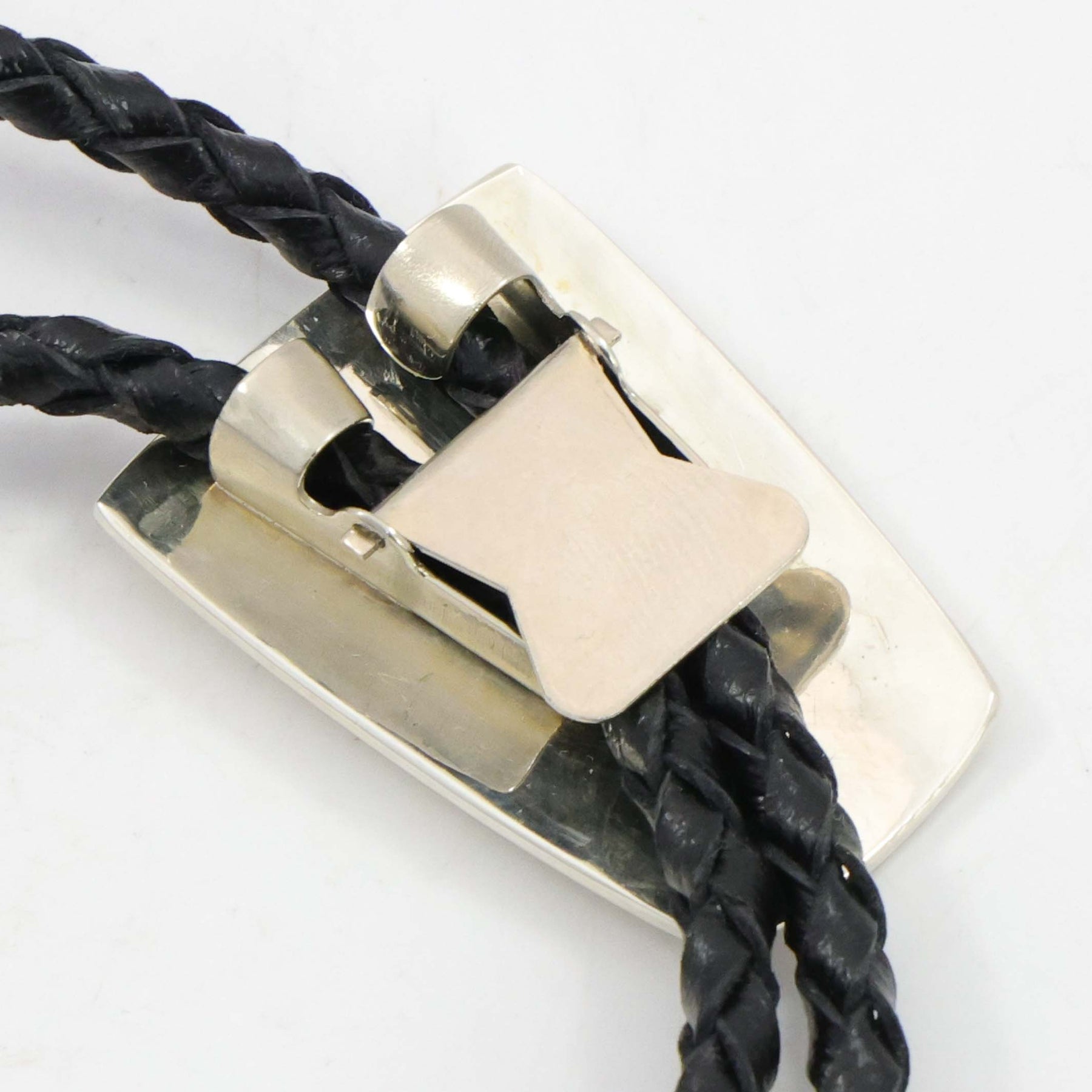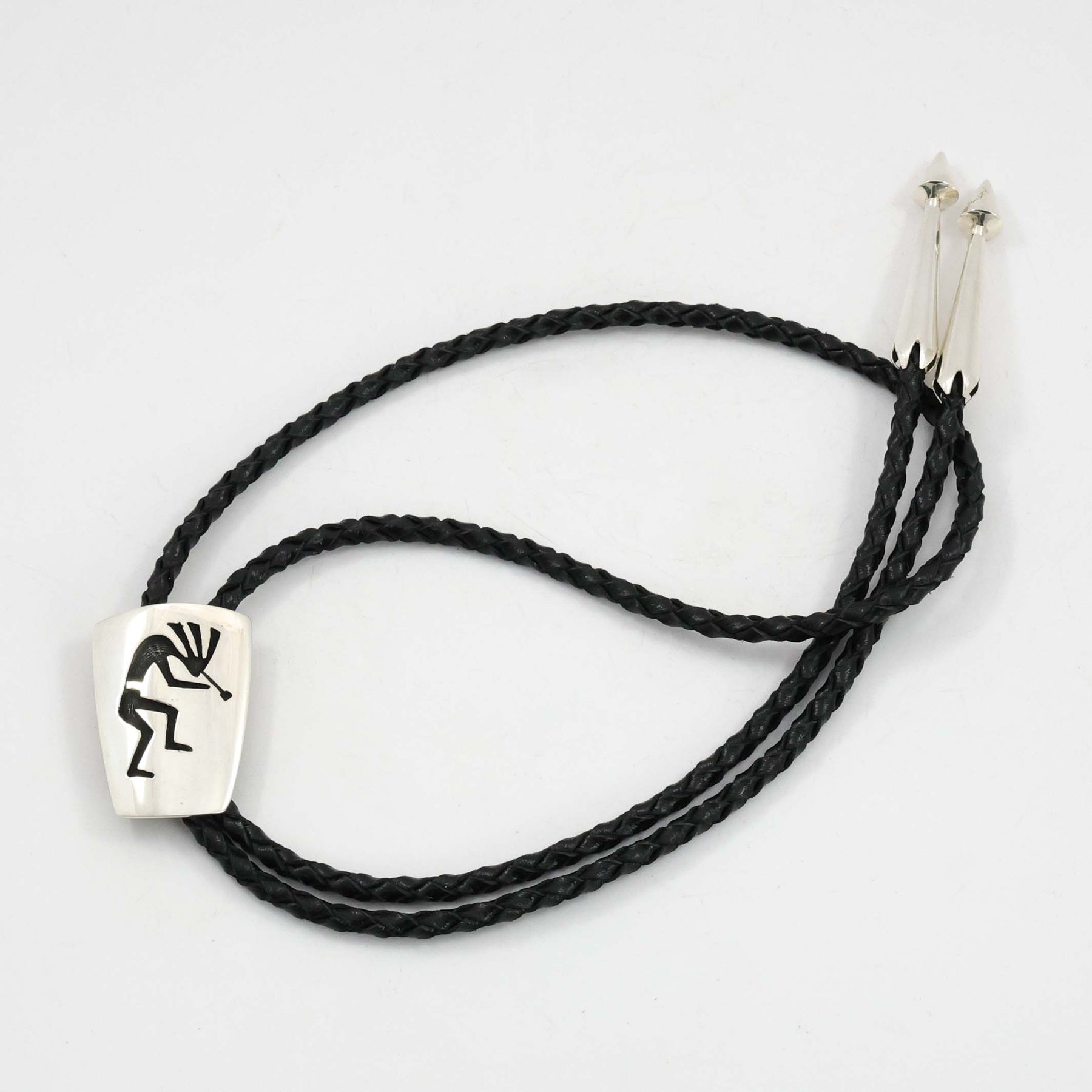Sterling Silver Bola Tie with Hopi Overlaid Kokopelli Design. This bola tie has a clamp backing, handmade tips, and a black leather cord.