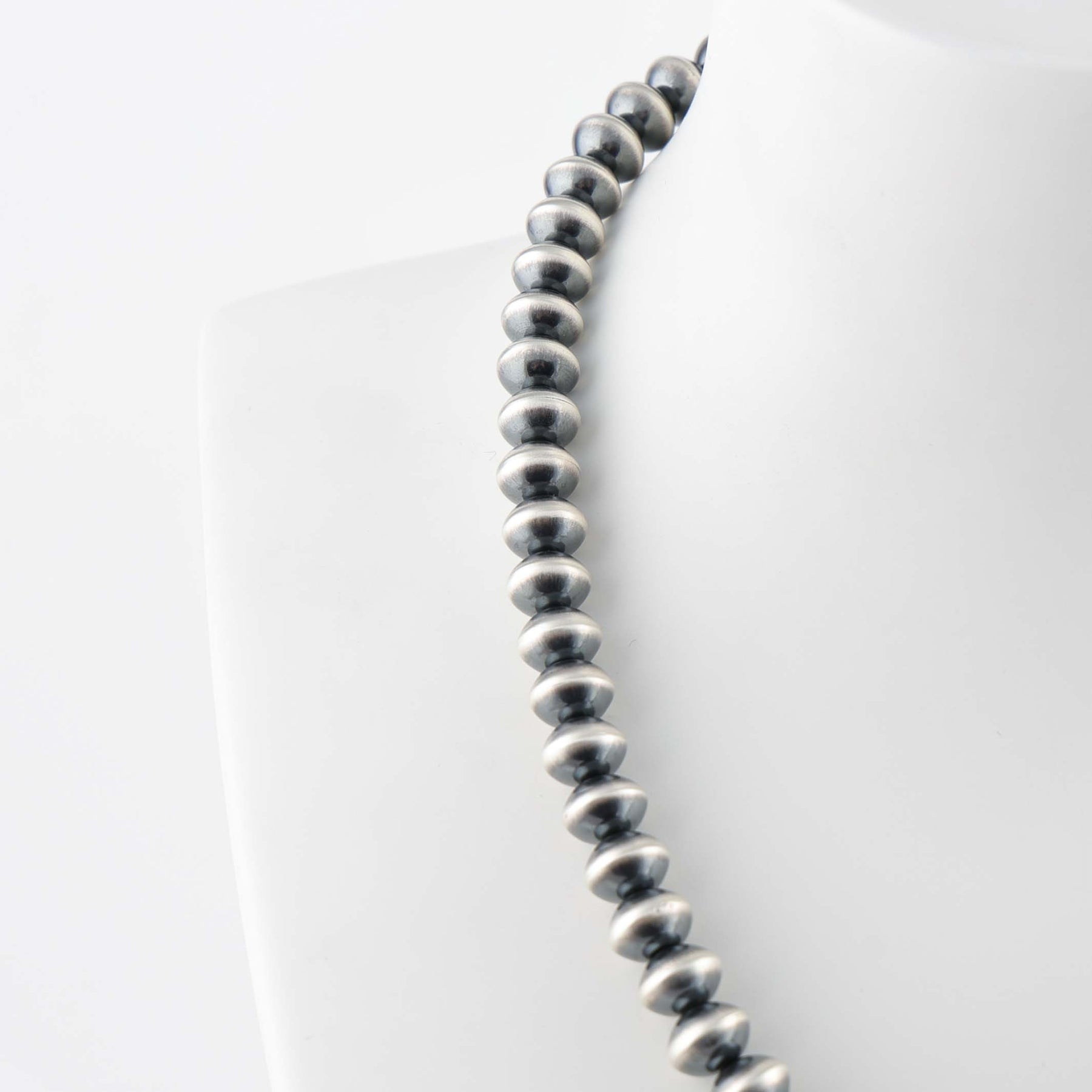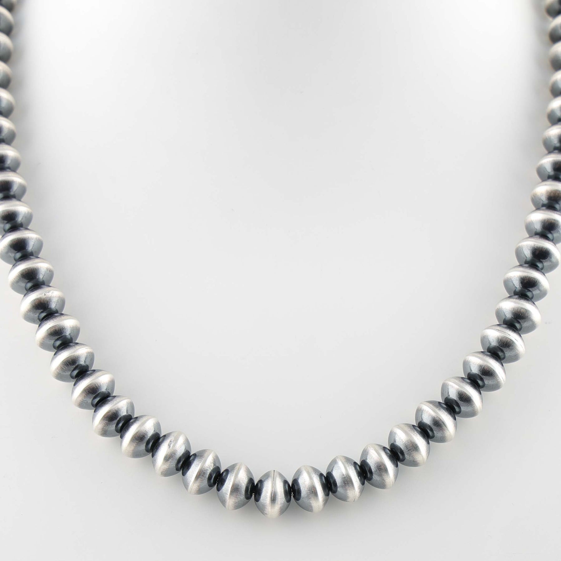 Sterling Silver Navajo Pearl Necklace with Handmade Beads in an Oxidized Finish.