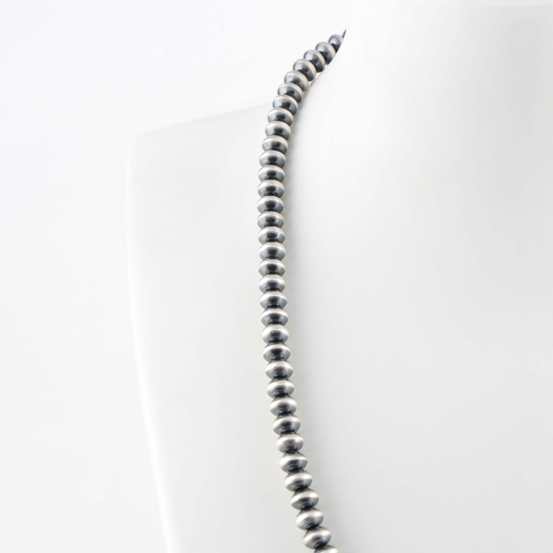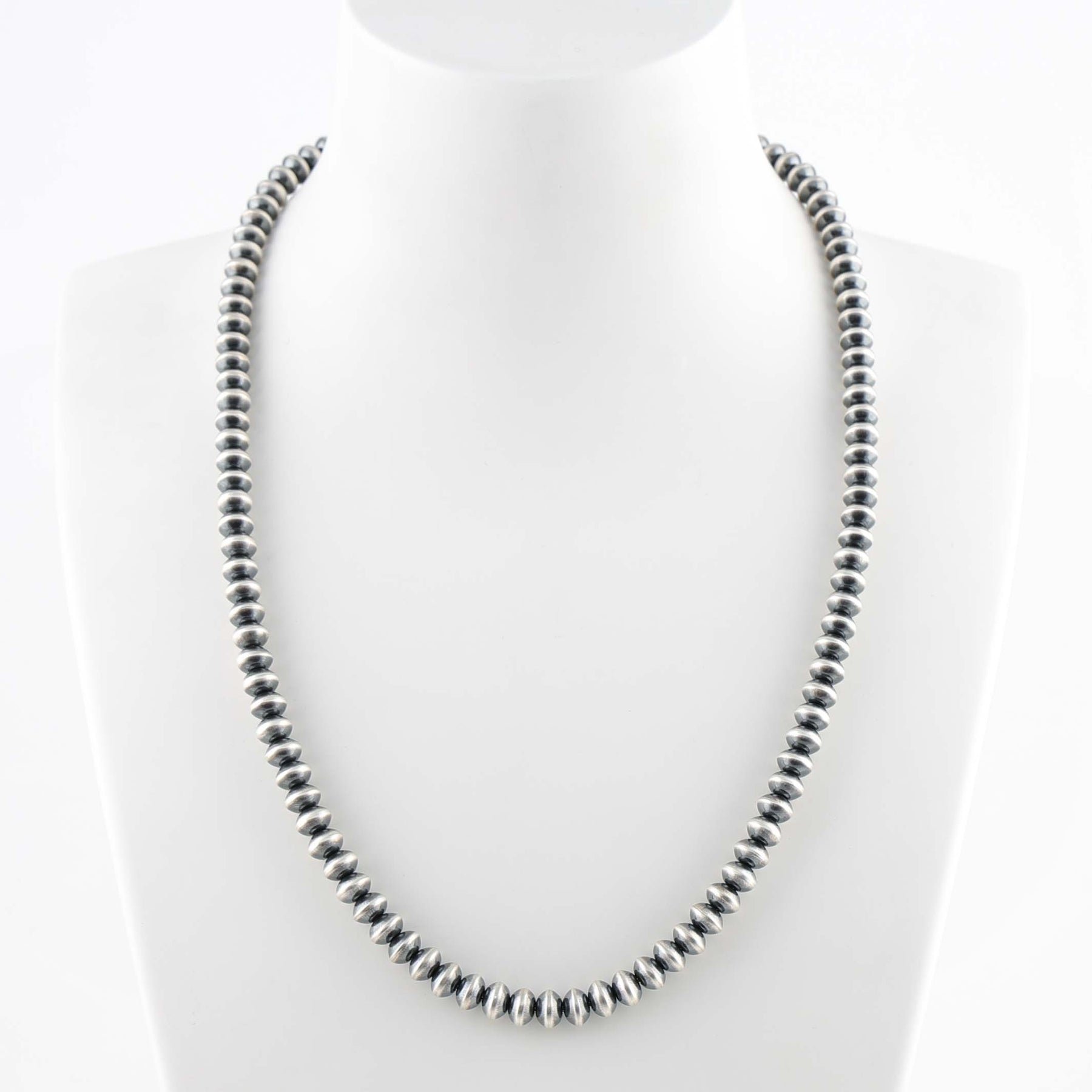 Sterling Silver Navajo Pearl Necklace with Handmade Beads in an Oxidized Finish.