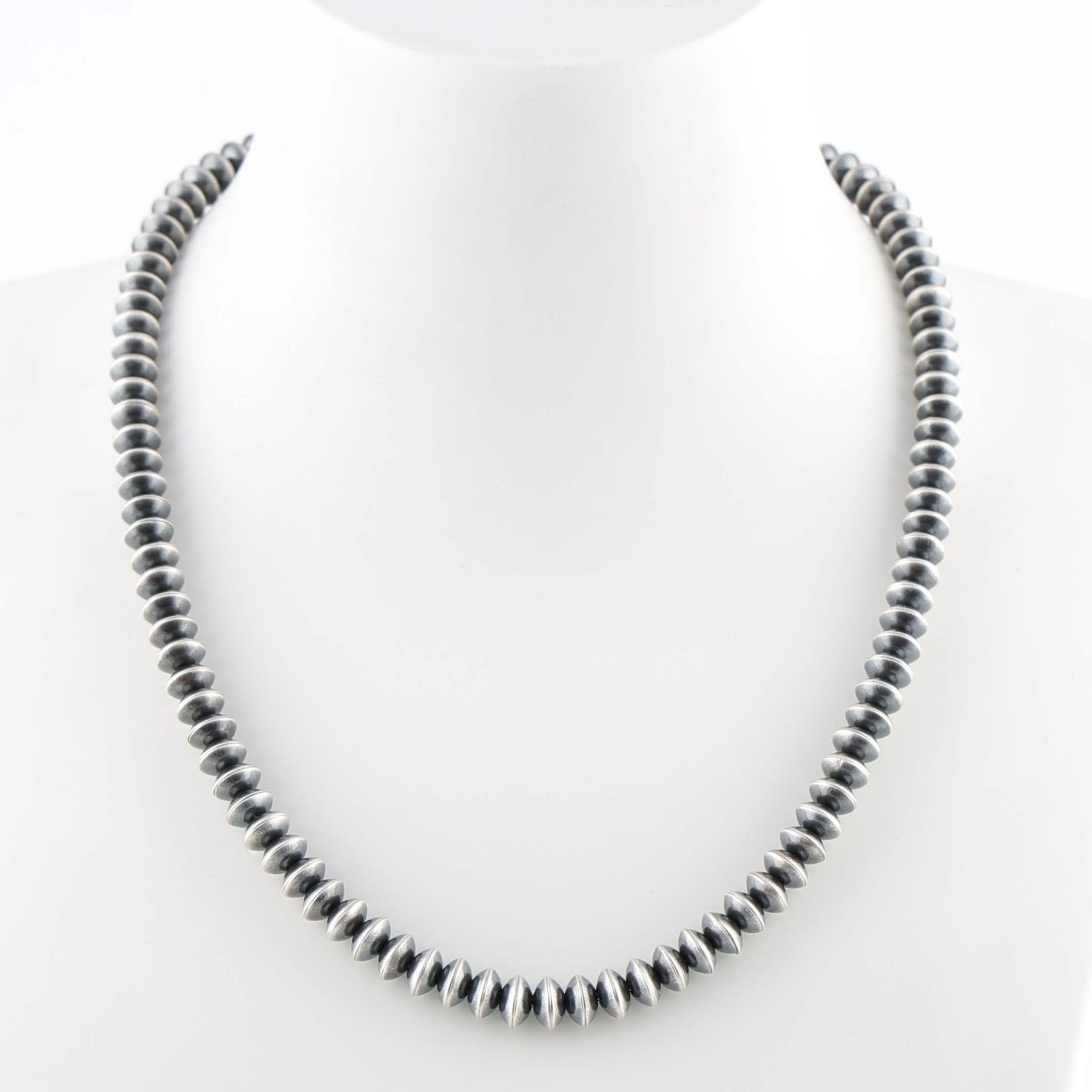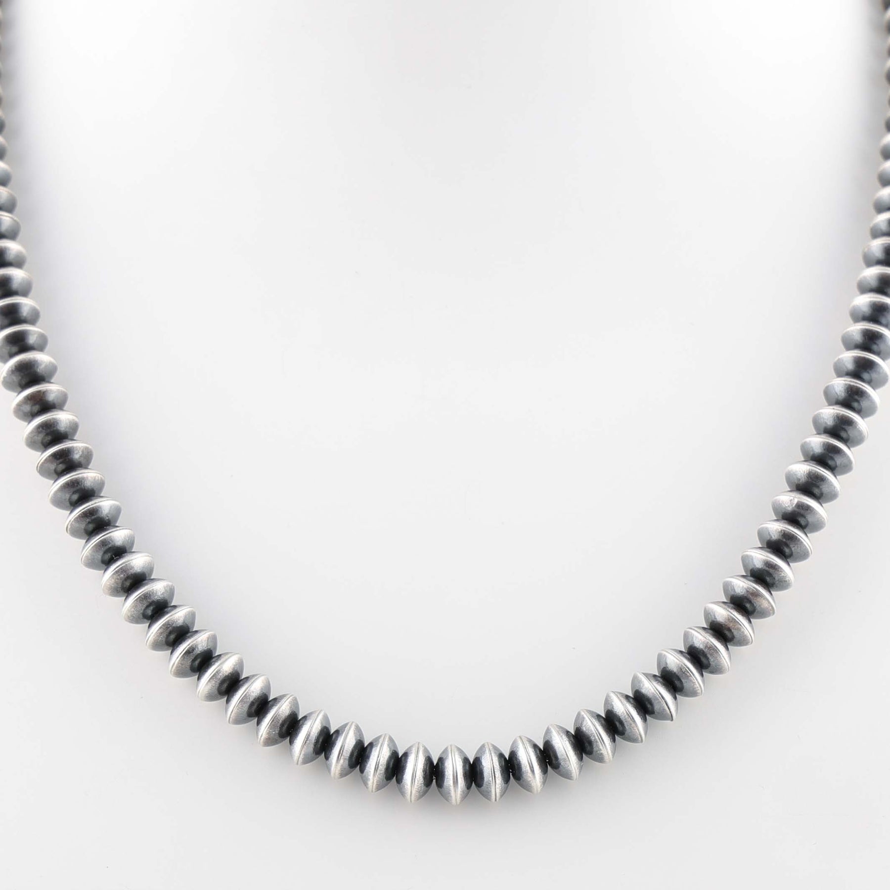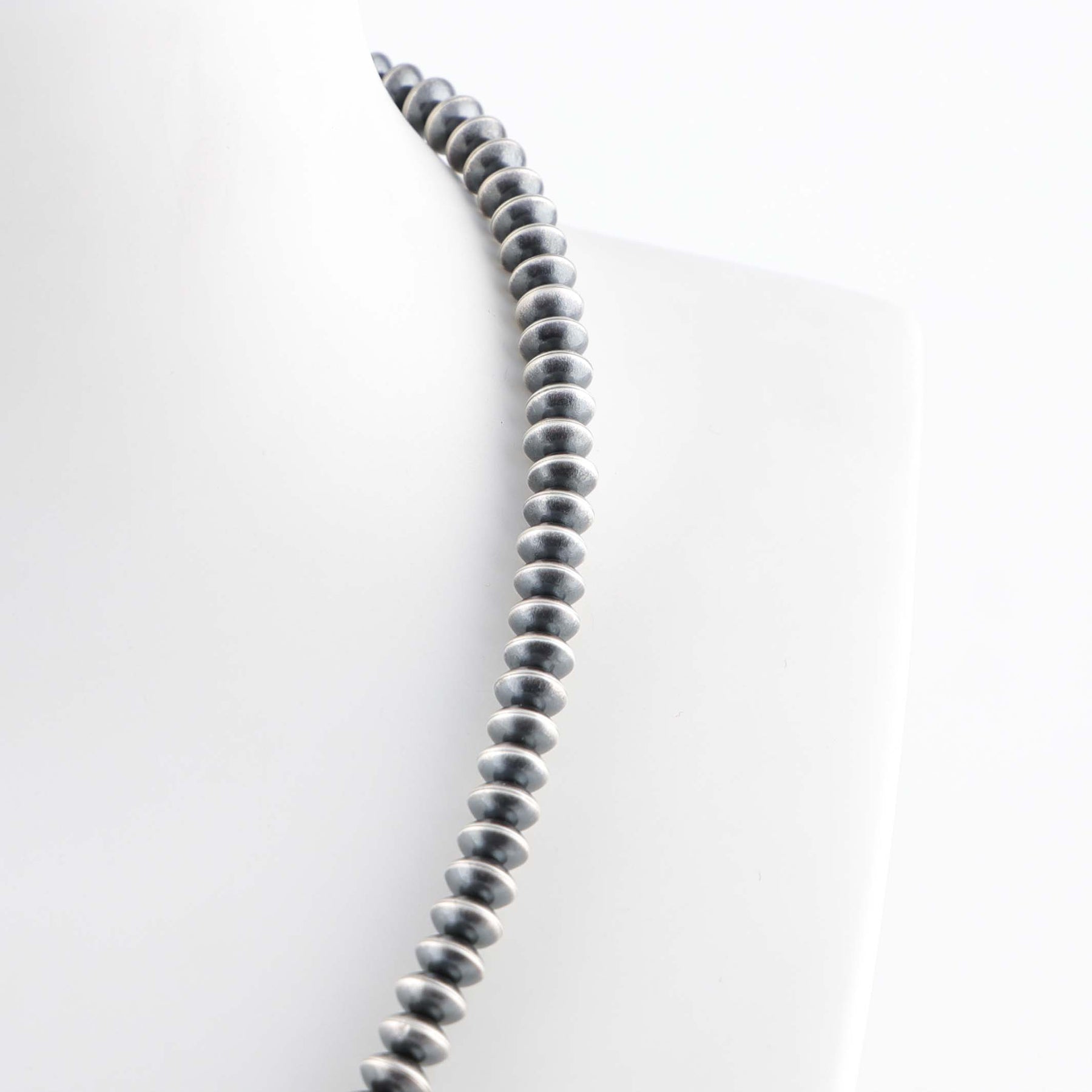 Sterling Silver Navajo Pearl Necklace with Handmade Beads in an Oxidized Finish.