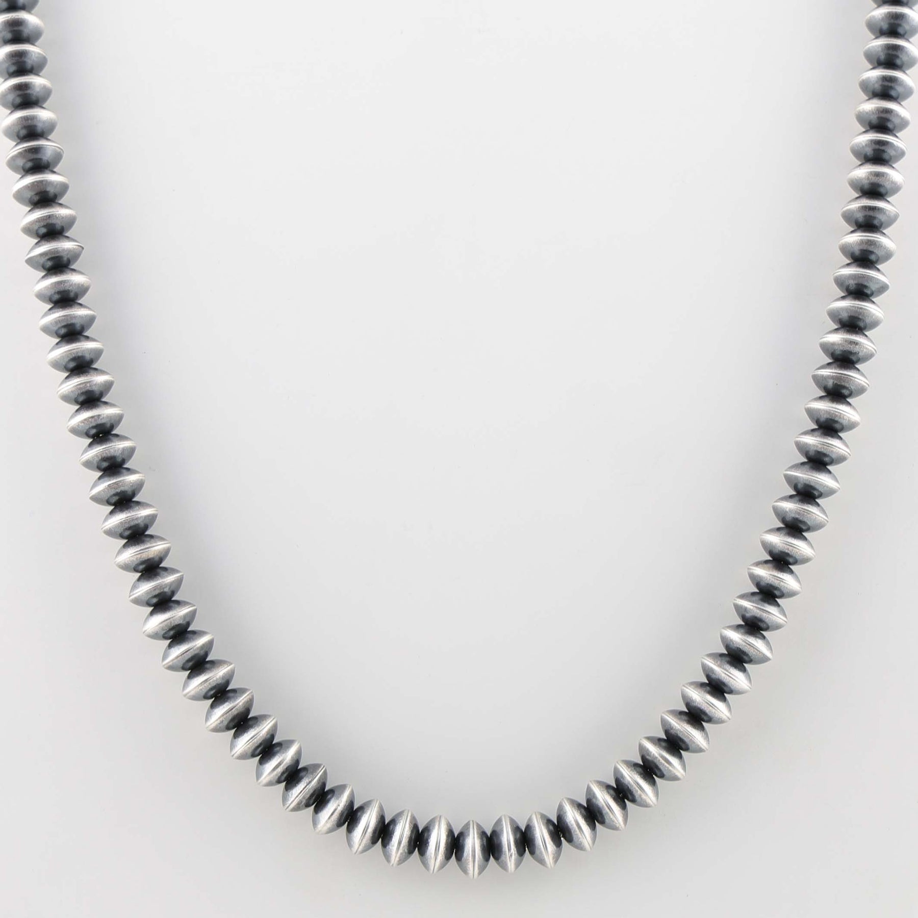 Sterling Silver Navajo Pearl Necklace with Handmade Beads in an Oxidized Finish.