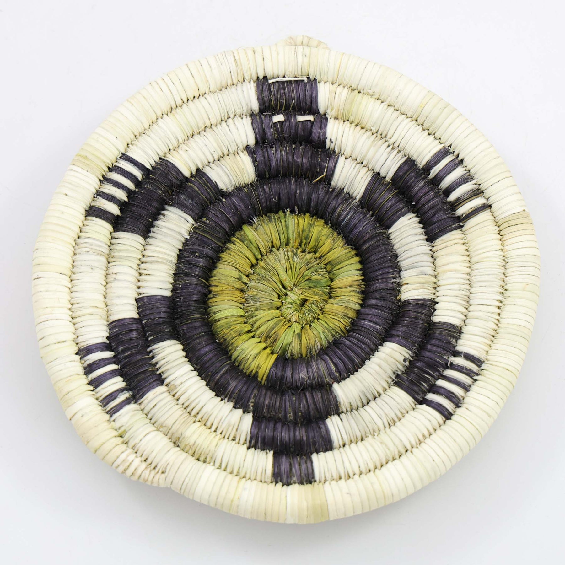 Hand-coiled Hopi yucca and beargrass basketry plaque, featuring natural dyes to create a turtle design, symbolizing longevity, stability, and Mother Earth, representing the foundation of life and the enduring strength of the land that supports the Hopi people.
