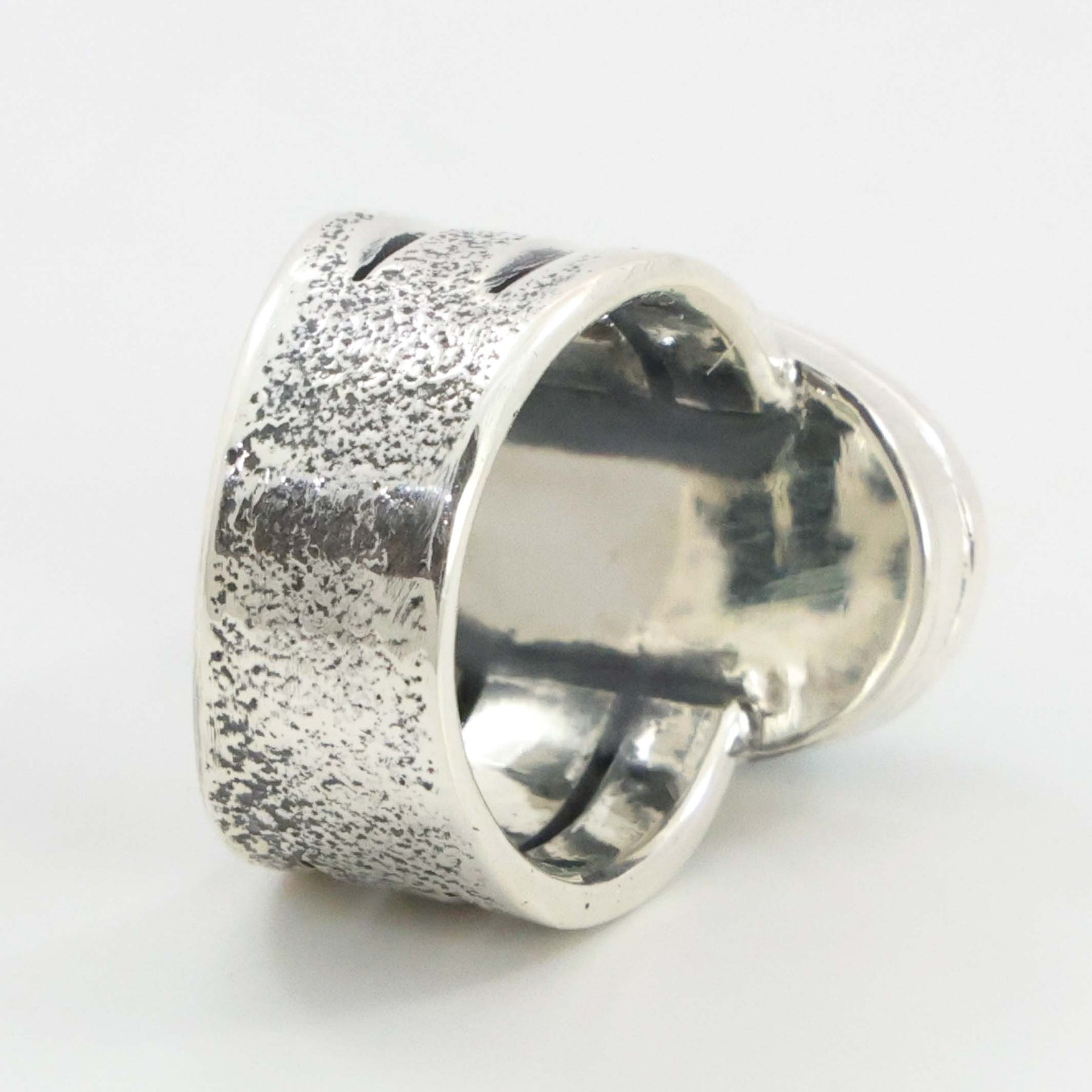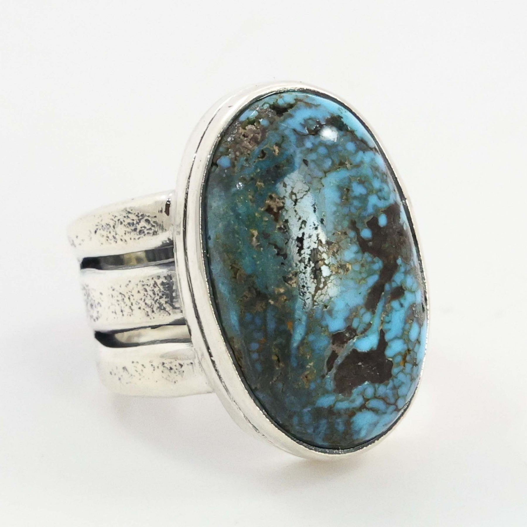 Sterling Silver Ring with a Tufa Cast Split Band and set with Natural Blue Diamond Turquoise from Nevada.