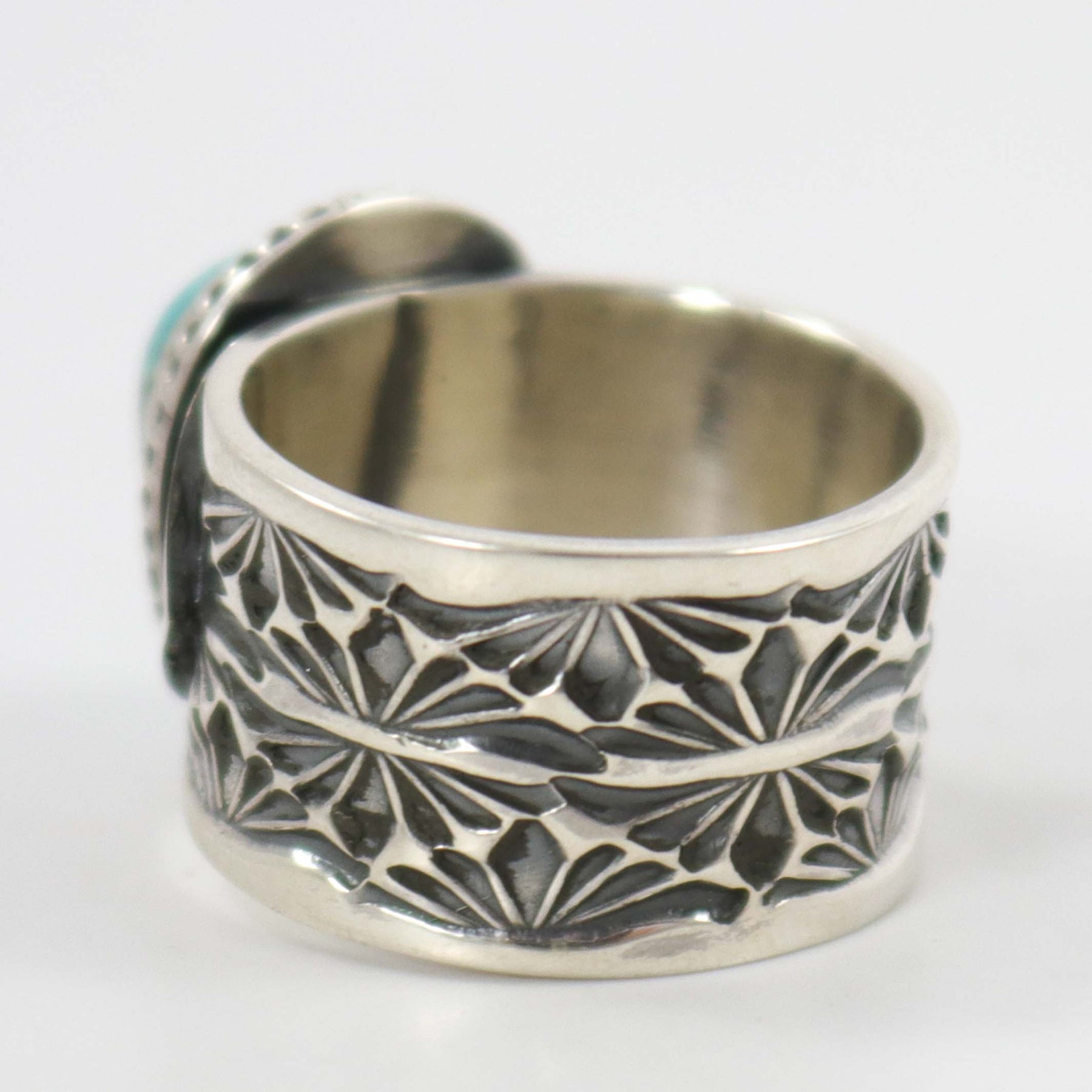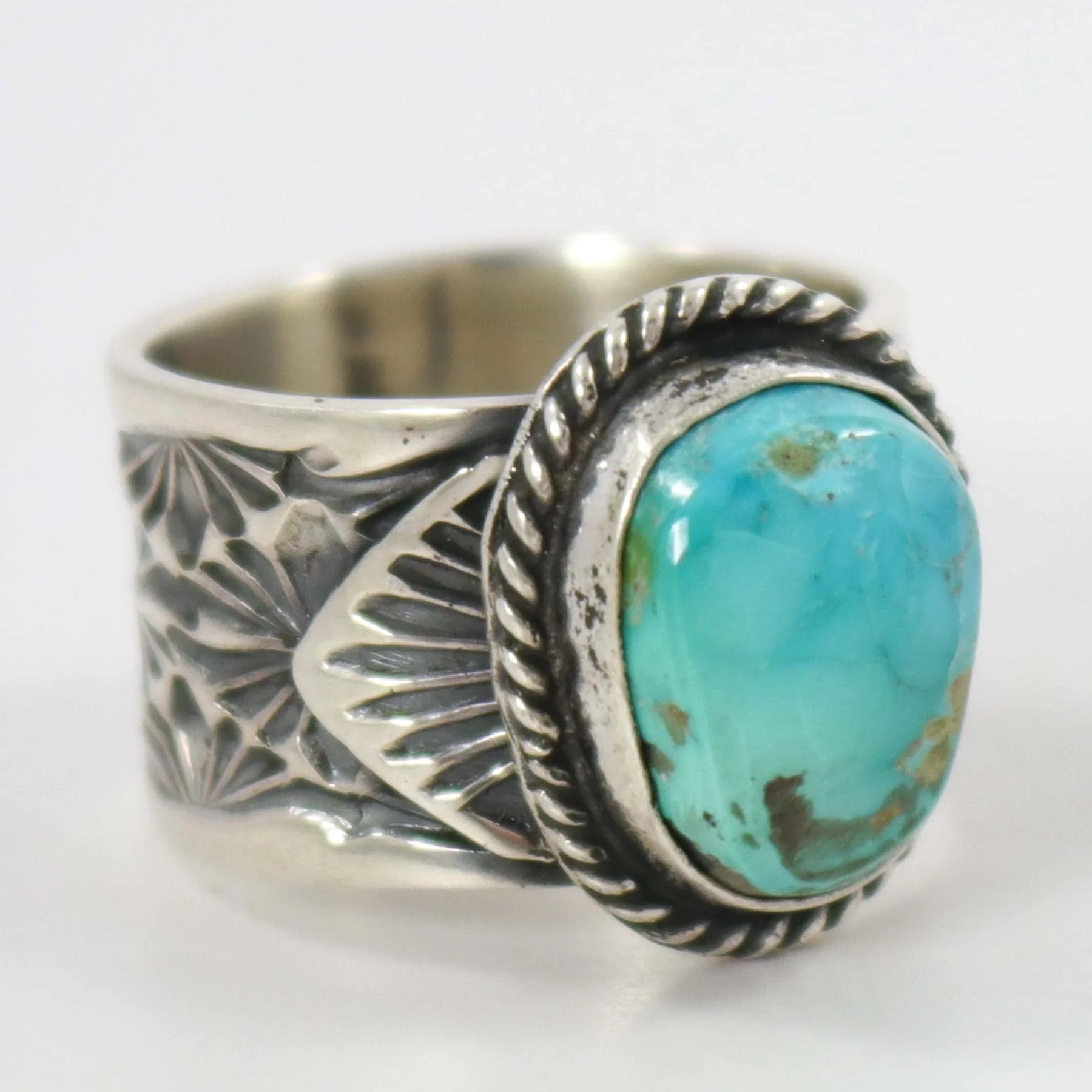 Sterling Silver Ring with Hand-Stamped Designs and set with Natural Royston Turquoise from Nevada.