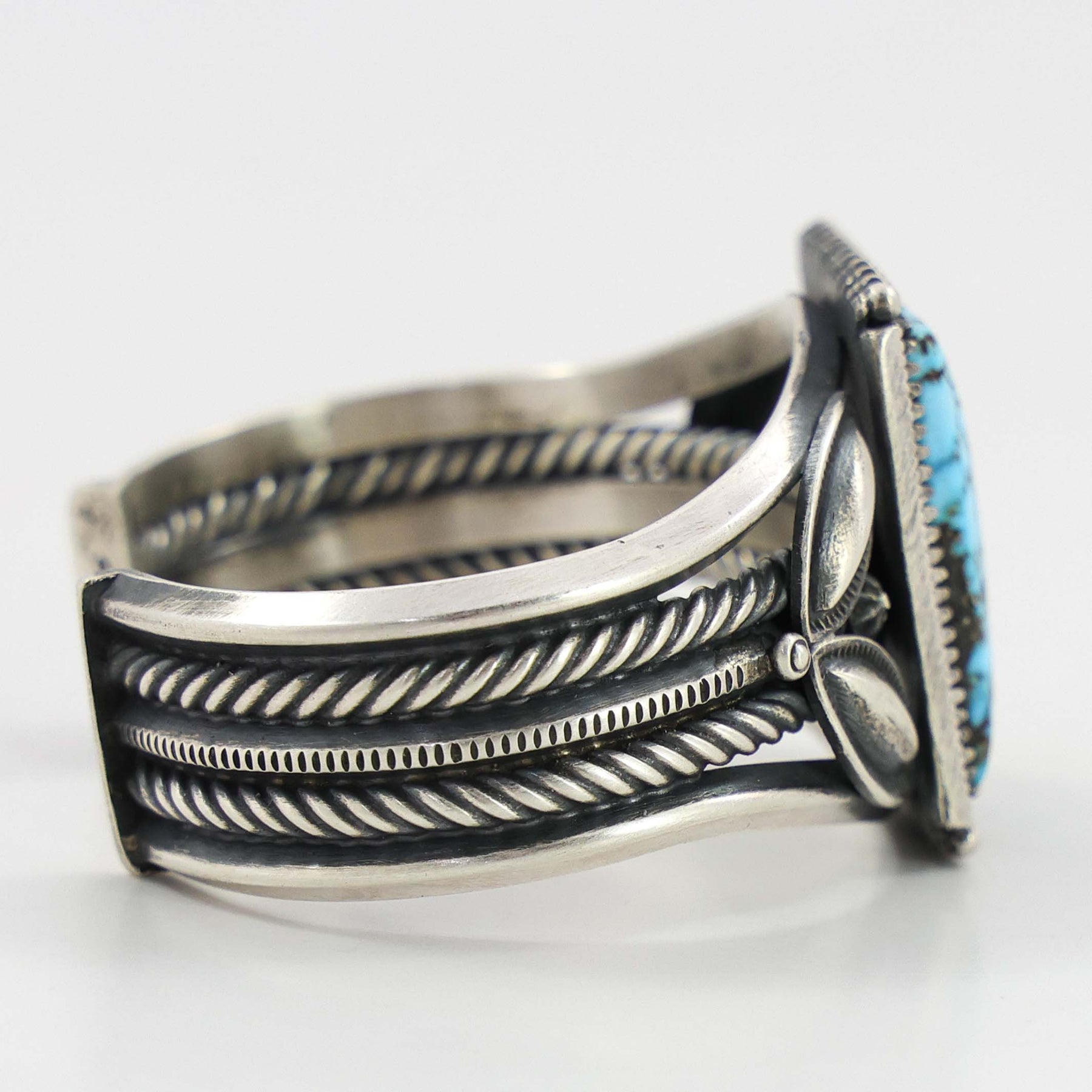 Sterling Silver Cuff Bracelet with Twisted Rope Designs and set with Natural Kingman Turquoise from Arizona.