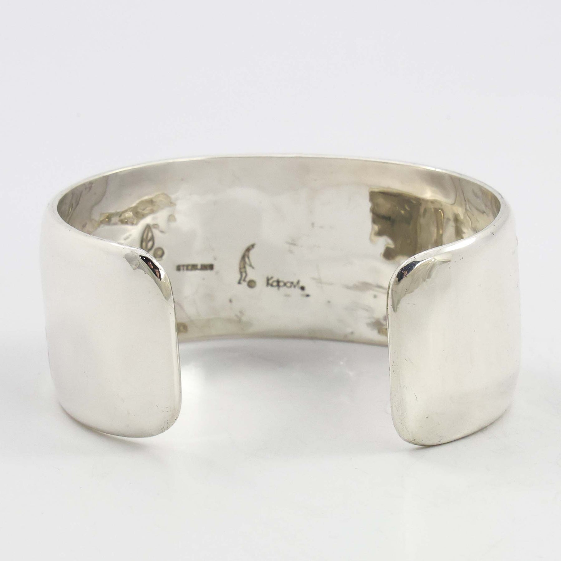 Sterling silver overlay cuff depicting a Hopi Pueblo village scene by silversmith John Coochyumptewa. The design features stepped pueblo village architecture with terraced rooftops and traditional building forms rendered in deeply oxidized recesses that highlight the crisp, hand-cut overlay. Coochyumptewa’s work is known for its balanced composition and fine texturing, and this cuff shows strong attention to detail in the stone-like wall patterns and precise geometric lines. A classic example of Hopi overlay technique, it carries the quiet strength and architectural harmony associated with village imagery.