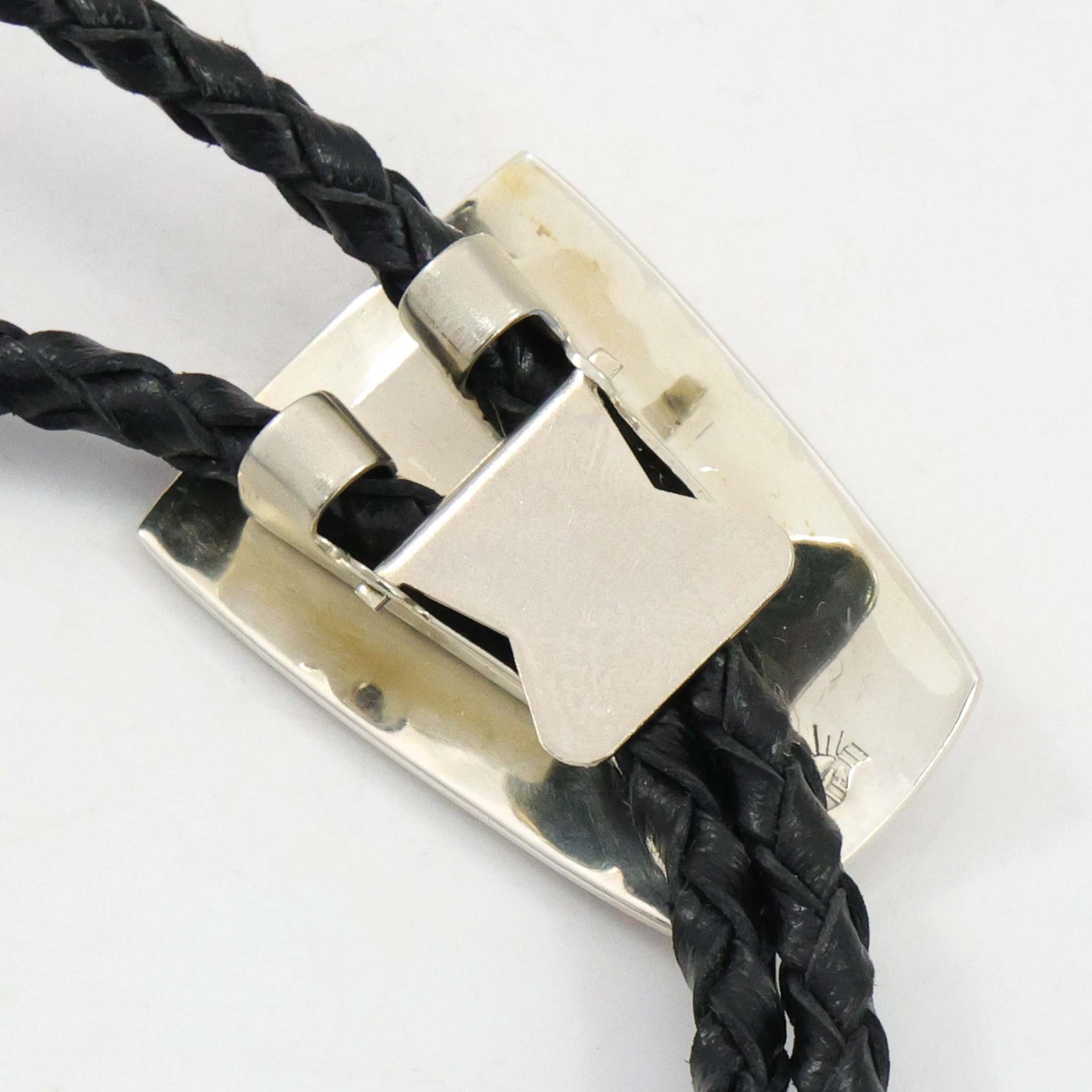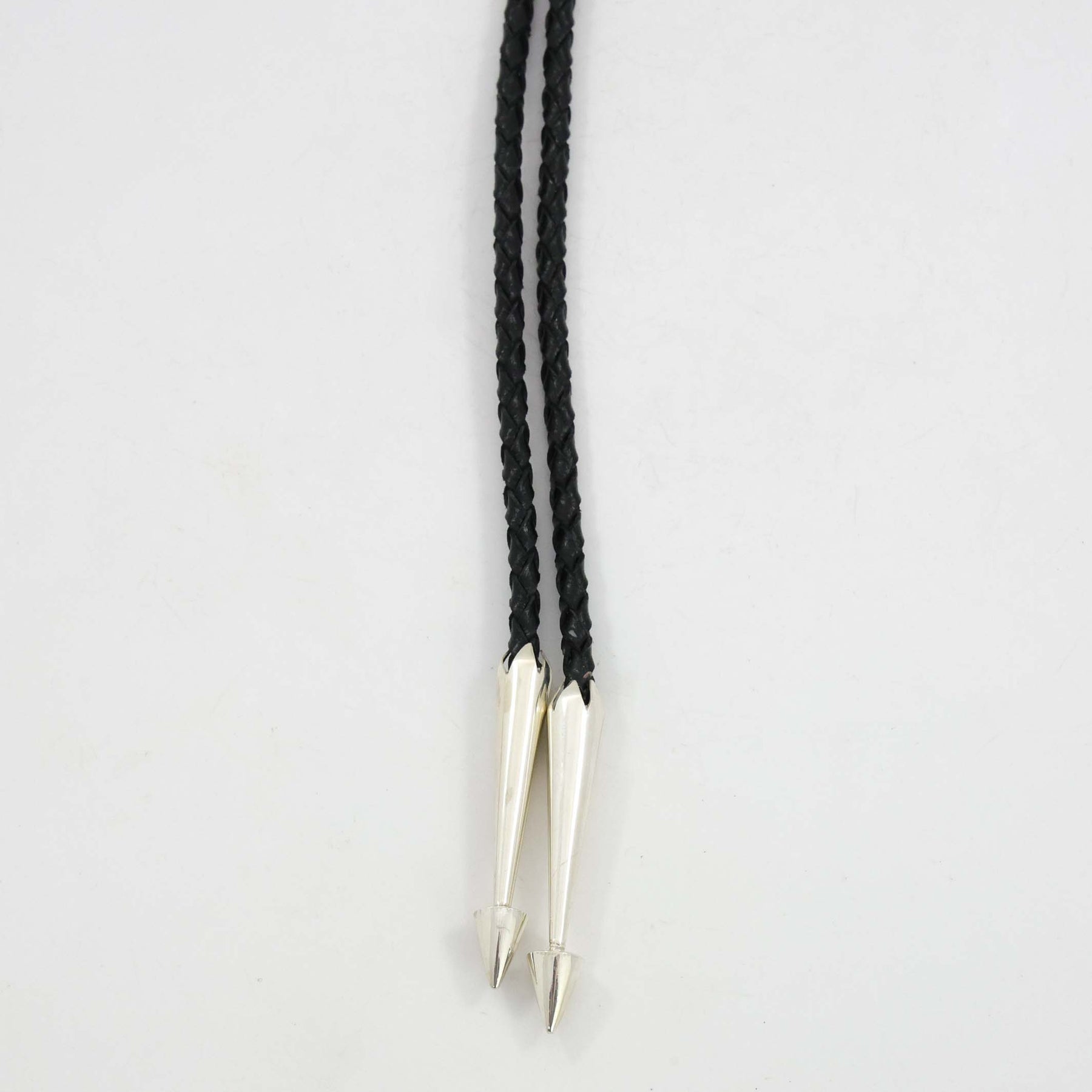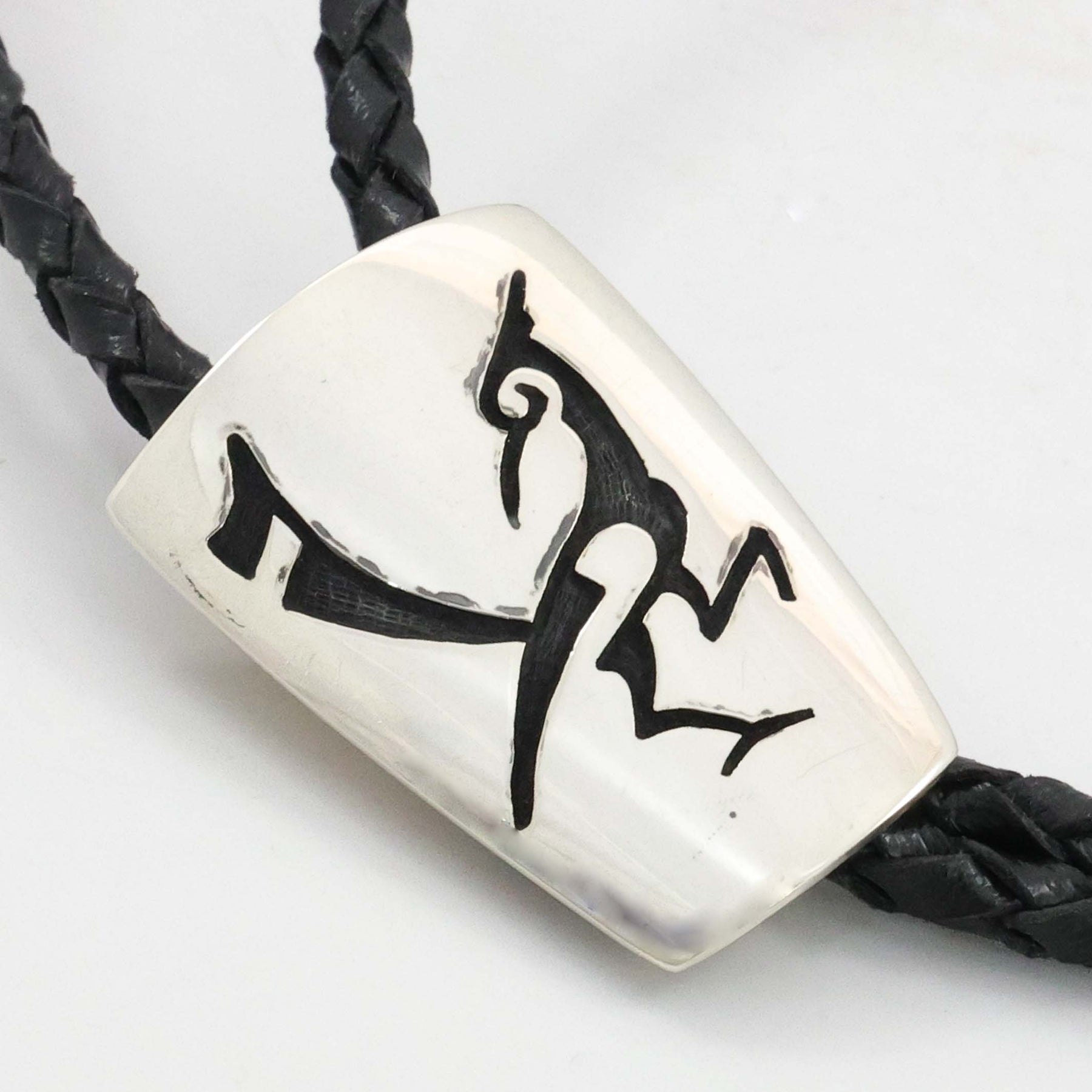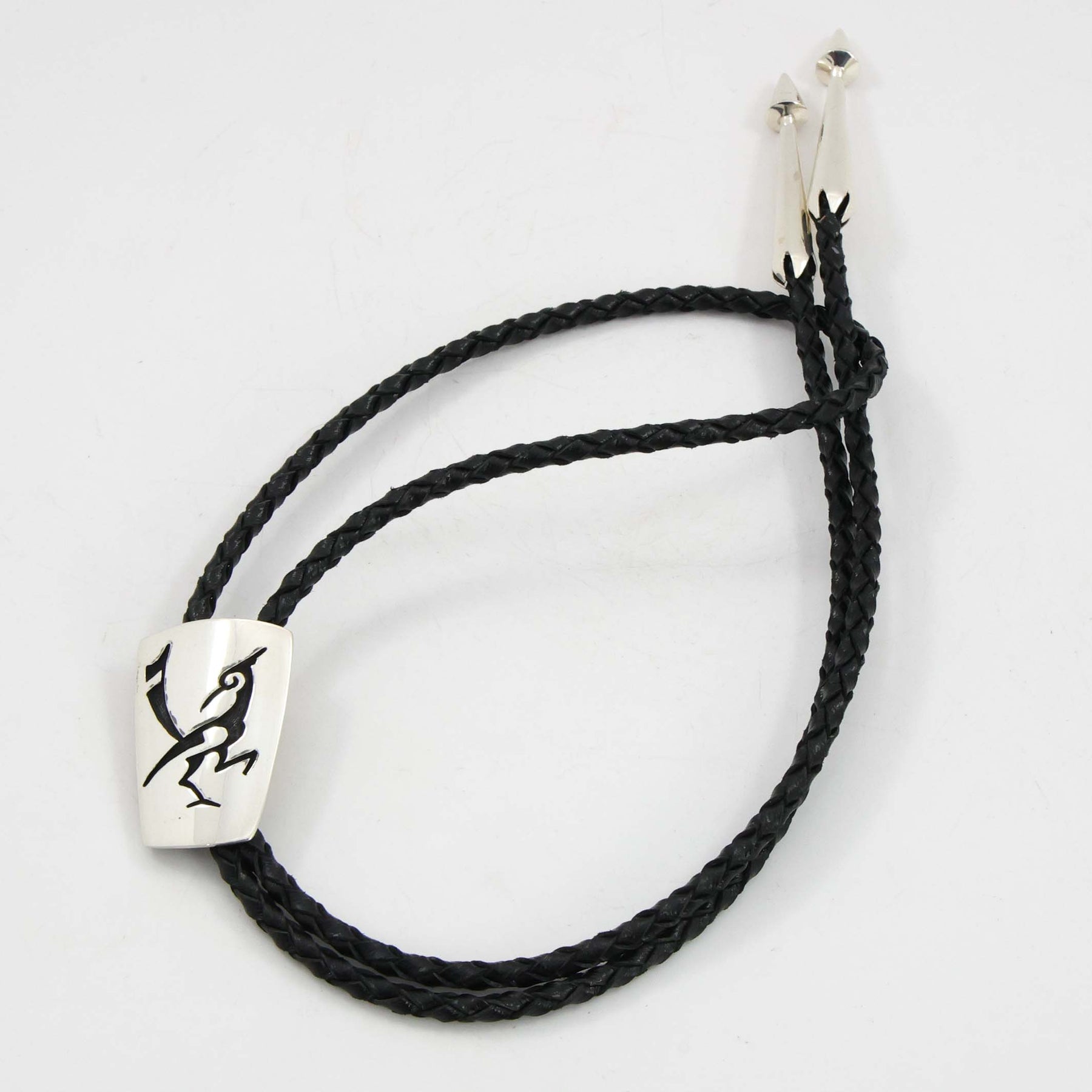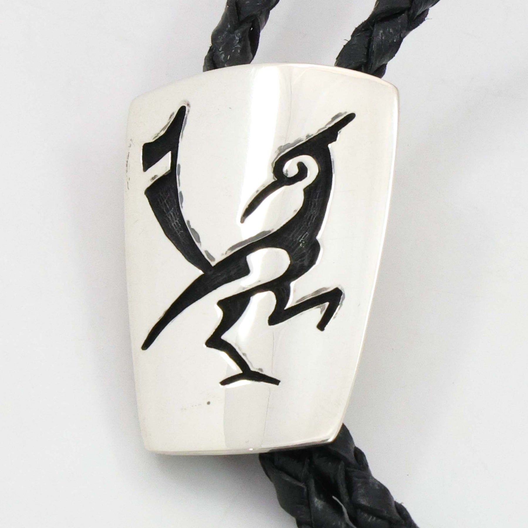 Sterling Silver Bola Tie with Hopi Overlaid Roadrunner Design. This bola tie has a clamp backing, handmade tips, and a black leather cord.