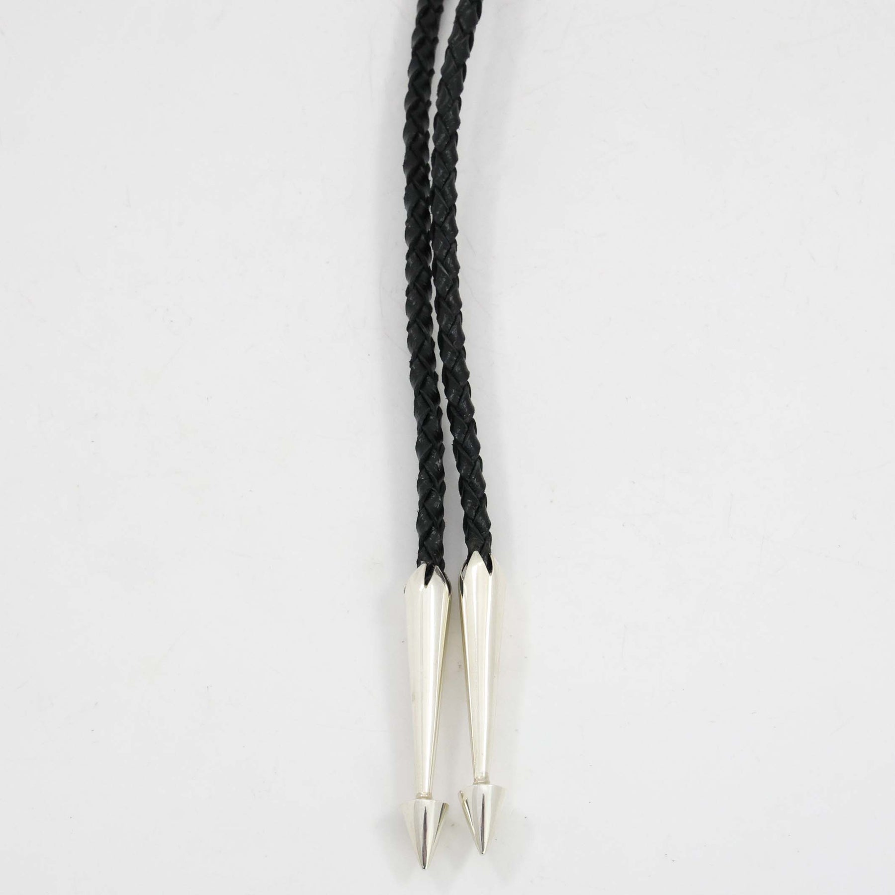 Sterling Silver Bola Tie with Hopi Overlaid Sunface (Dawa) Design. This bola tie has a clamp backing, handmade tips, and a black leather cord.