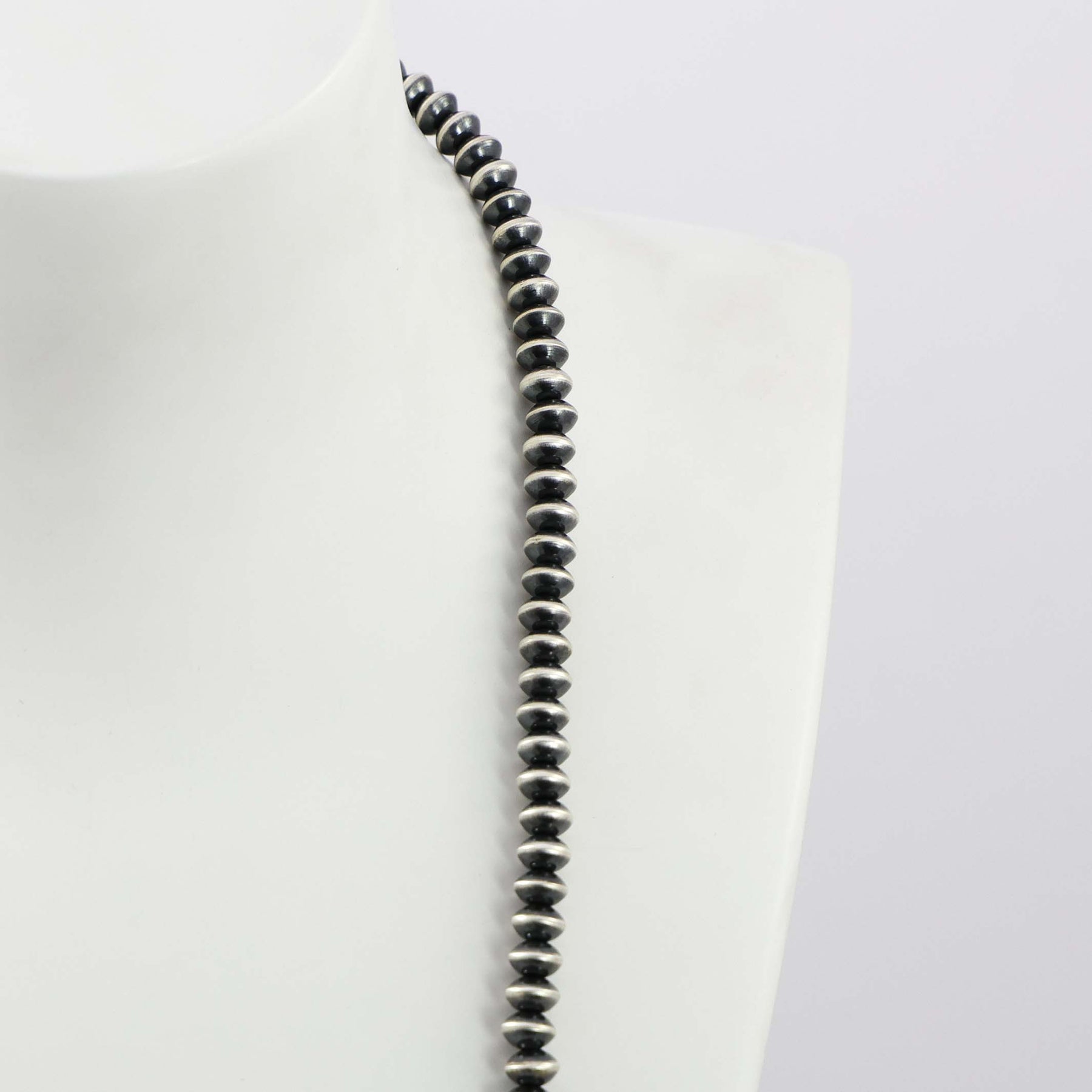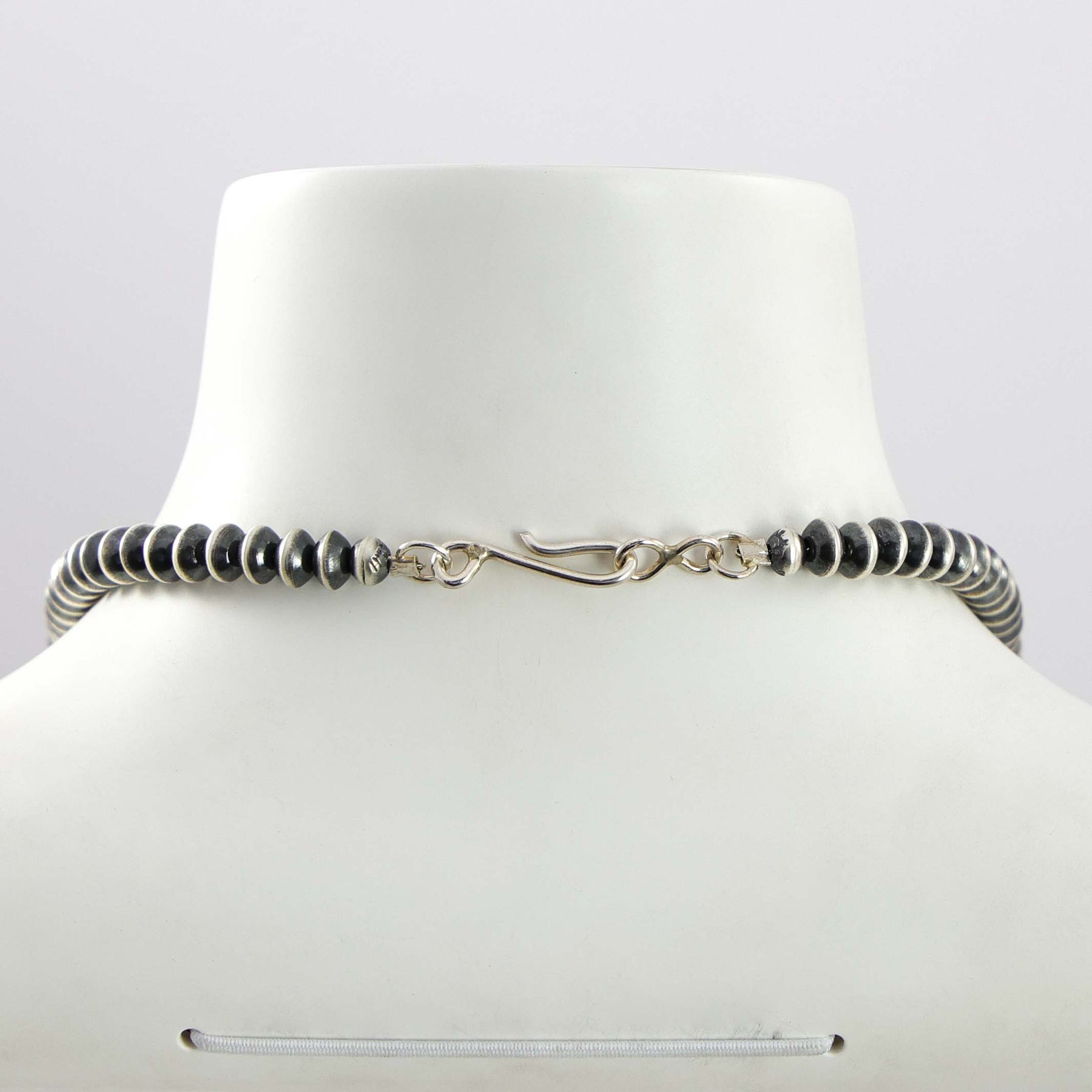 Sterling Silver Navajo Pearl Necklace with Handmade Beads in an Oxidized Finish.