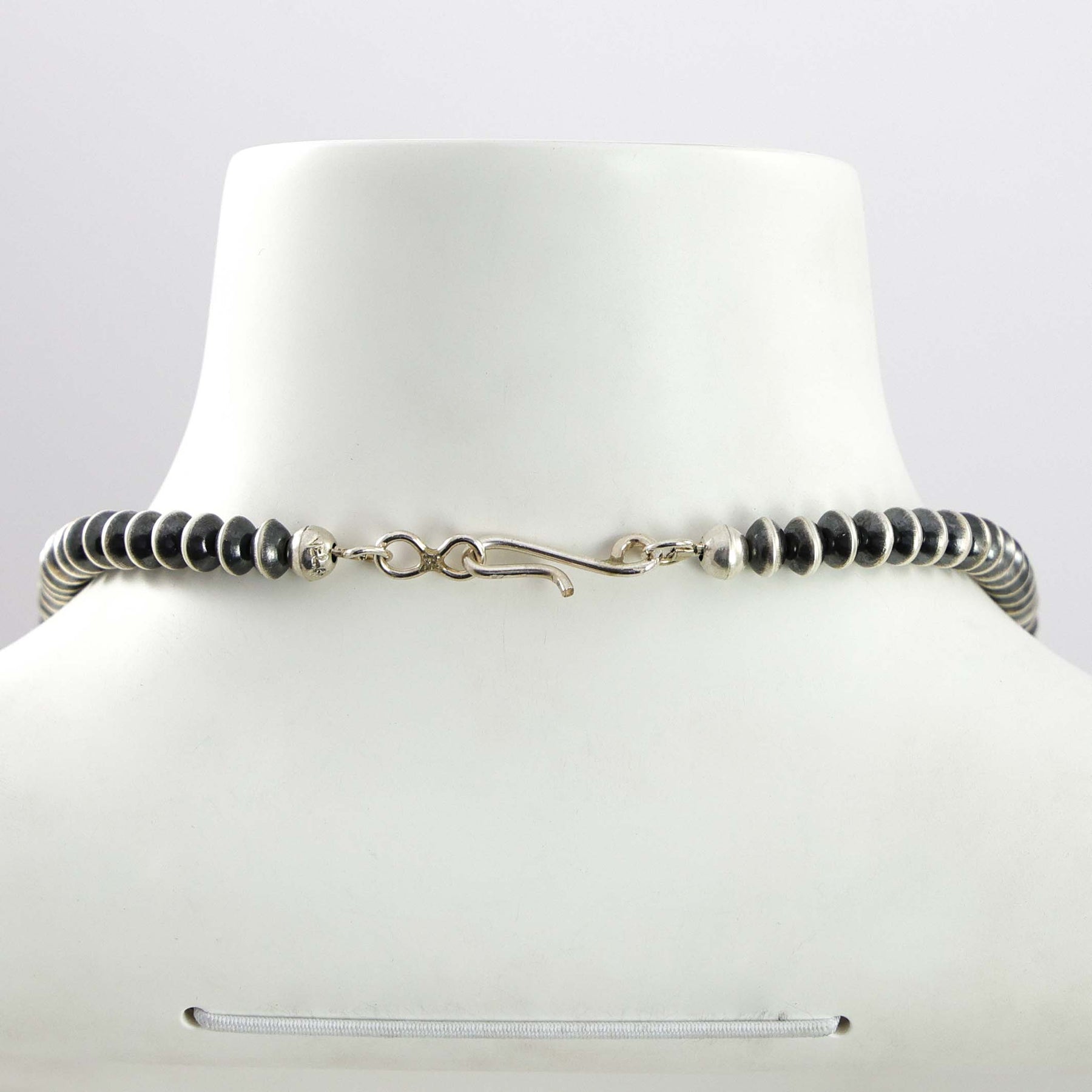 Sterling Silver Navajo Pearl Necklace with Handmade Beads in an Oxidized Finish.
