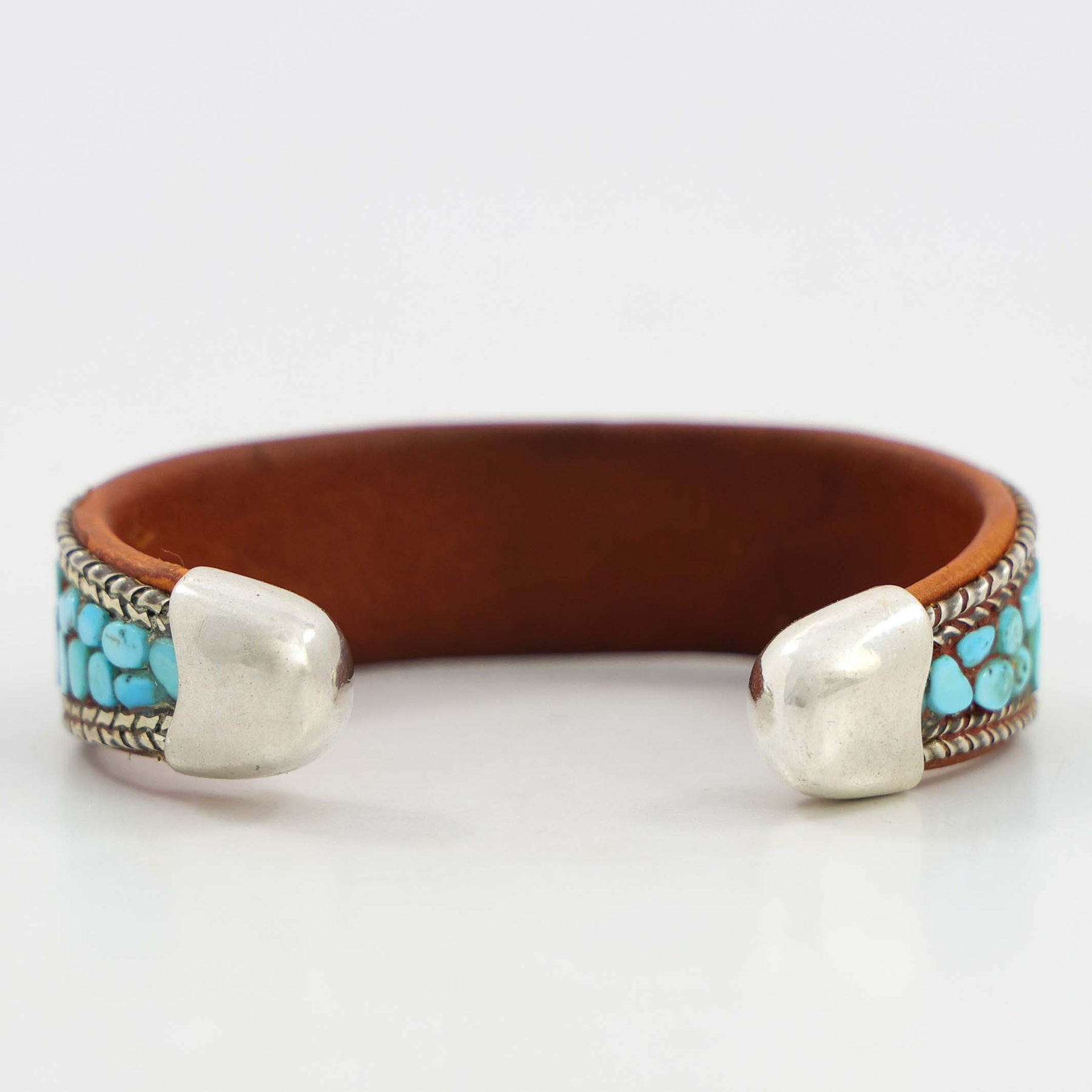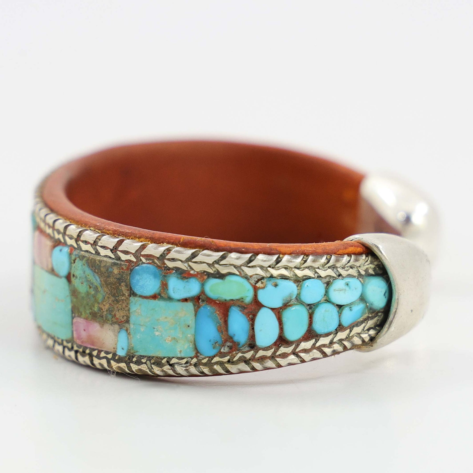 Sterling Silver, Copper, and Goat Leather Cuff Bracelet with Mosaic Inlaid Turquoise and Spiny Oyster Shell.