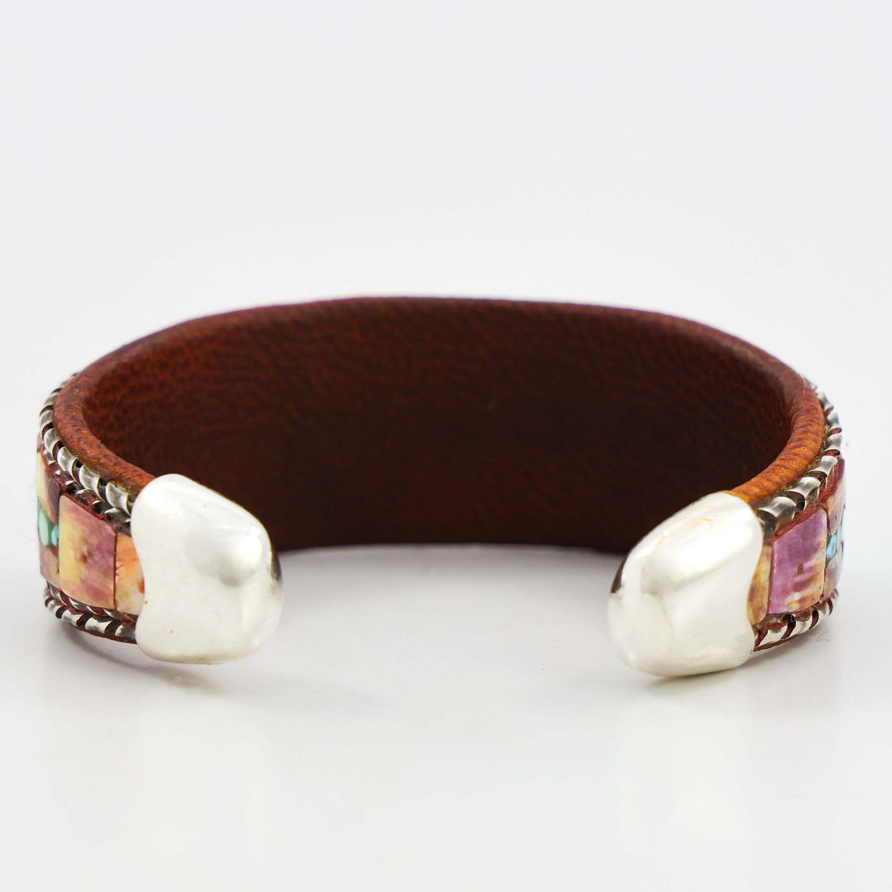 Sterling Silver, Copper, and Goat Leather Cuff Bracelet with Mosaic Inlaid Turquoise and Spiny Oyster Shell.