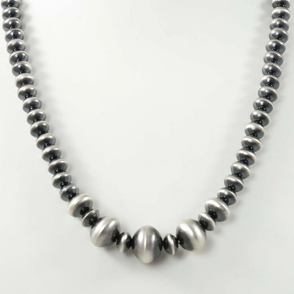 Single Strand Sterling Silver Navajo Pearl Necklace with Handmade Beads. This necklace features an oxidized finish.