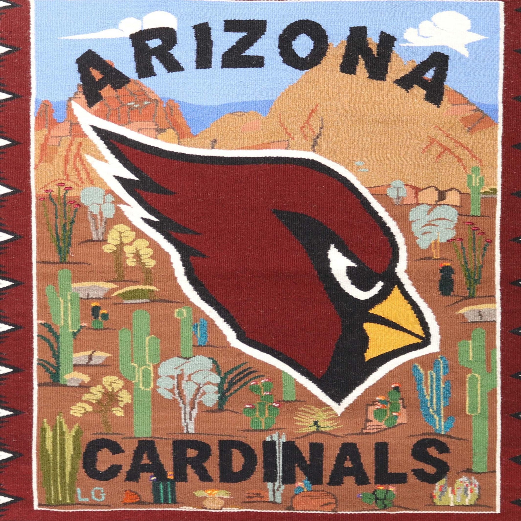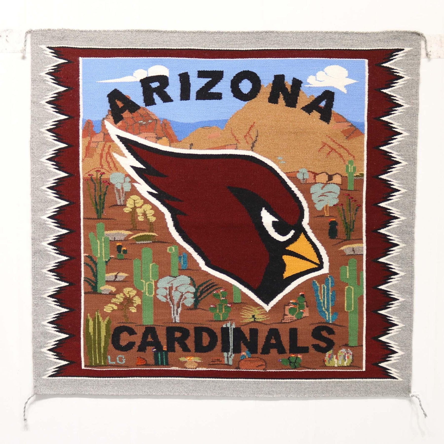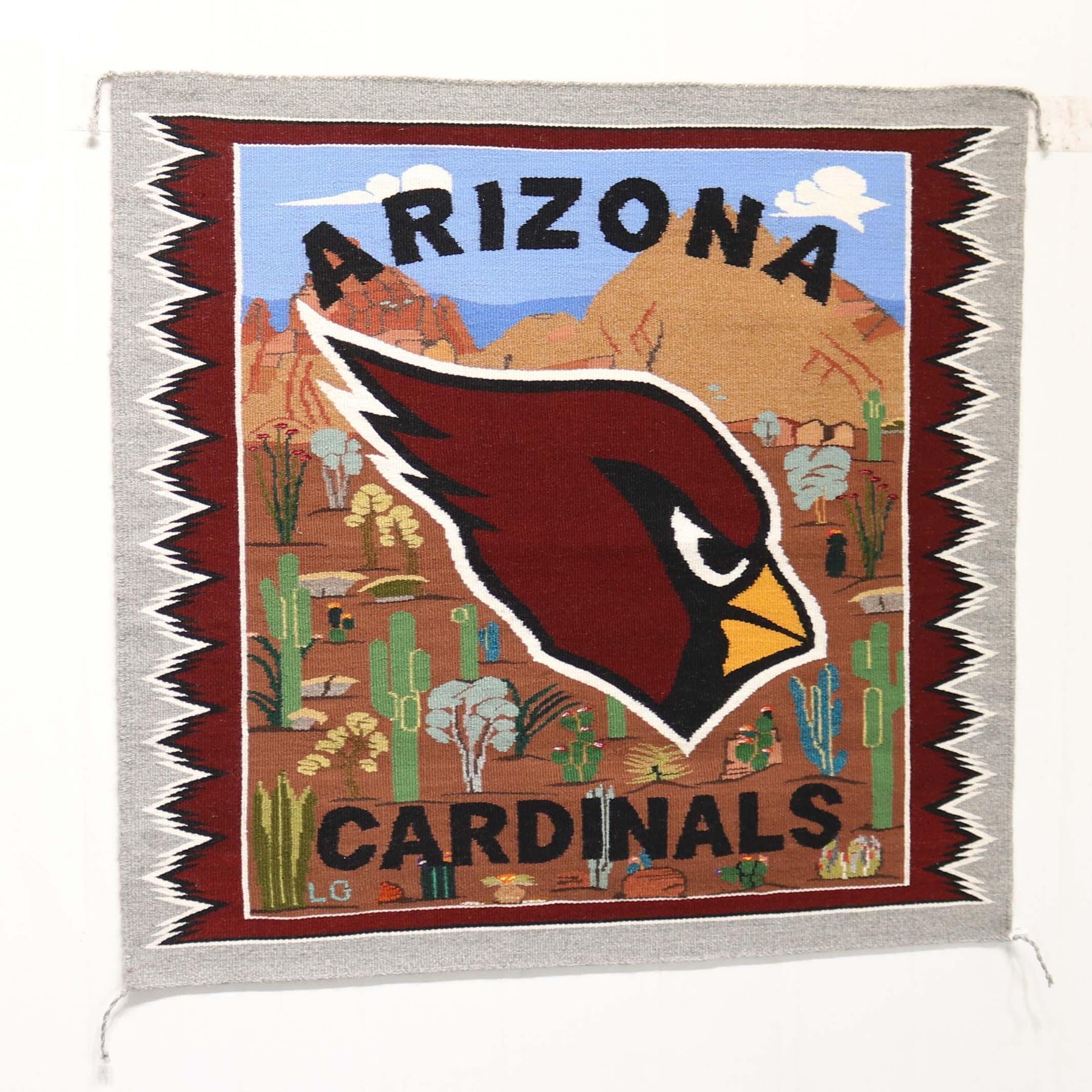 砂漠の風景を背景にアリゾナ・カージナルスを描いたナバホ族の絵画織り。