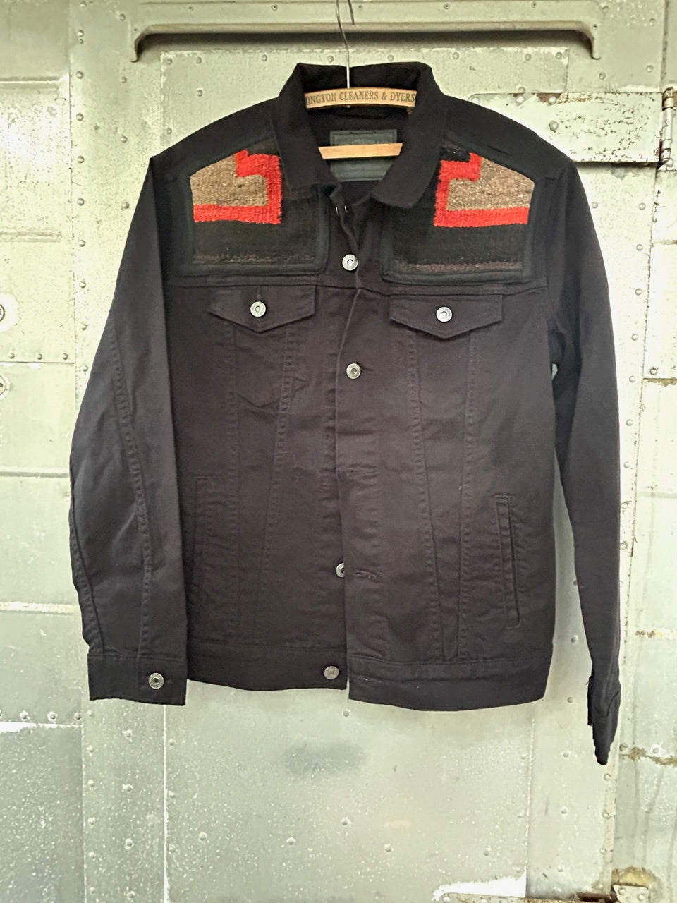 Black Denim Levi Jacket (Size Small) with an Antique (circa 1910s) Handwoven Navajo Weaving on the Front and Back.