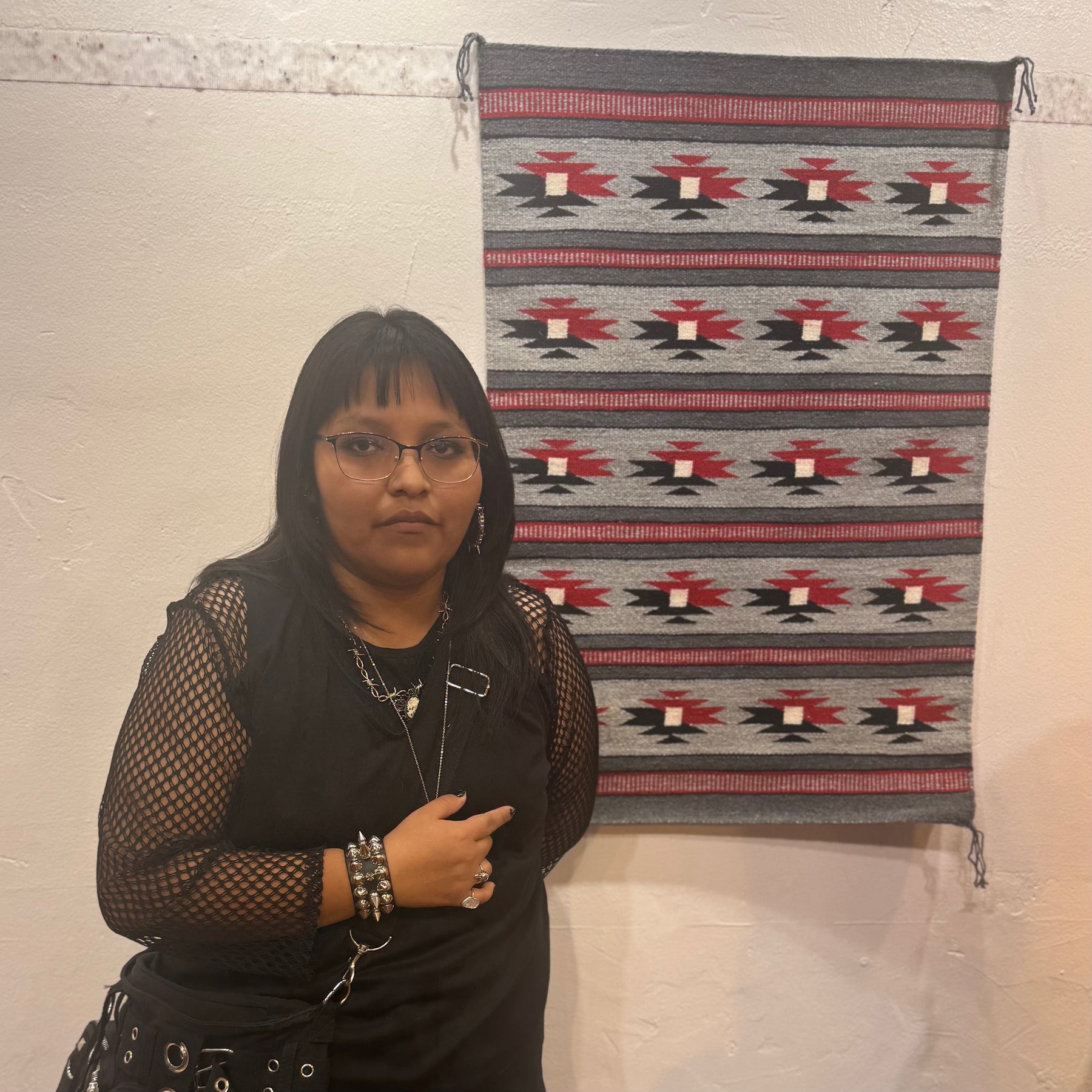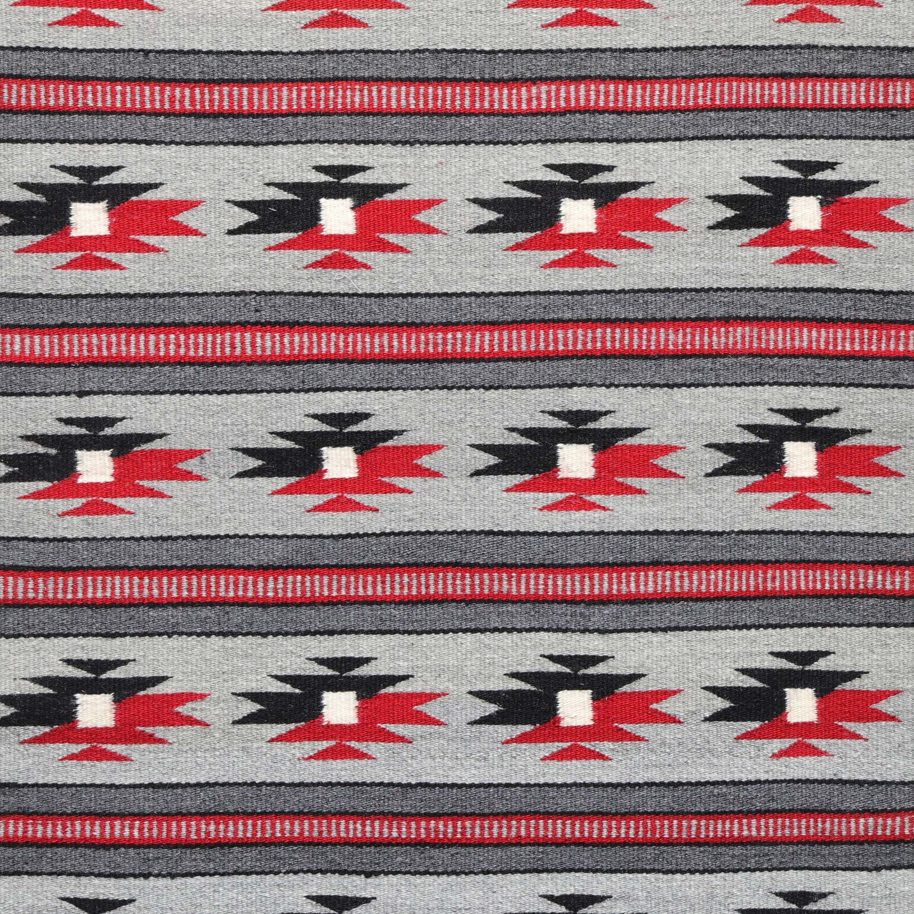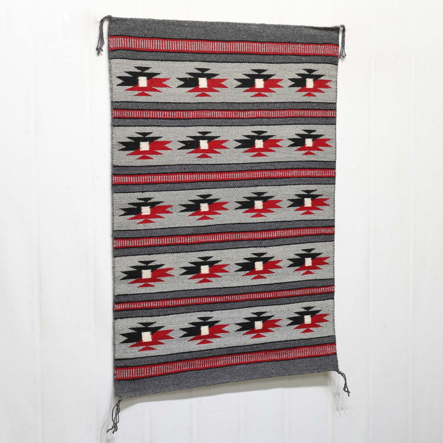 Navajo Chinle Weaving by Natasha Clark, Featuring a Clean Banded Design with Serrated Diamonds. Handwoven with processed wool using natural undyed wool colors and a bold aniline red for accents.