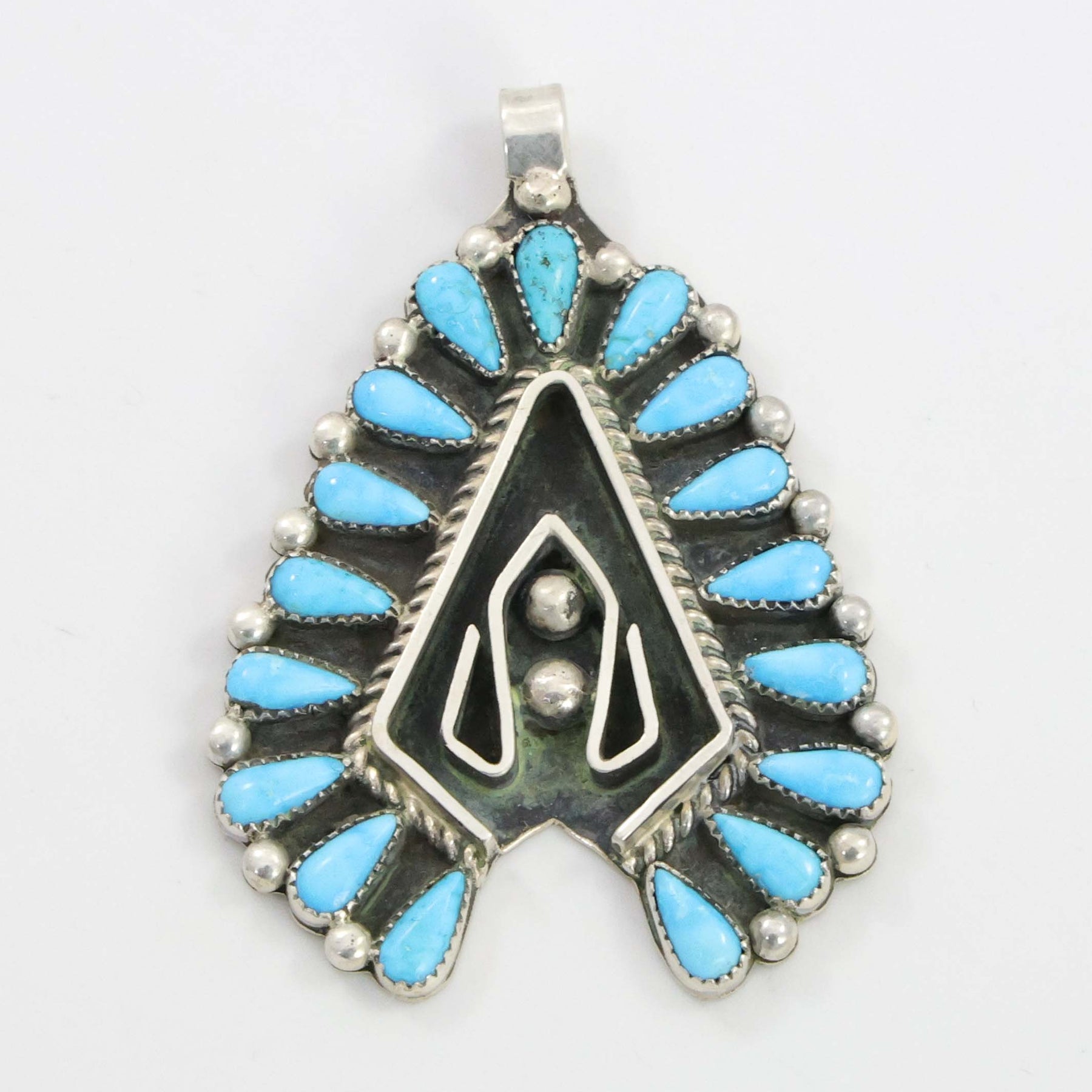 Sterling Silver Pendant set with Hand-Cut Natural Kingman Turquoise. This pendant also features an appliqué bent wire design.