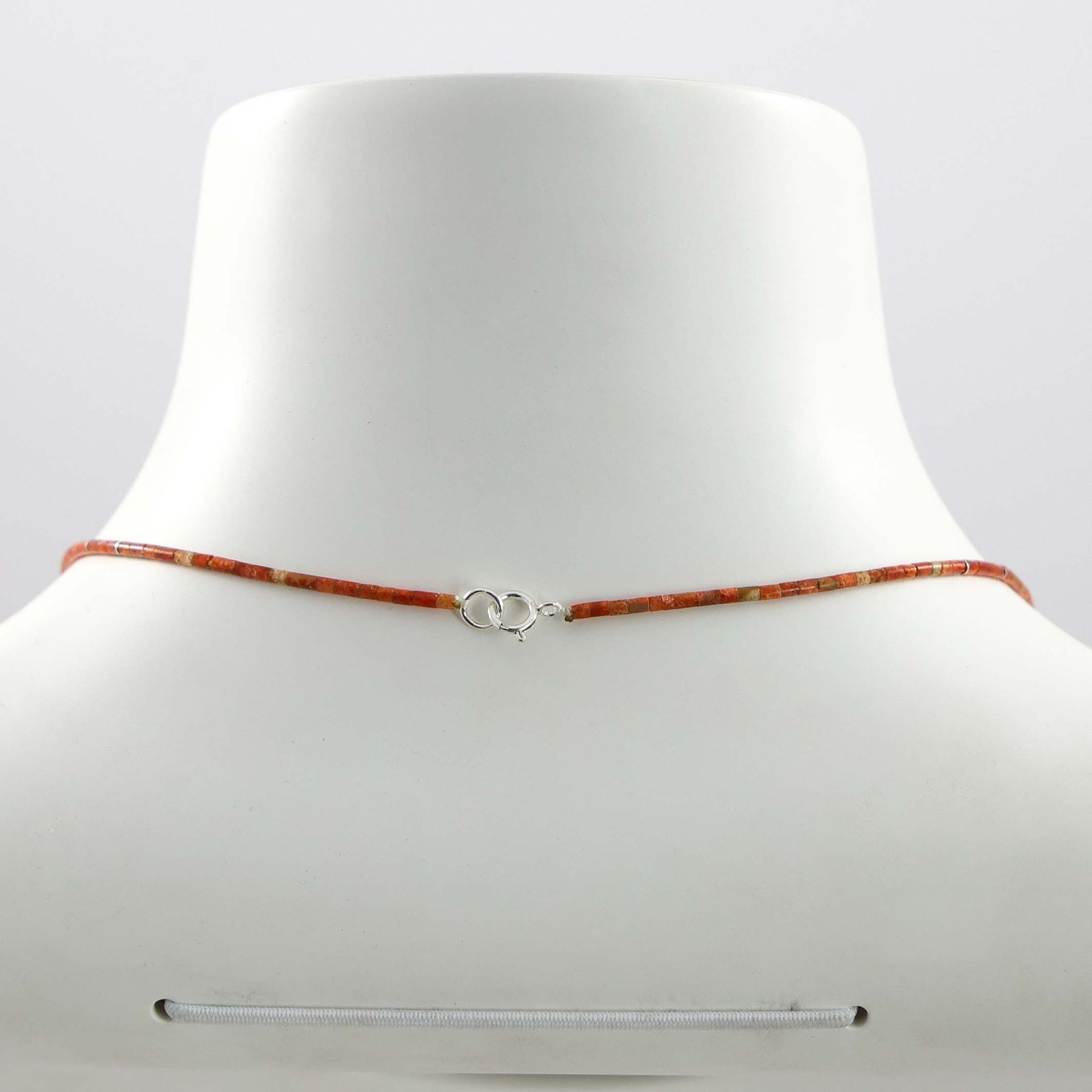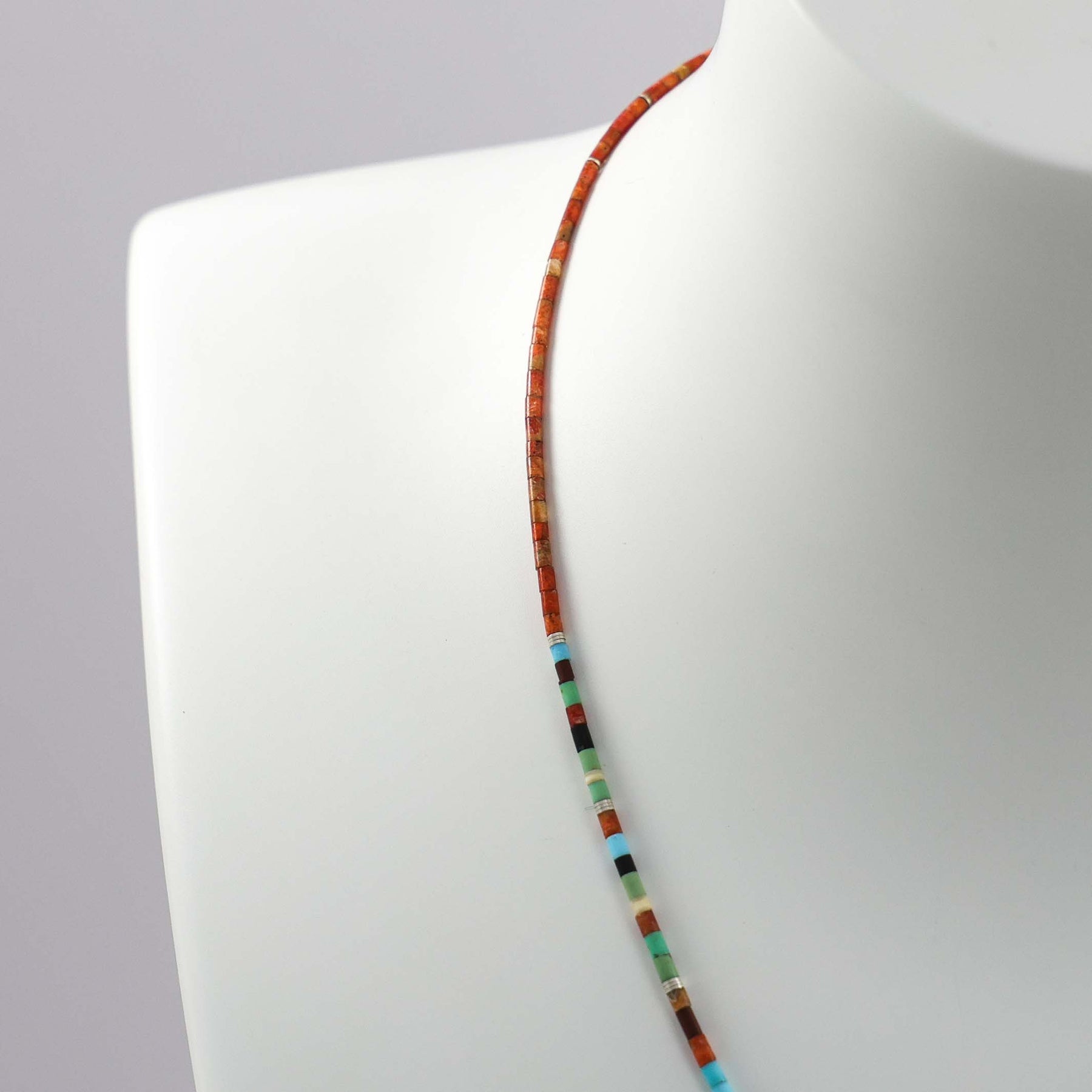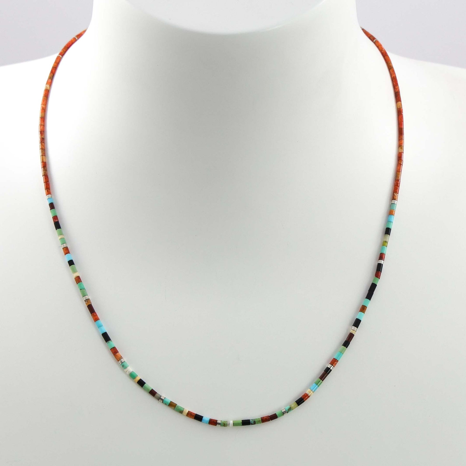Single Strand Necklace with Fine Multi-Stone Heishi Beads, including Apple Coral, Turquoise, Jet, Serpentine, Clam Shell, and Sterling Silver Beads.