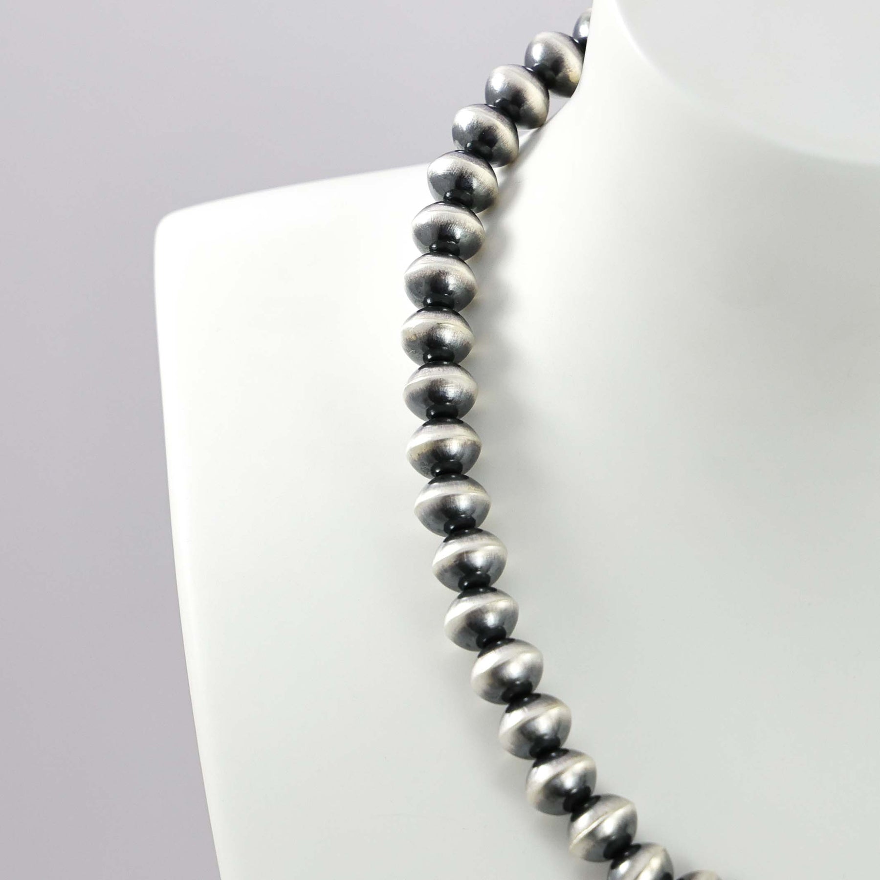 Sterling Silver Navajo Pearl Necklace with Handmade Beads in an Oxidized Finish.