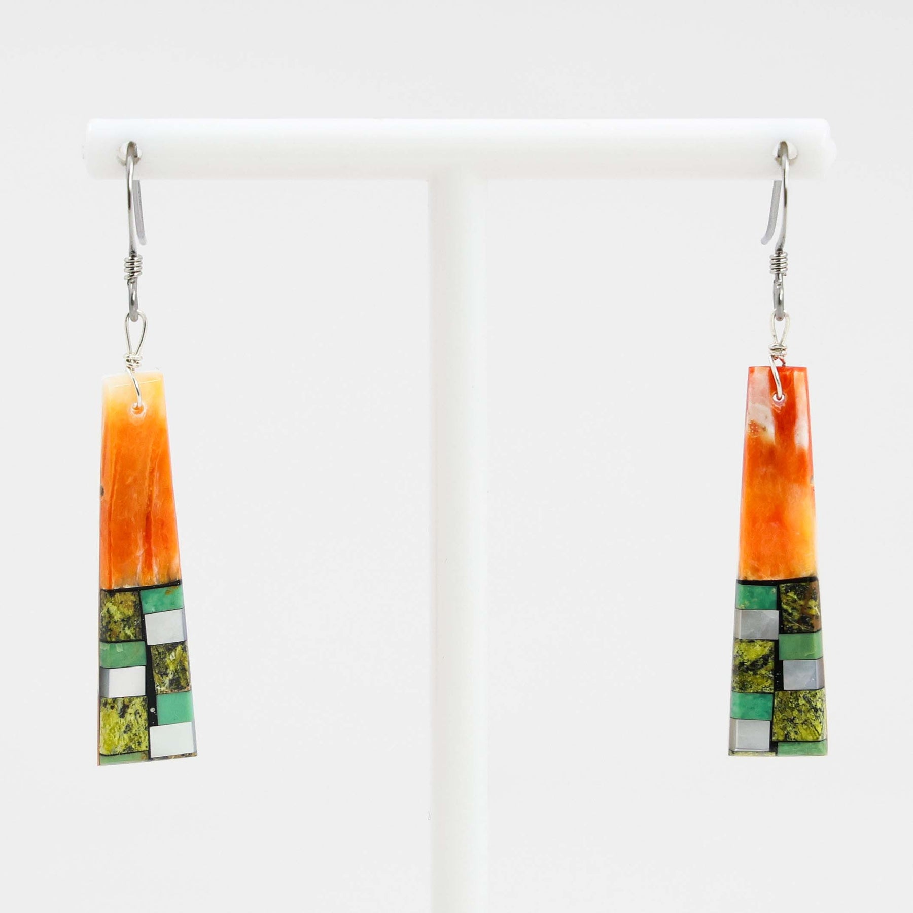 Sterling Silver French Hook Earrings with Inlaid Spiny Oyster Shell, Turquoise, Serpentine, and Mother of Pearl Shell.