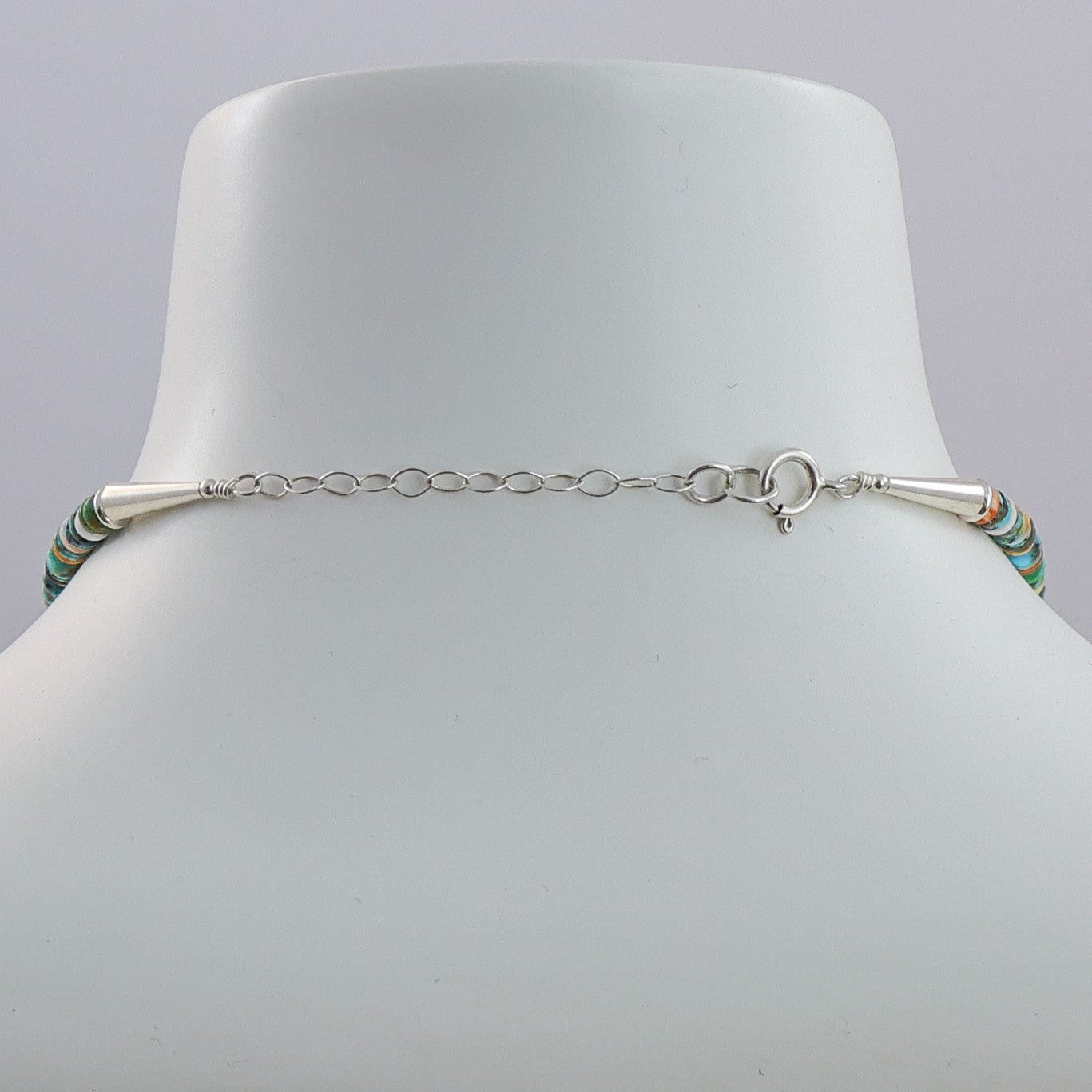 Single Strand Necklace with Hand Rolled Beads made from Kingman Turquoise and Spiny Oyster Shell and with Sterling Silver Cones, Chain, and Clasps.