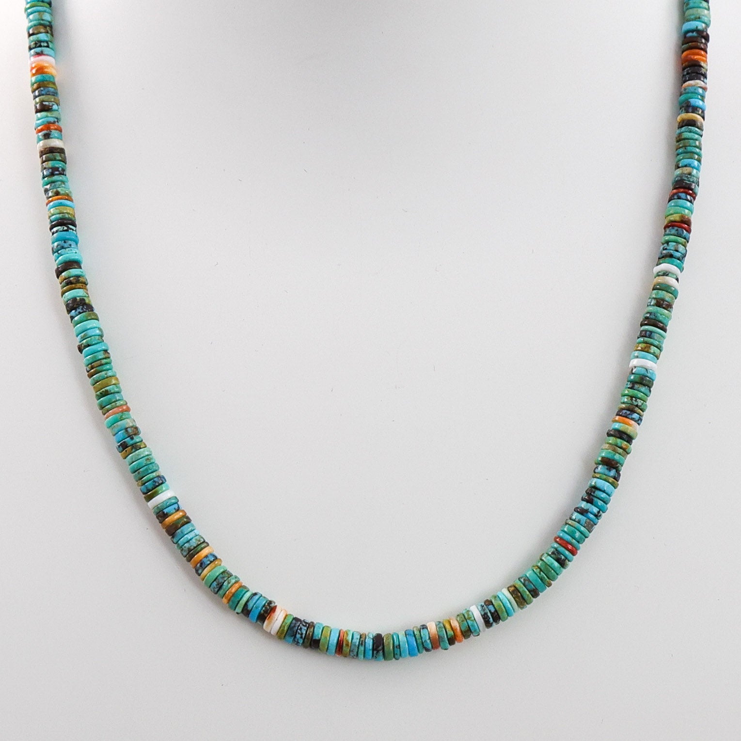 Single Strand Necklace with Hand Rolled Beads made from Kingman Turquoise and Spiny Oyster Shell and with Sterling Silver Cones, Chain, and Clasps.