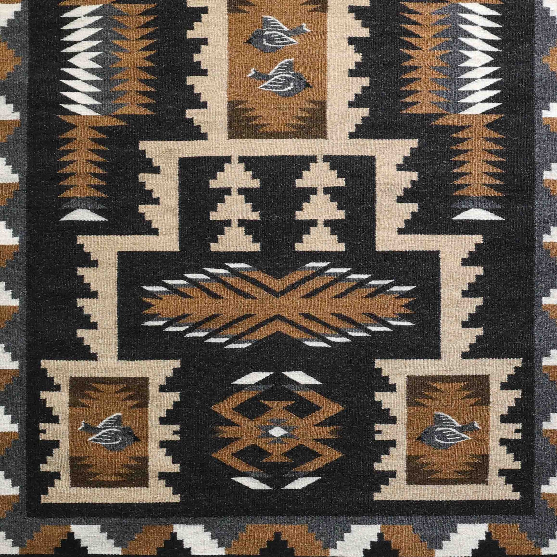 Handwoven Navajo Storm Pattern weaving with bird motifs at the center and in the four corners, framed by a ribbon-style border. Woven in a rich palette of black, brown, gray, and cream, this piece features the tight, precise weaving Sarah Tisi is known for.