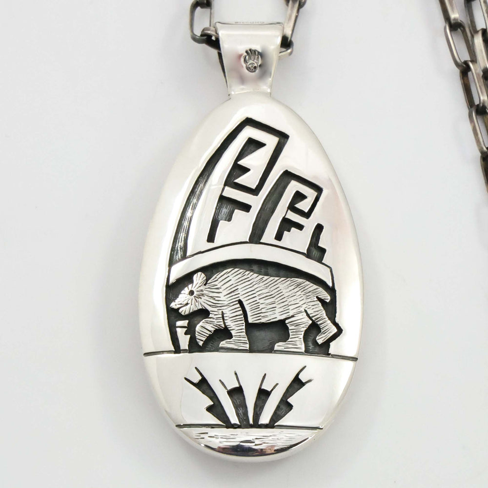 Sterling silver overlay cuff bracelet by Hopi artist Raymie Namingha, featuring a bold water design flowing around the band and centered with a finely cut corn stalk symbol. The squared spiral motifs represent flowing water, while the corn plant signifies growth, blessing, and spiritual sustenance. Namingha’s precise overlay work shows textured, hand-cut background fields and clean, highly polished upper layers that create crisp contrast and depth. A classic Hopi design rendered with balance and clarity.