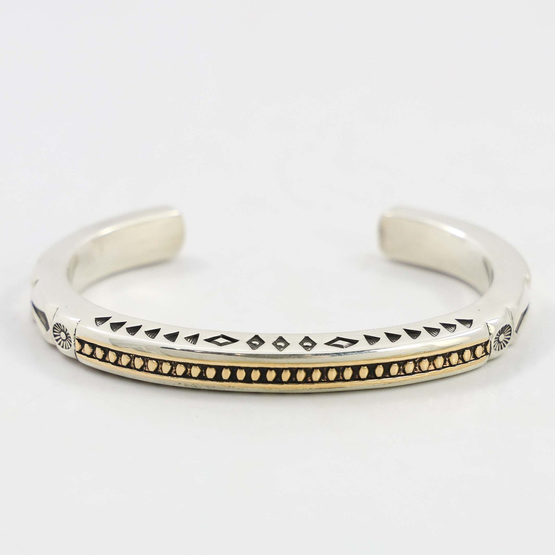 Sterling Silver and 14k Gold Cuff Bracelet with Hand-Stamped and Filed Designs.