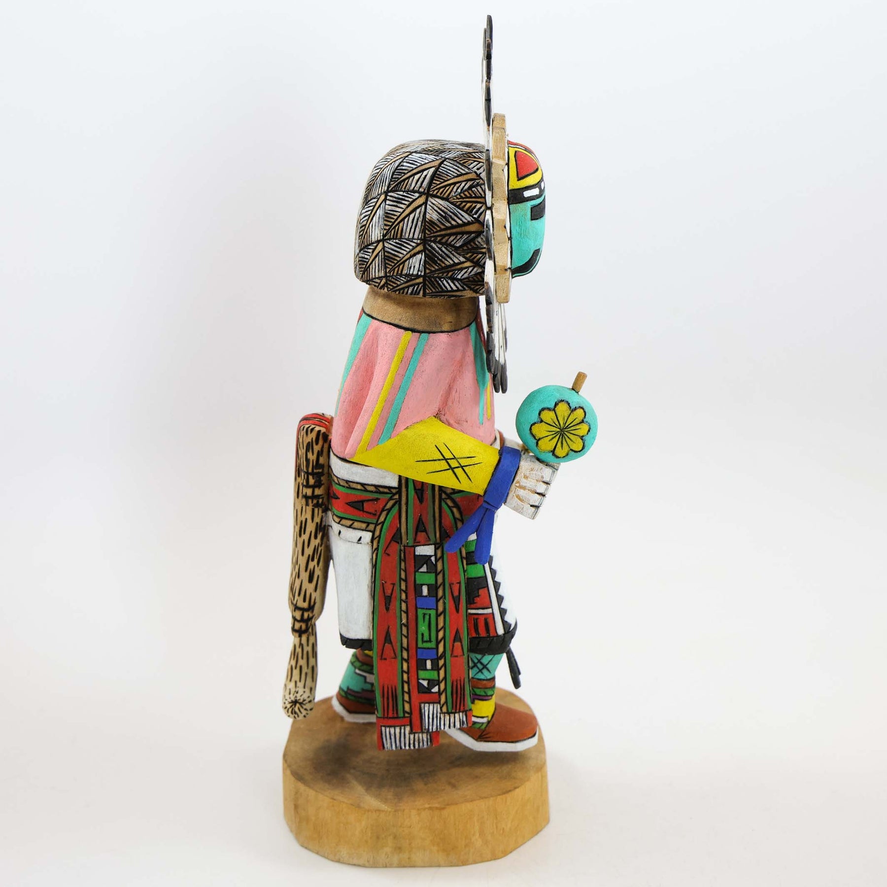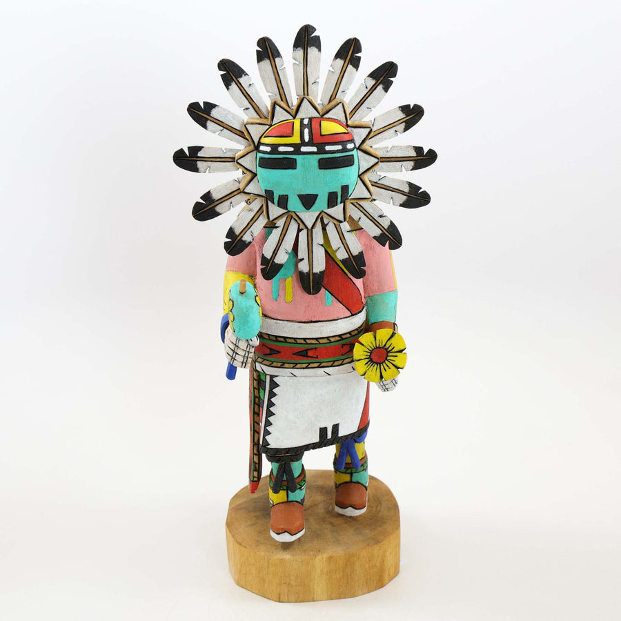 Hand-Carved and Painted Hopi Sunface (Dawa) Kachina Holding a Rattle and Flower.
