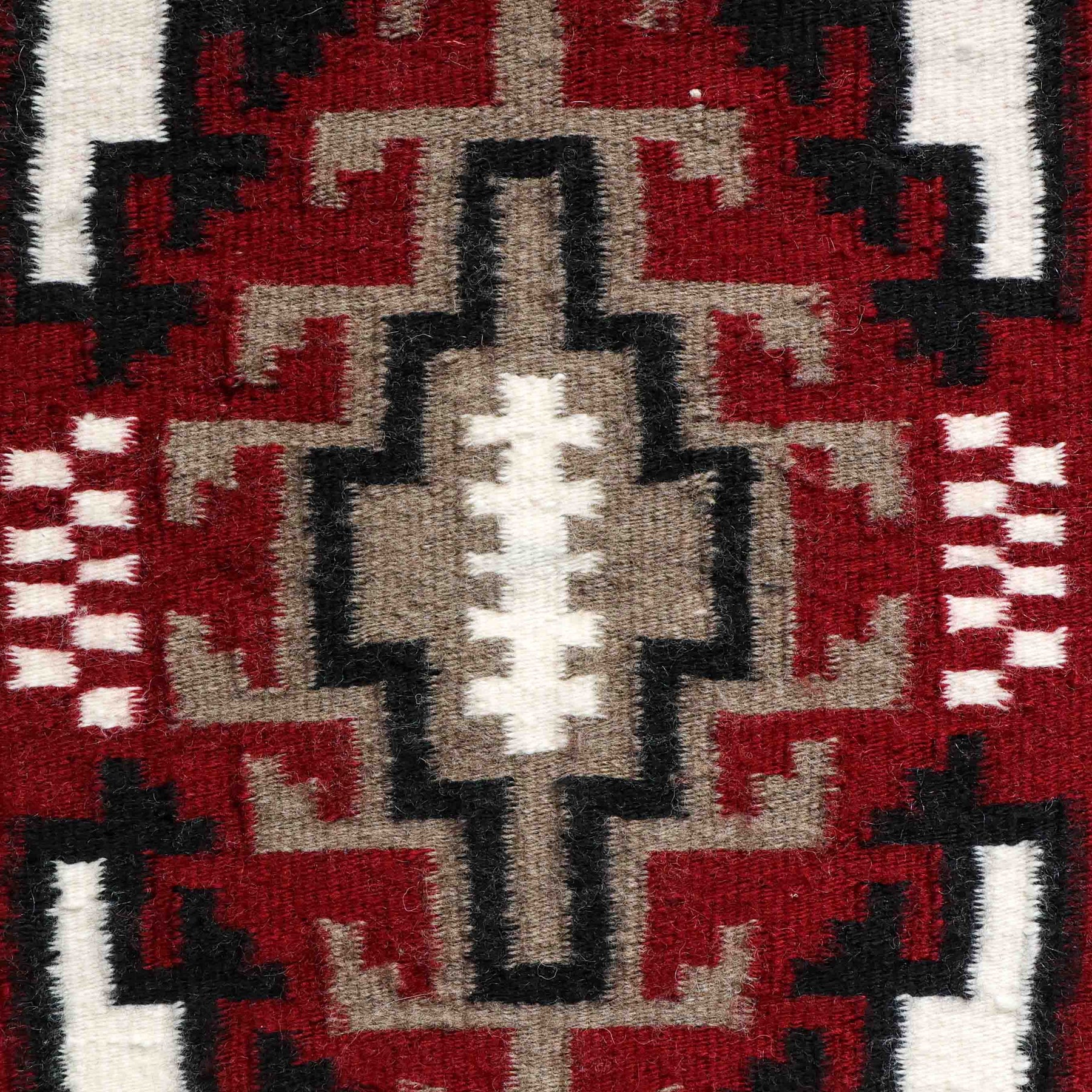 Small Handwoven Navajo Ganado Red weaving by Angelina Yazzie featuring a classic Ganado-style layout with a deep red field, stepped black and beige geometric forms, and strong white corner elements.
